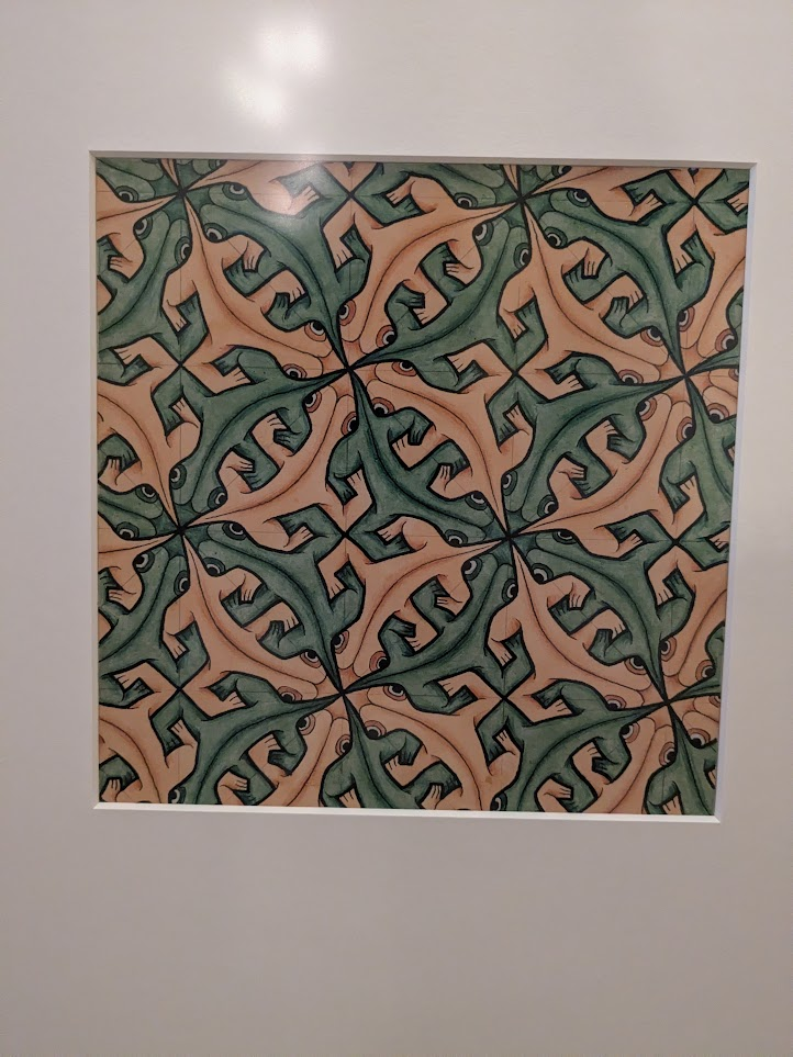I had of course seen the tessellations he’s famous for like the one above, but I hadn’t before seen the one below, where none of the shapes are repeated: