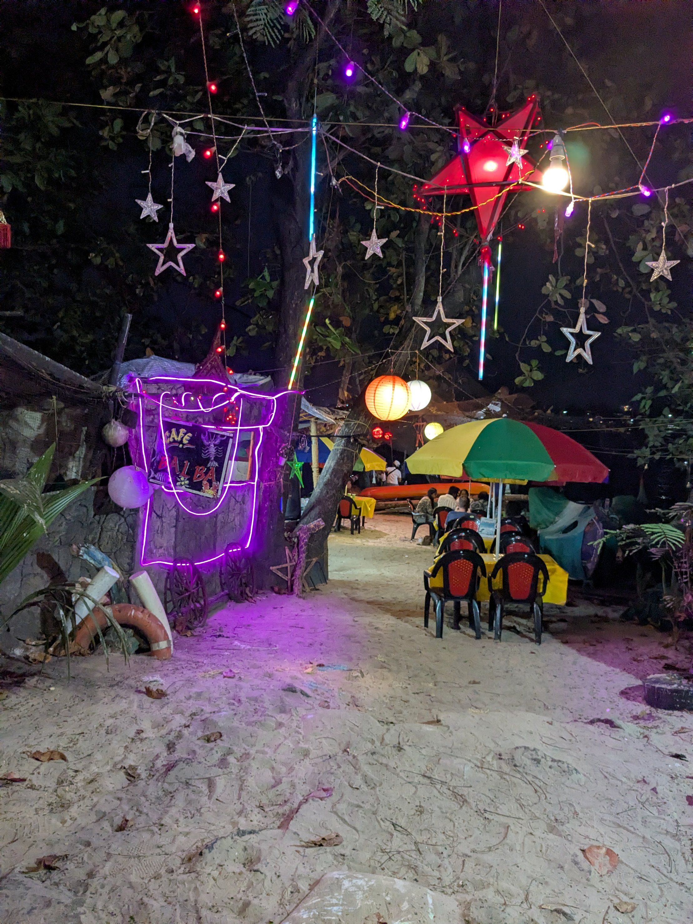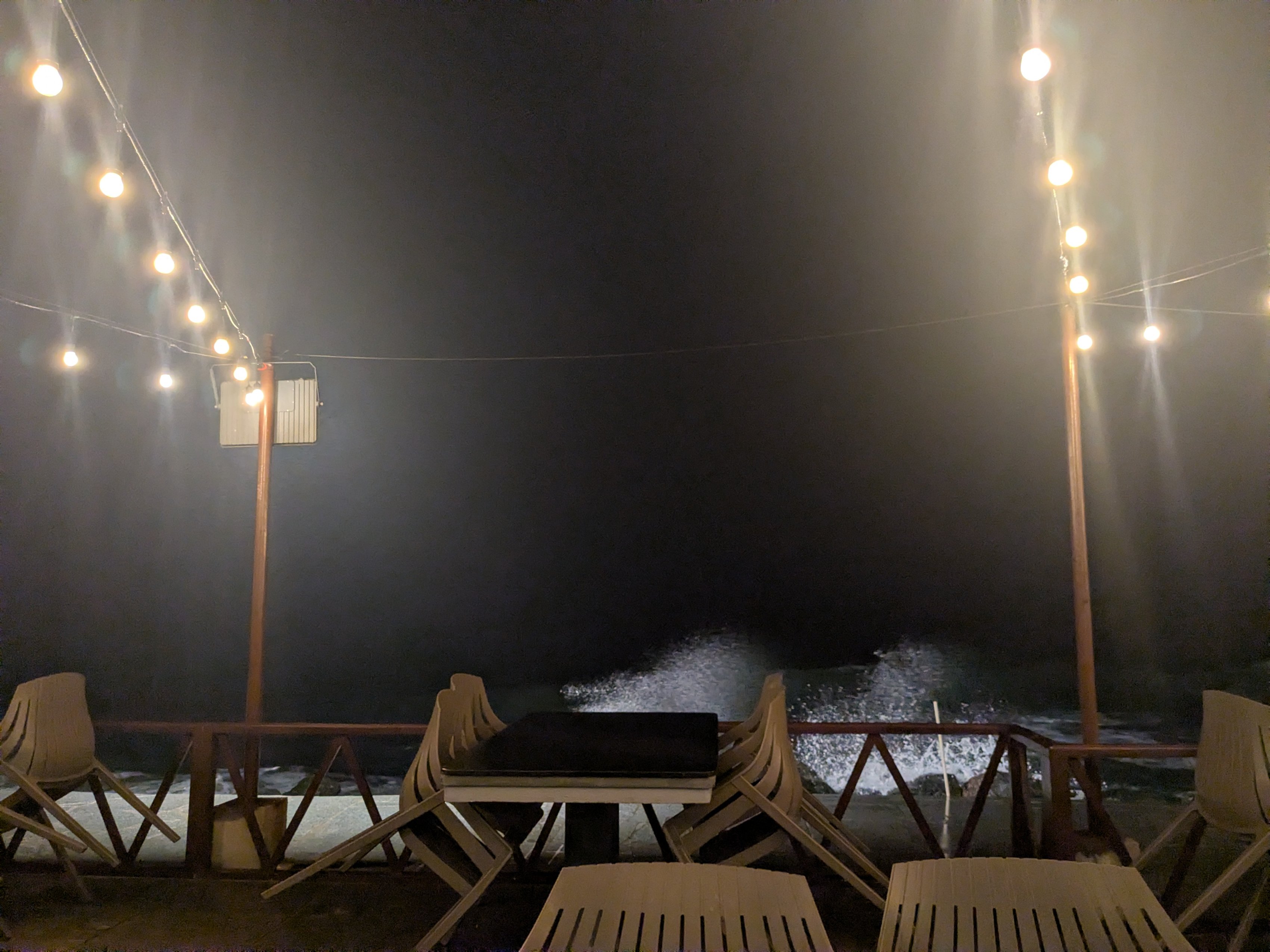 The restaurant porch was right on the water, and they had these lights just facing out into the darkness of the Indian ocean… very ominous. When big waves hit, the water would splash up onto the closer edge of the porch: