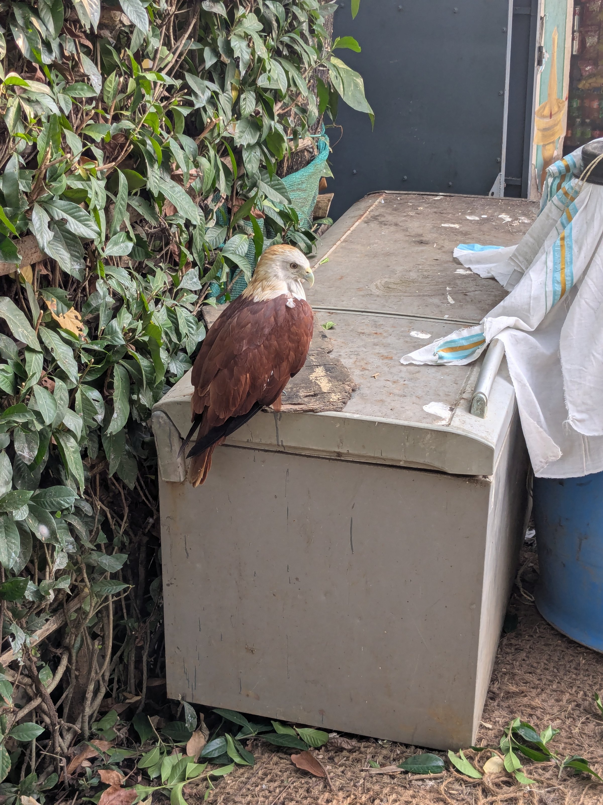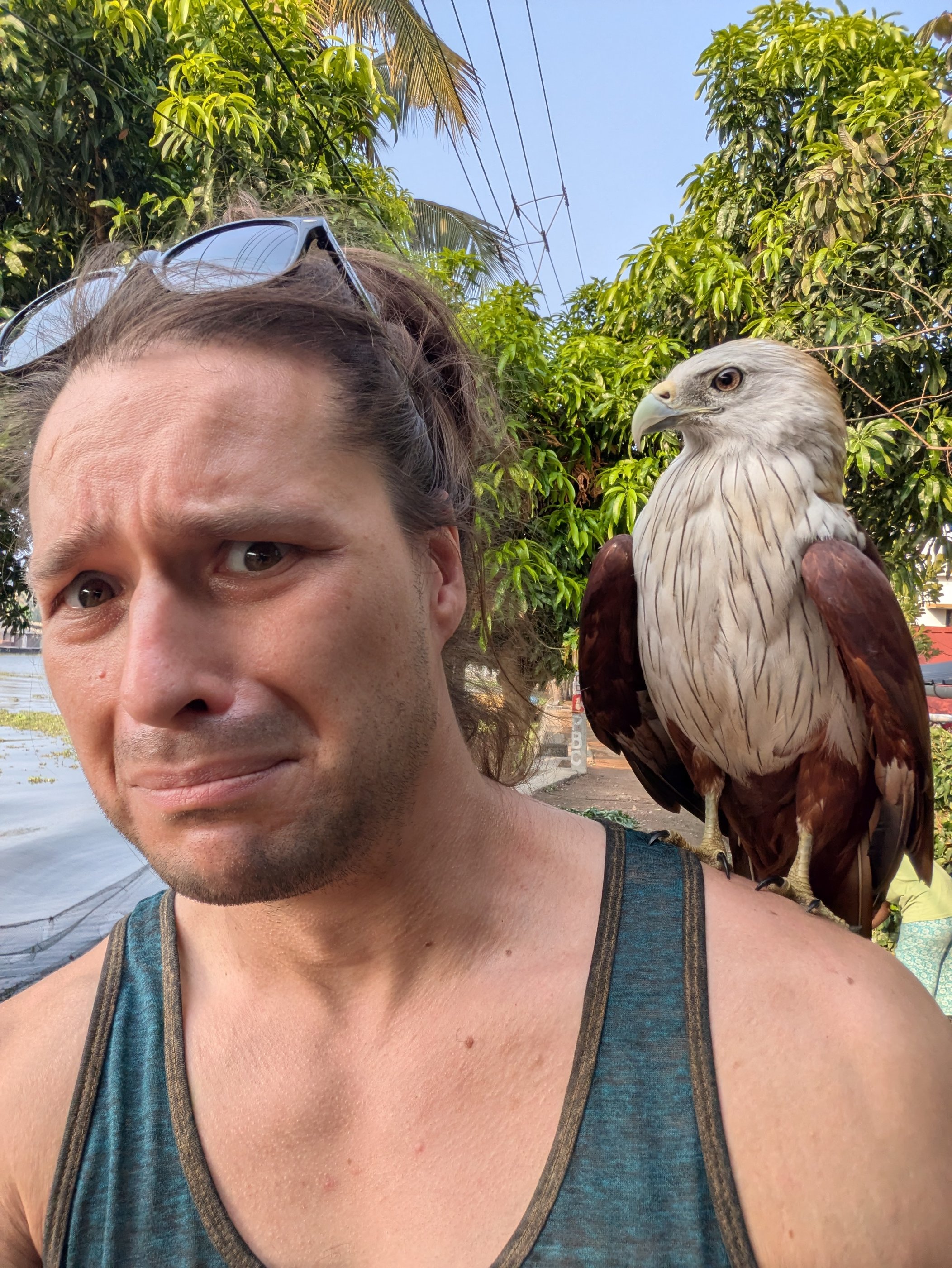 Just kidding. It’s apparently the guy’s pet or something. He casually grabbed it and plopped it on my shoulder! I’ll admit I was a bit fearful of those spiky claws. I looked it up later, and it’s probably a type of Brahminy Kite.