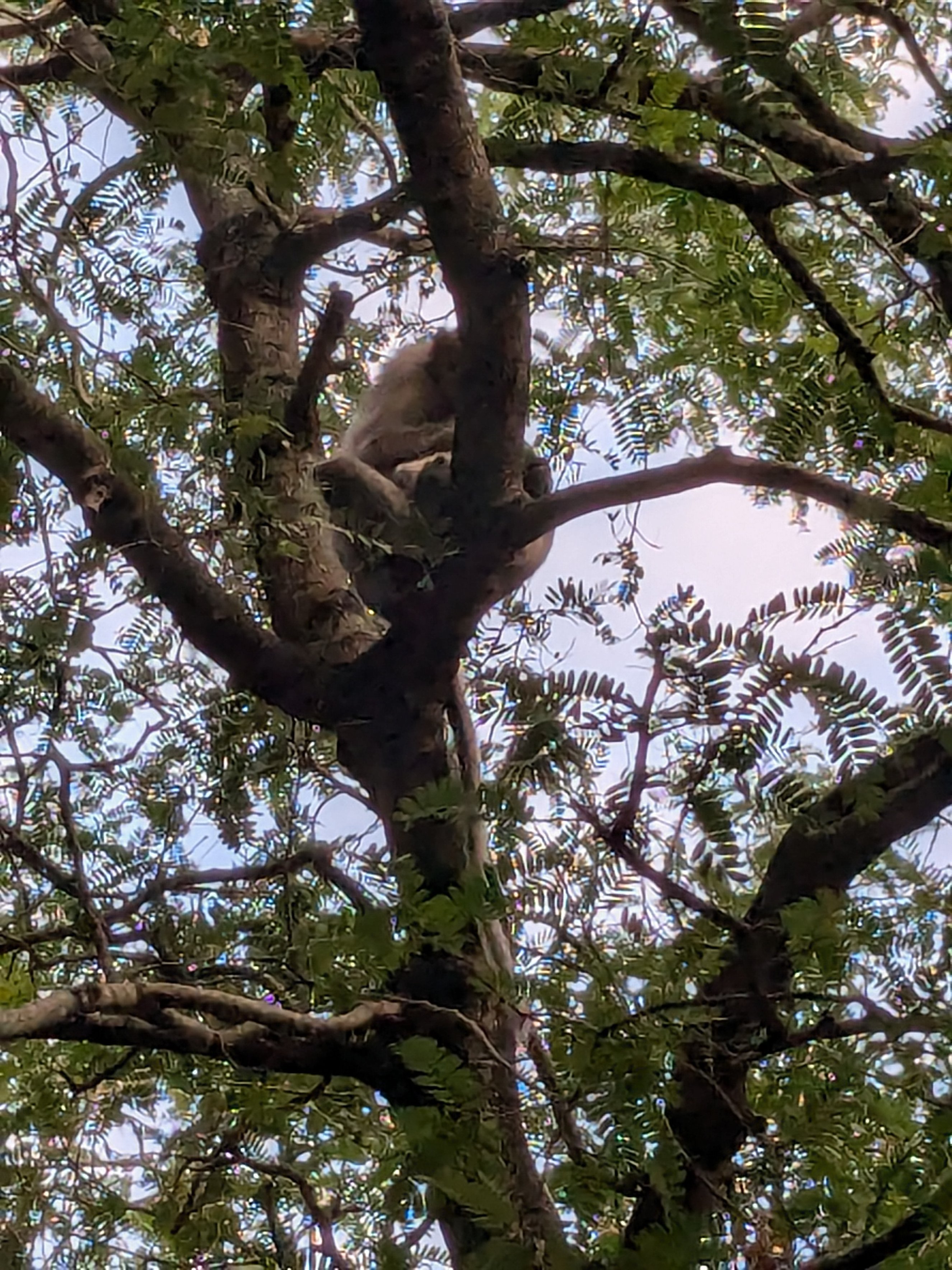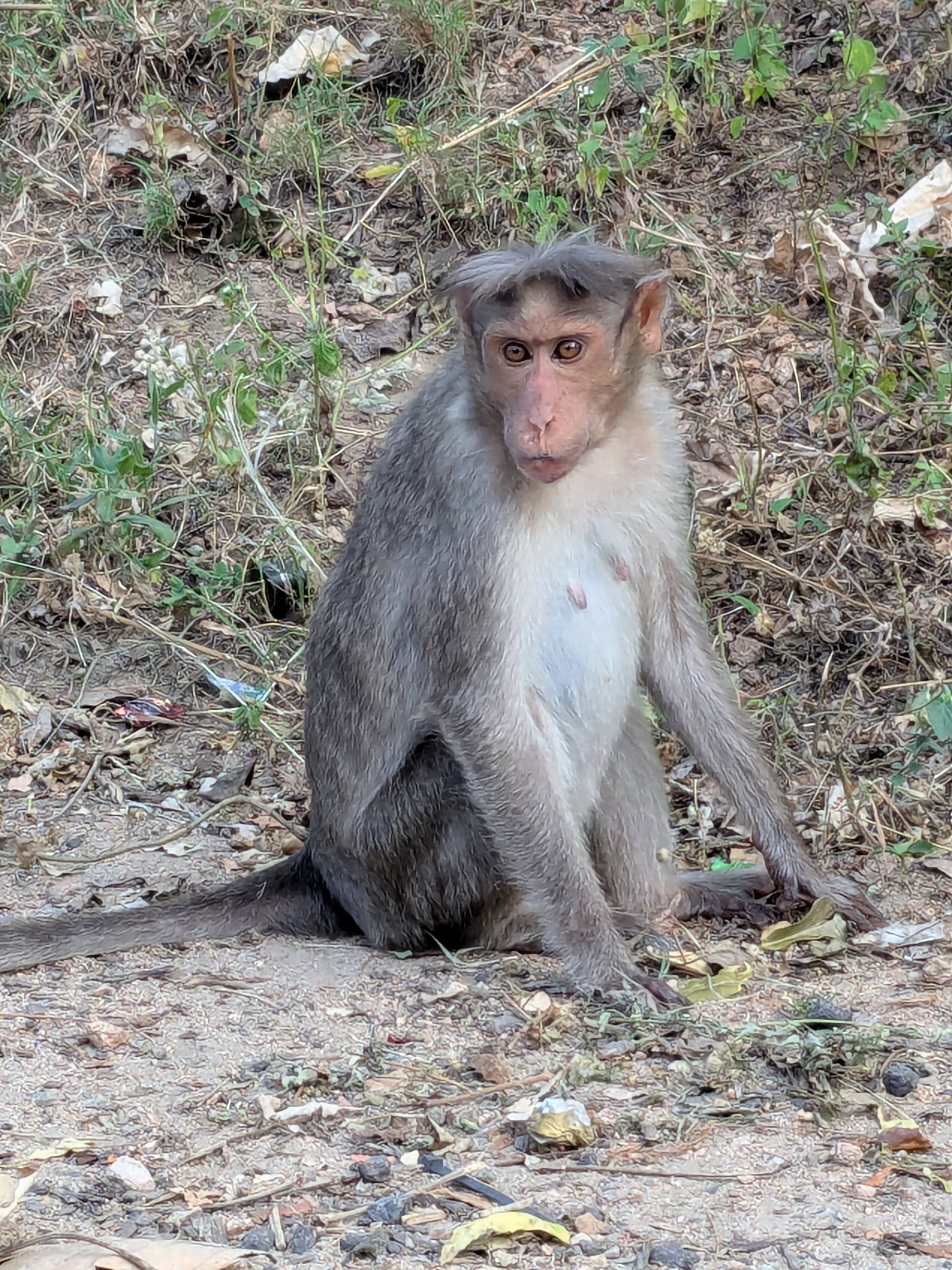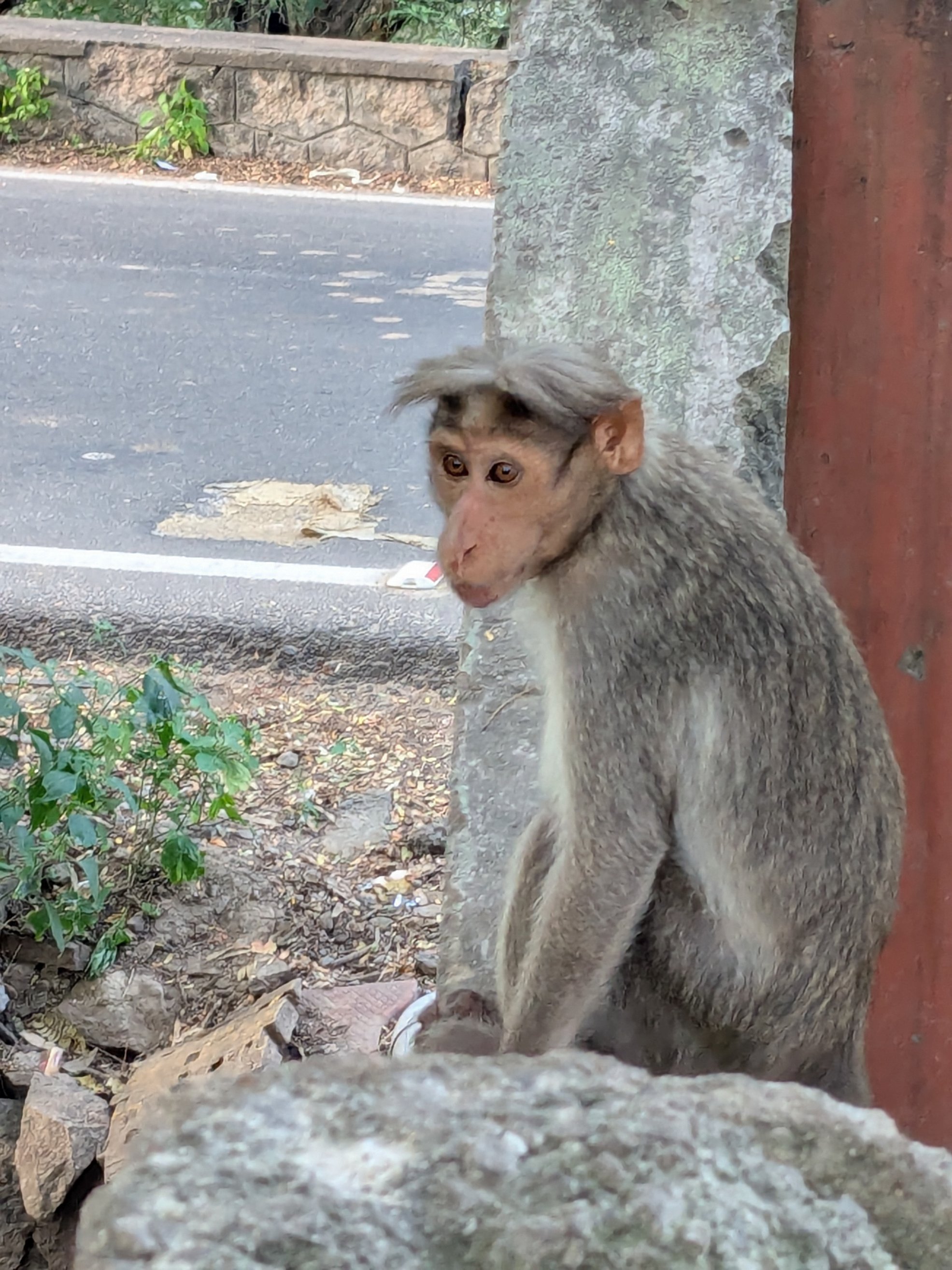 Well, now I was invested! I grabbed a handful of pebbles and started throwing too. I think I have a better arm than him, cause after a couple close shots, I think the monkey was distracted enough to drop the jaggery.