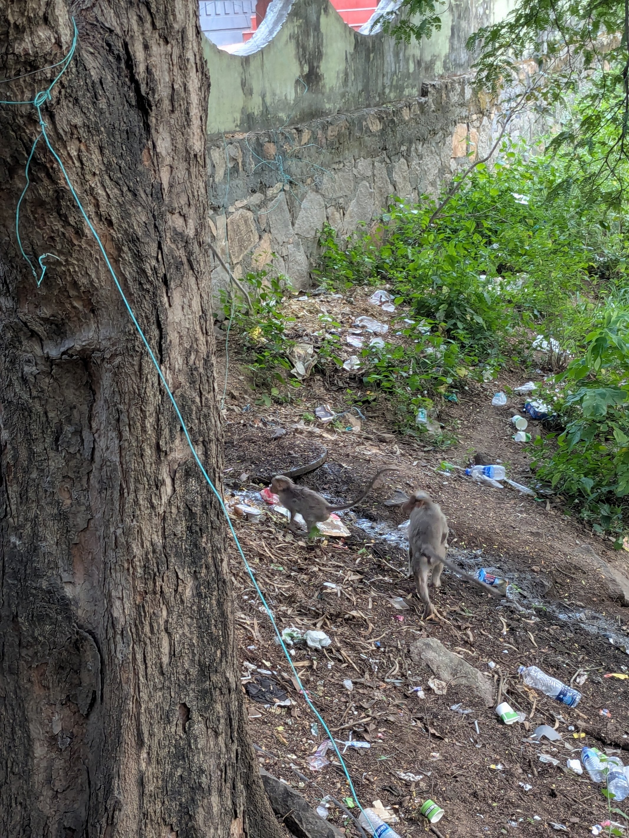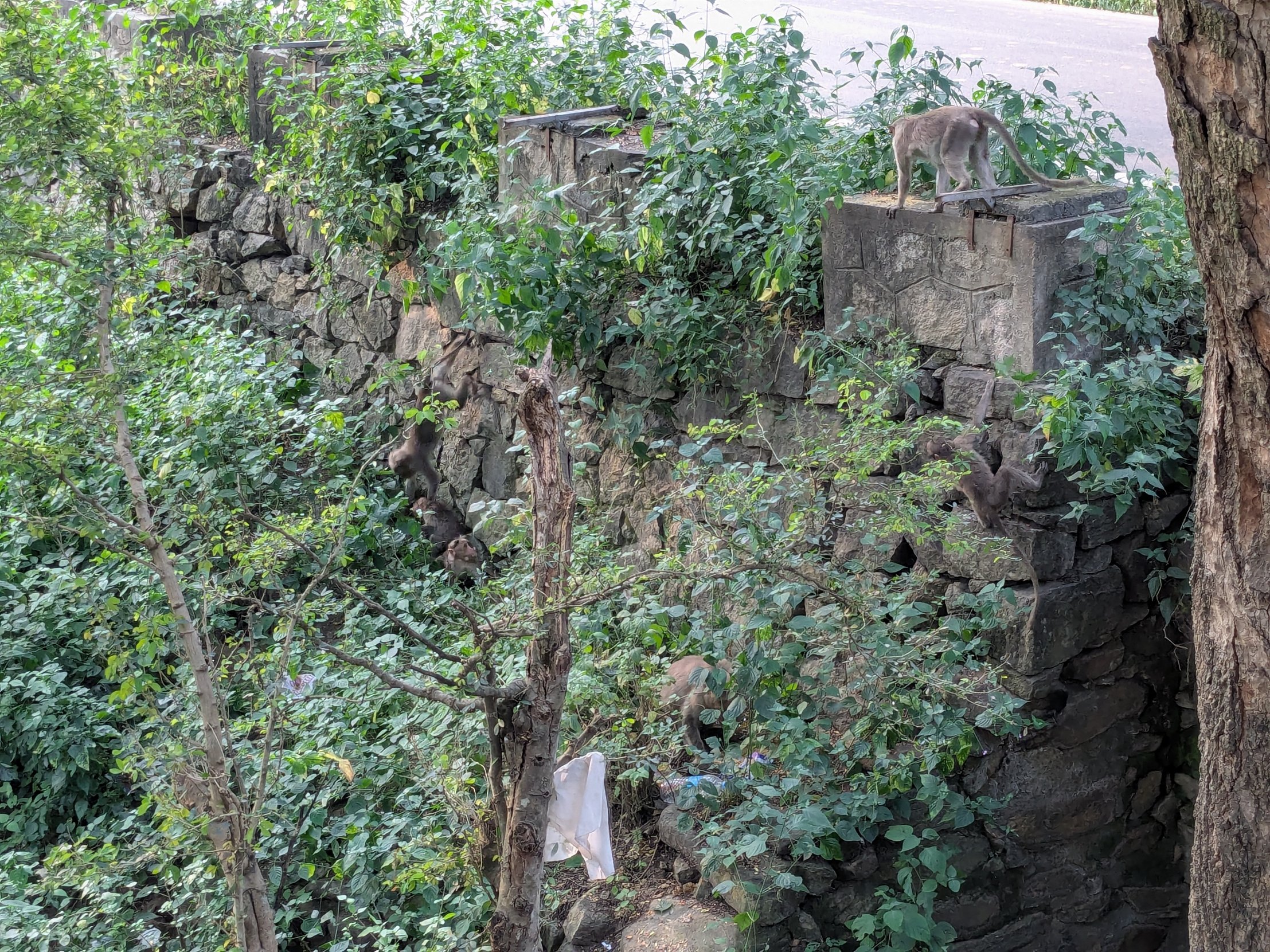 Unfortunately, since that branch you see was ~30 feet high, the jar fell and hit the stone wall you can see below, and absolutely exploded everywhere. Suddenly, rather than one monkey having his fill, there were about a dozen swarming it. At this point I was laughing so hard I was nearly crying, while he was still angrily cursing at the monkeys.
