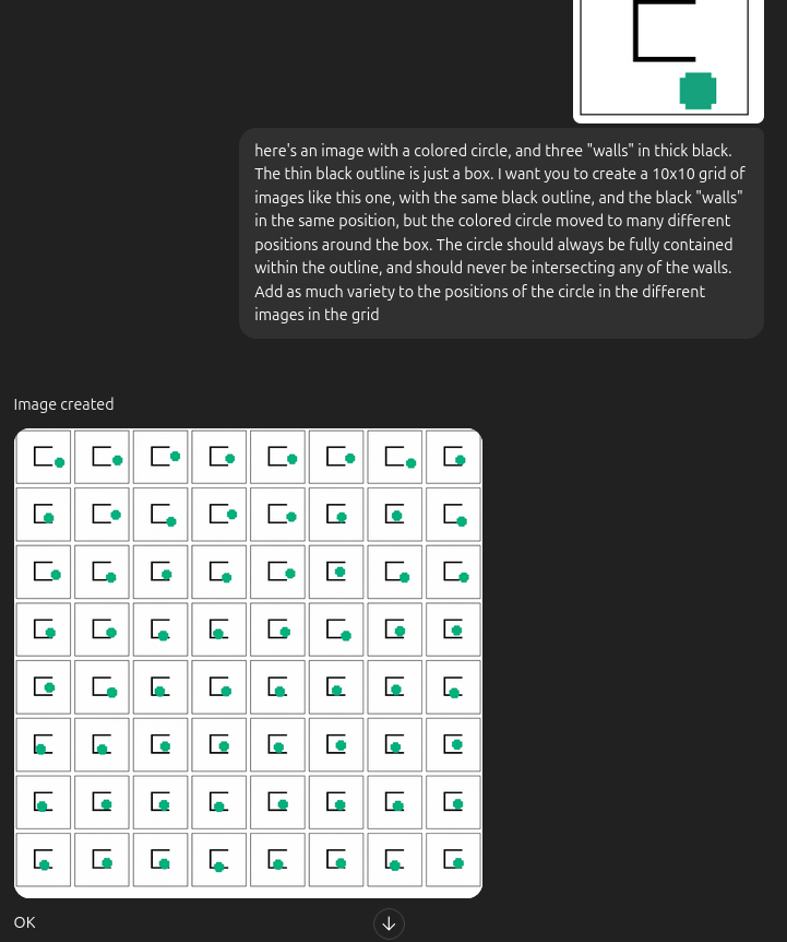 You can see that for all of them, the walls are in the correct place and the circle is the correct color. And, many of them are basically plausible states. However… there are also some that are clearly messed up, where it has just placed the circle on top of a wall.