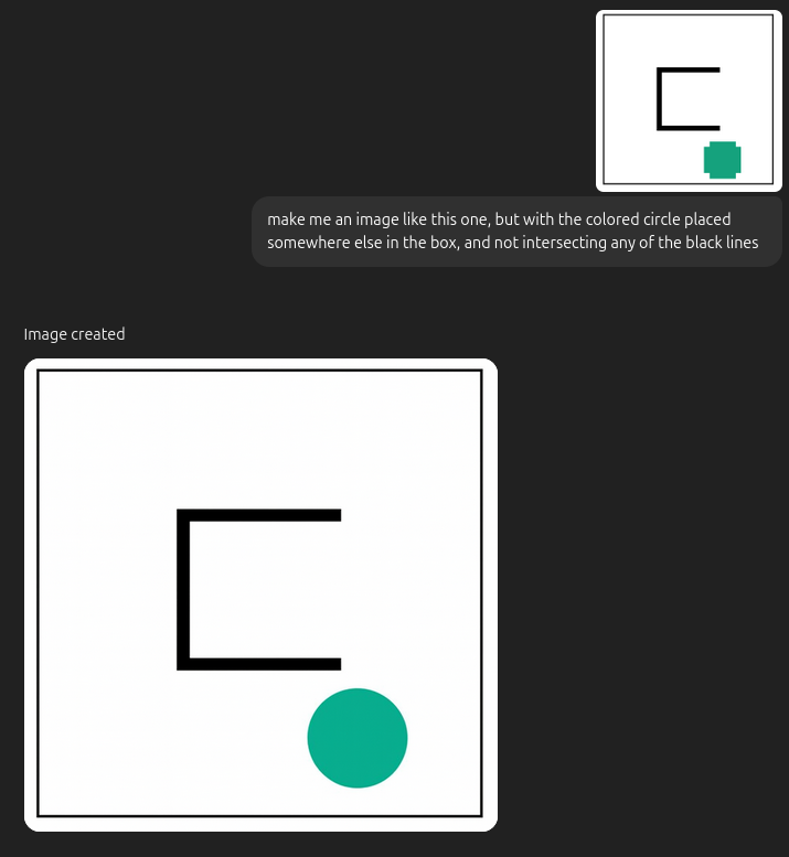 That said… diffusion and Visual Autoregressive models and all the fancy new toys are really good at things like inpainting, modifying images, etc, which is kind of what this is doing, in this simple case at least. Out of curiosity, I tried to see if GPT-4o could one-shot it: