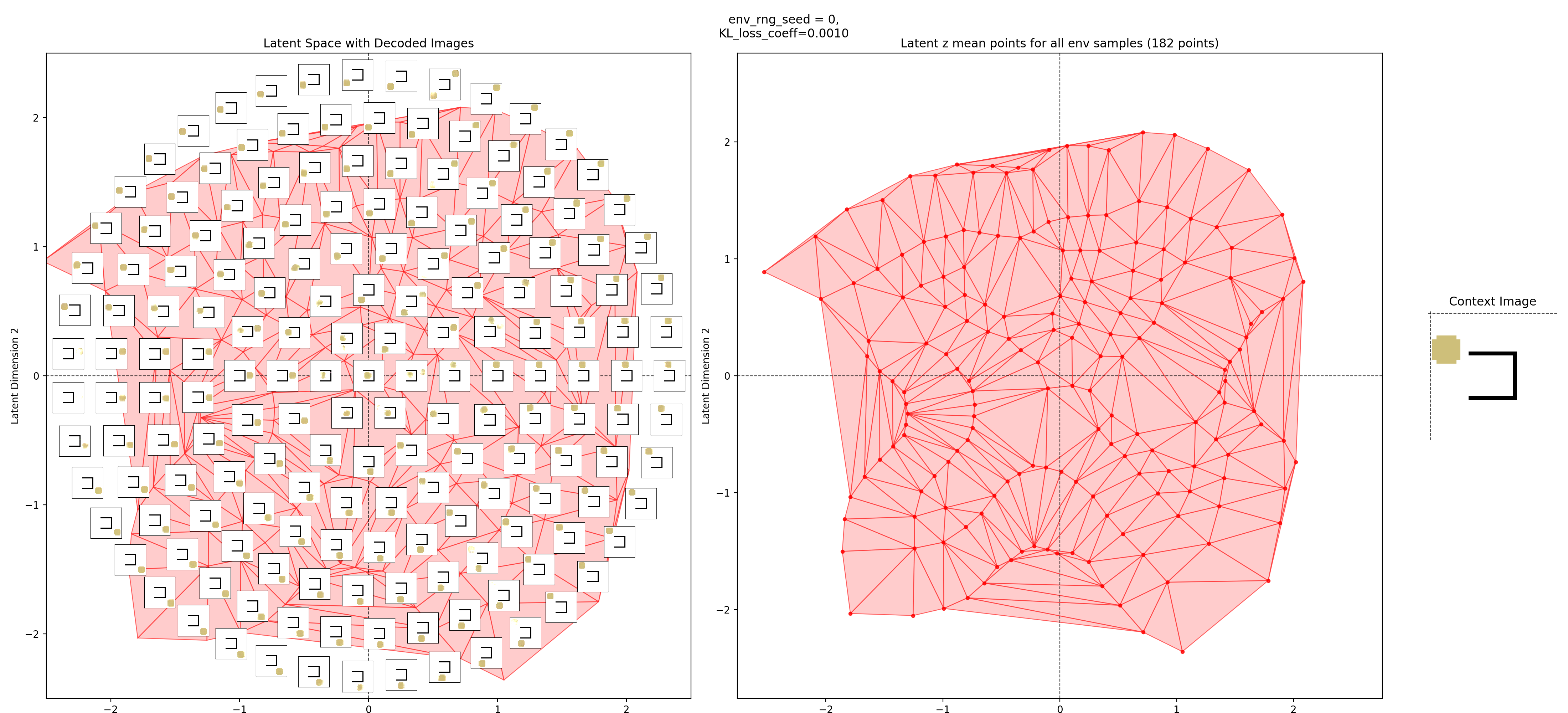 I’m not sure this is wrong, but it did strike me as weird and makes me wonder if I’m doing something wrong. If you look at two of the latent space images above, for the same env but different contexts, you can see that the different latent space locations get decoded to the same images. E.g., for the green circle with two vertical walls env above, $z = (1.5, -2)$ decodes to the circle in the upper left, regardless of where the context circle was.