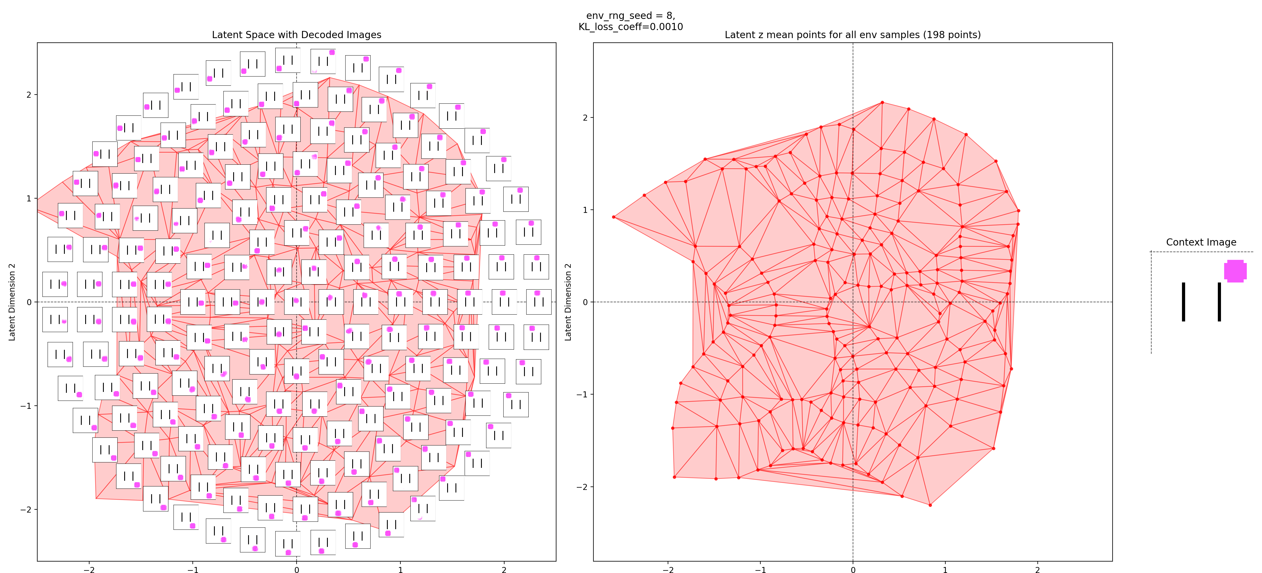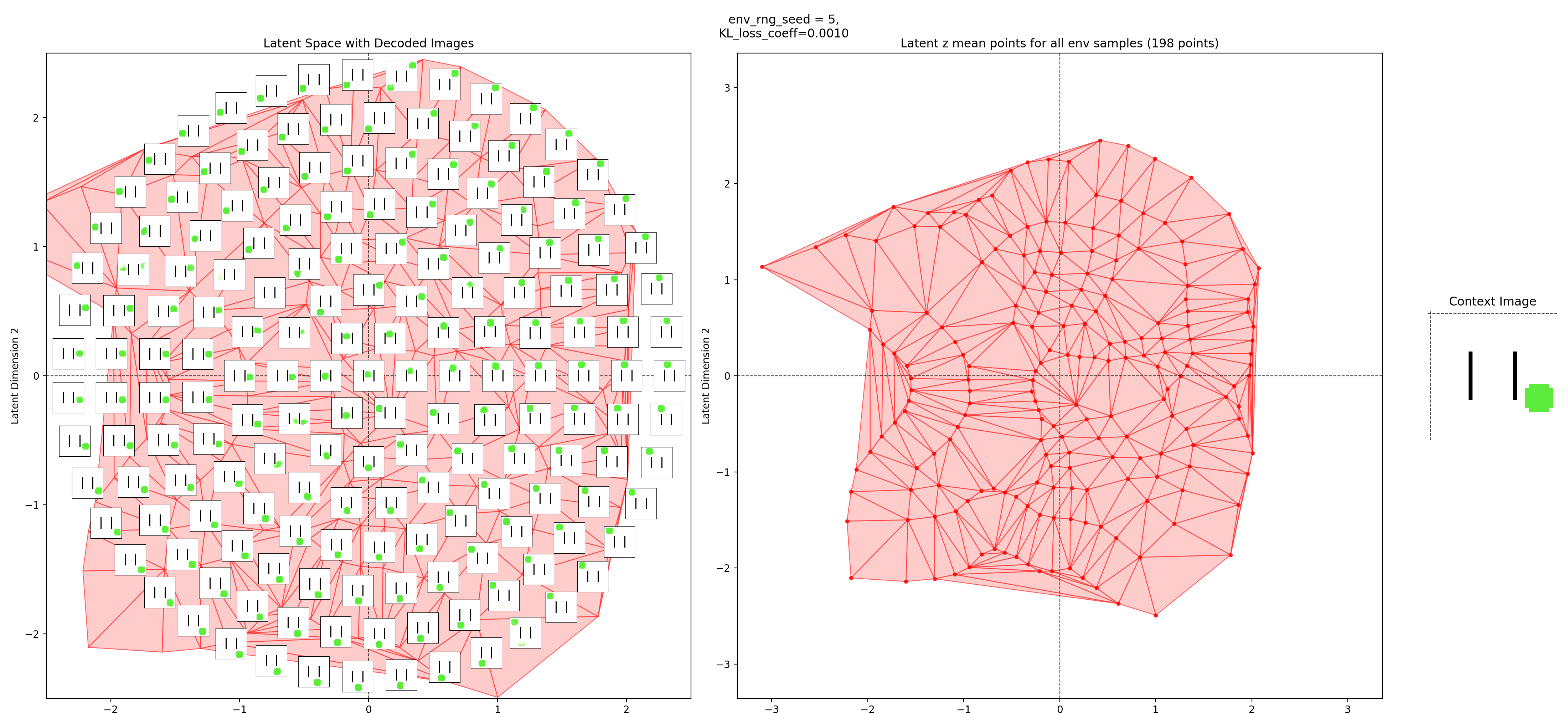In the middle plot, I’ve taken all the real state images for that env and encoded them into the latent space, using the same context. Each red point in that plot is one of the real datapoints (images). Since there aren’t many of them (100-300 usually), I’ve done a Delaunay triangulation with some tidying to better visualize the “area” the encoded real data covers. I’ve then taken this triangulation and plotted it in the background of the left plot.