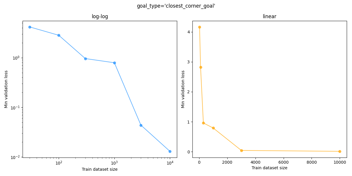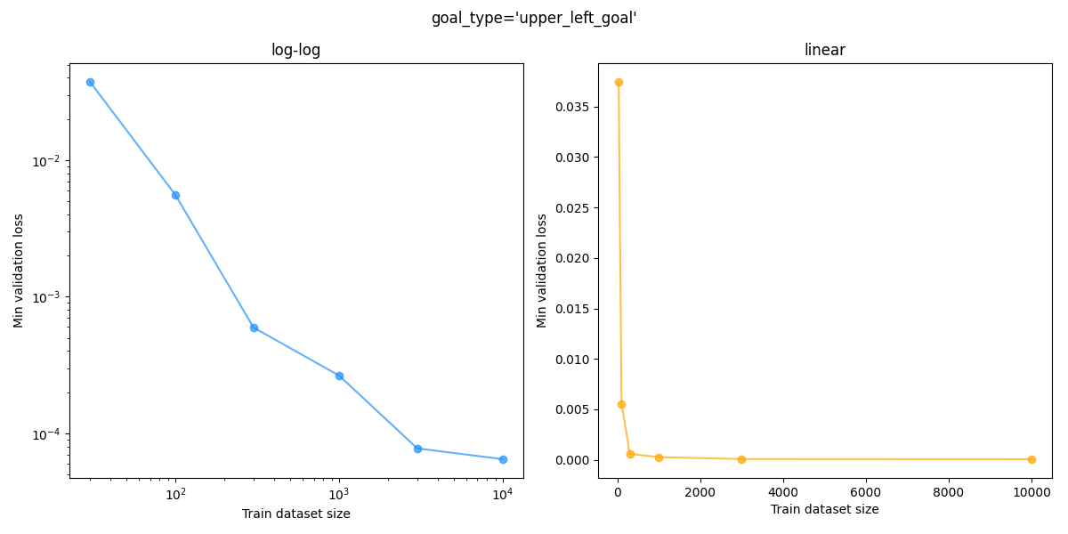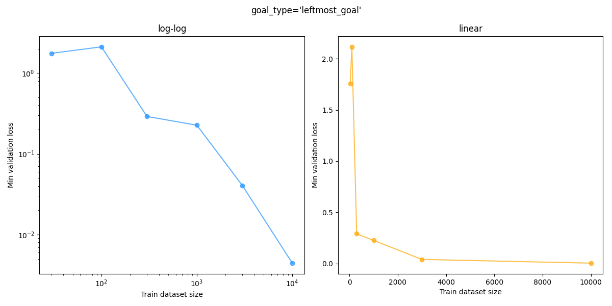 To test this, I took the same CCVAE, and trained the latent goal mapping model with (train) dataset sizes in ${30, 100, 300, 1000, 3000, 10000}$, for each goal type. We can then plot the min validation loss vs dataset size. Here that is for each goal type, where I’ve plotted both a log-log and a linear plot for each: