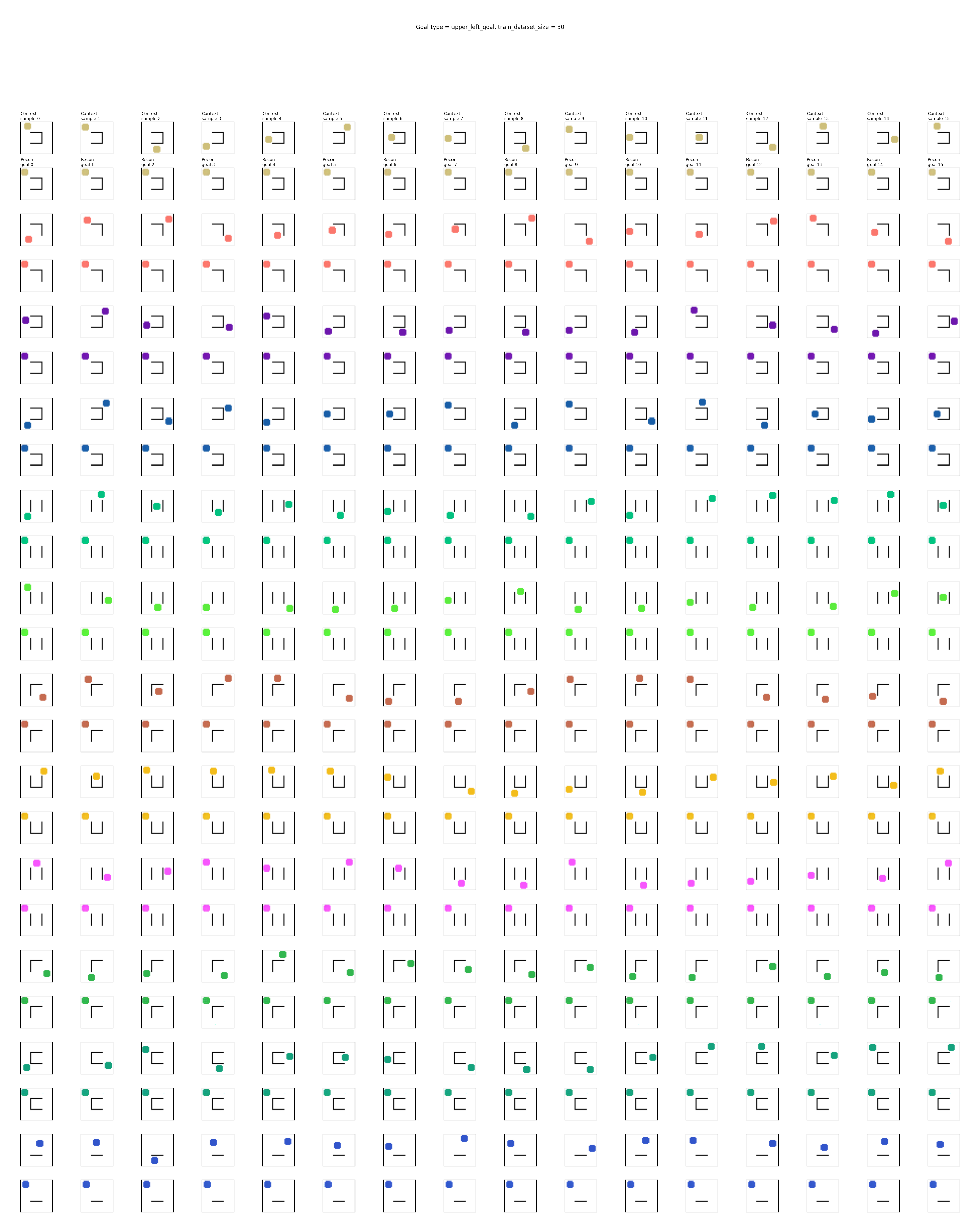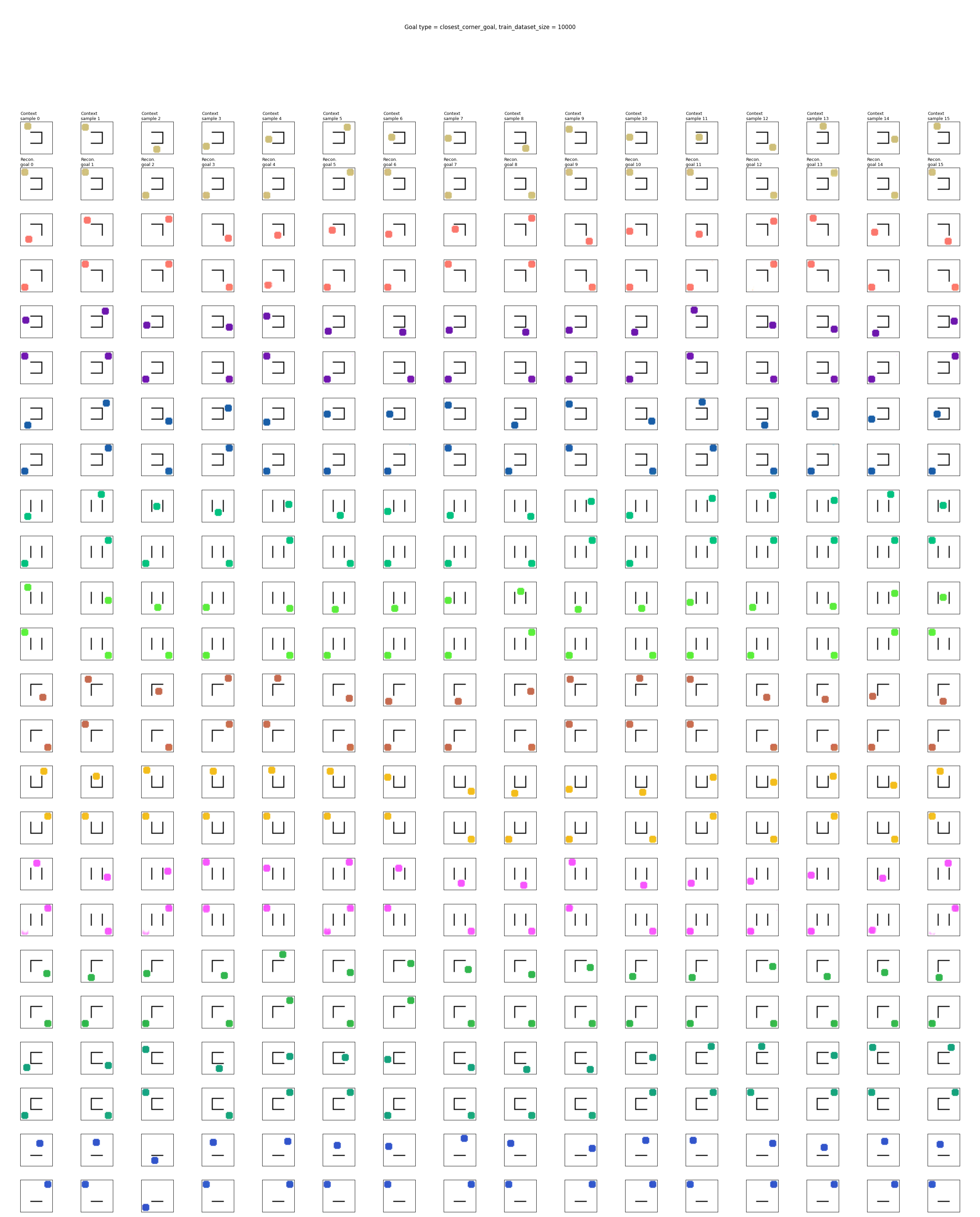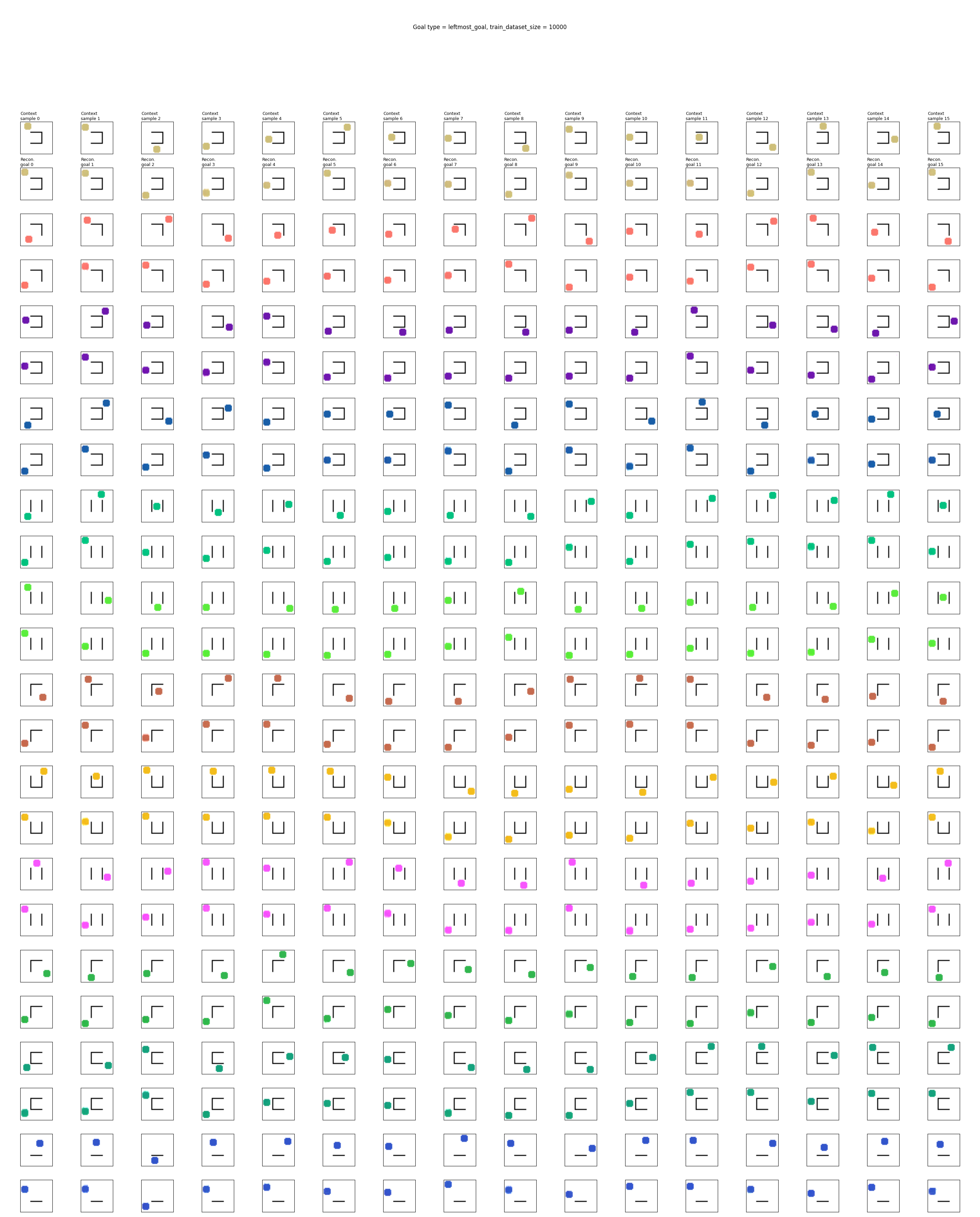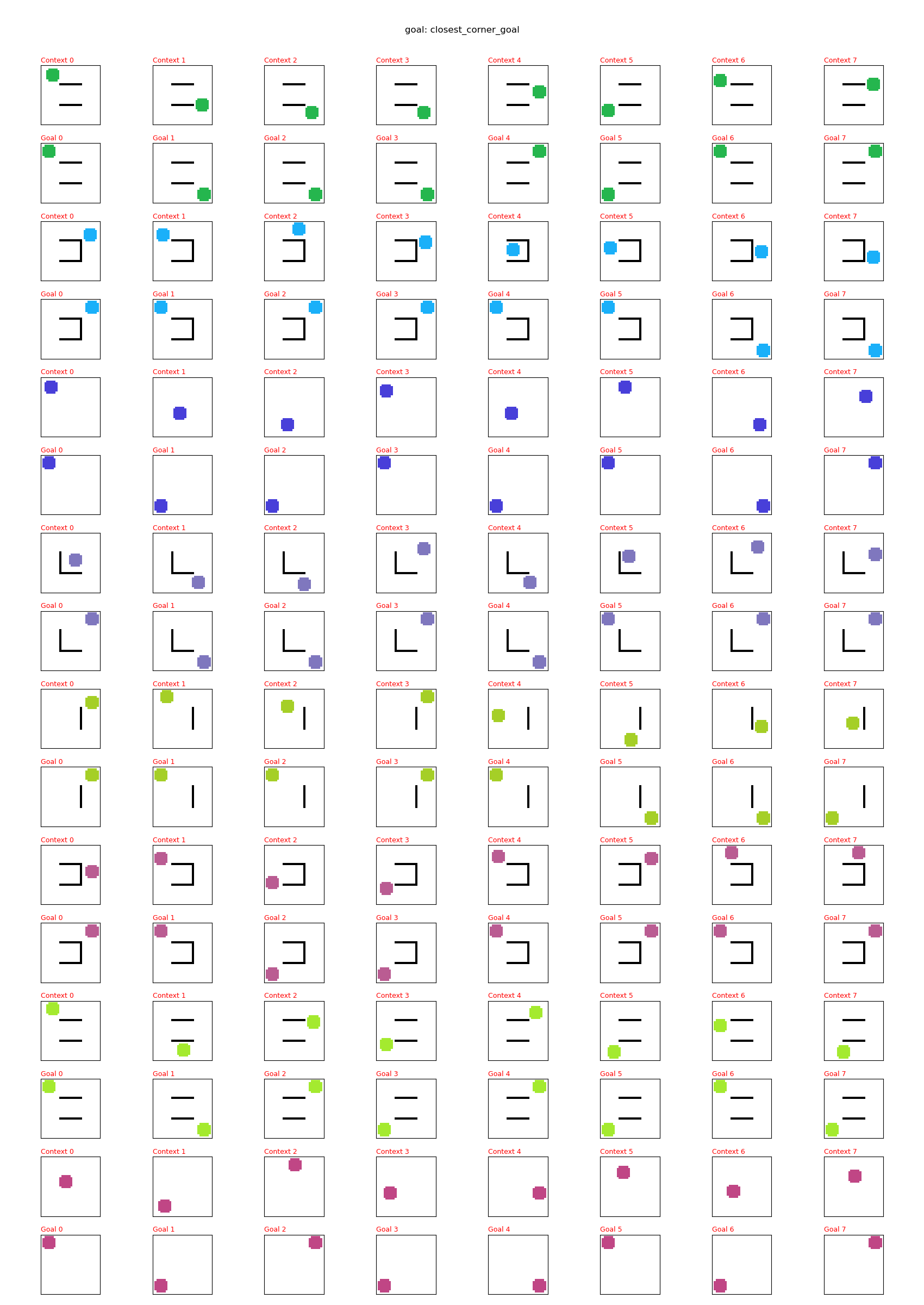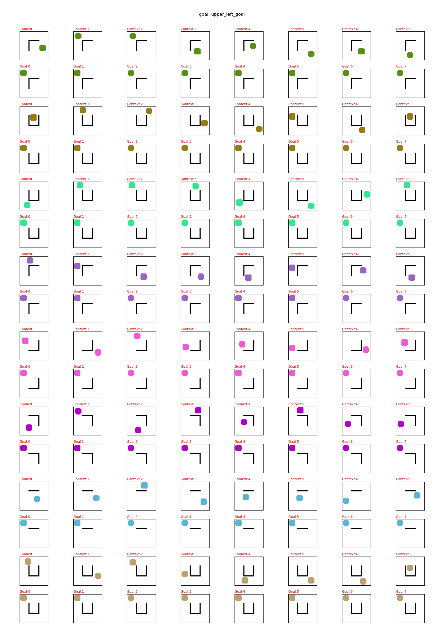 The simplest goal is “circle moving to the upper left corner”. This is obviously very very simple, but note that it still does depend on the context: for the goal, the circle must be the same color, and the walls must be in the same positions (i.e., the same sampled env).