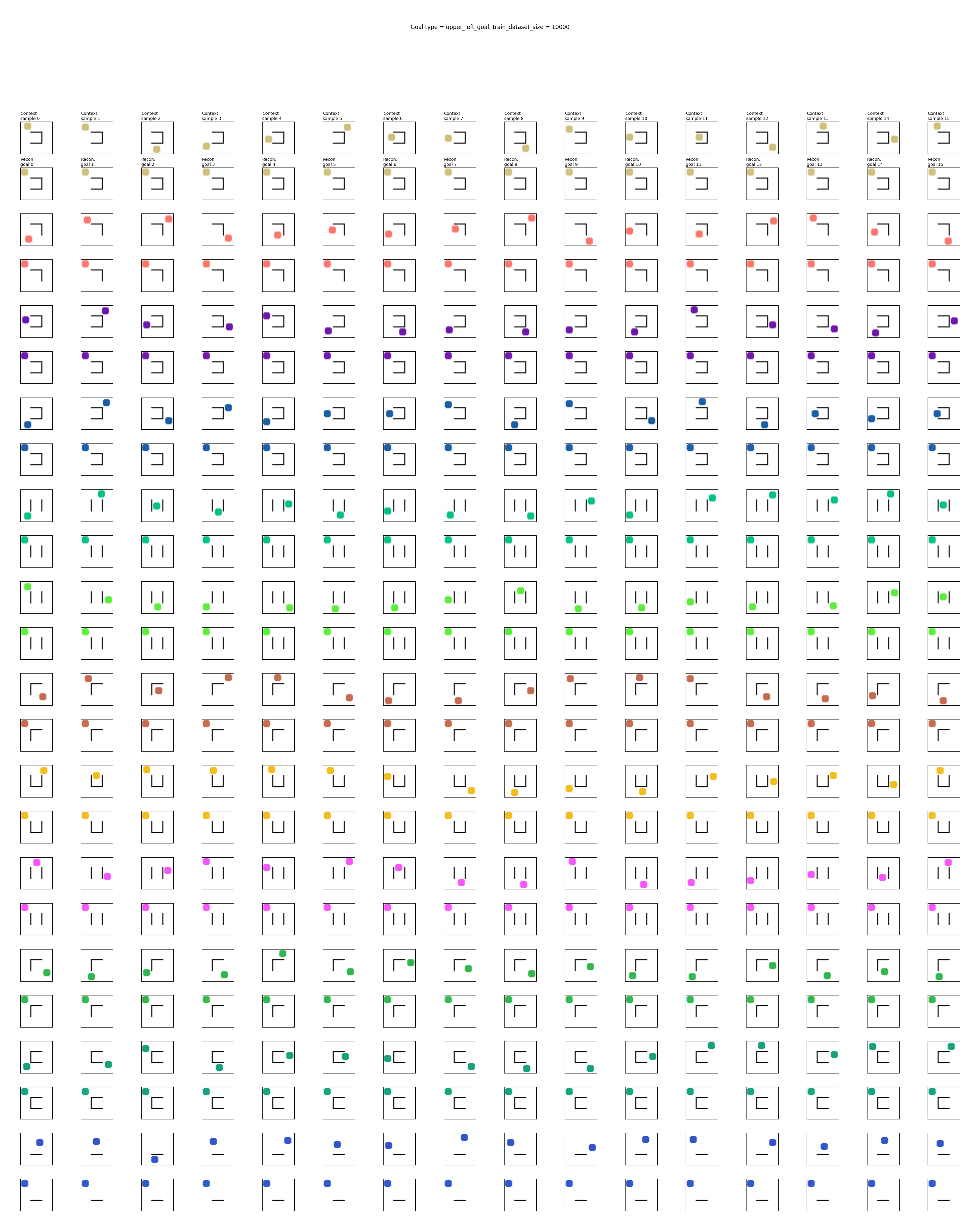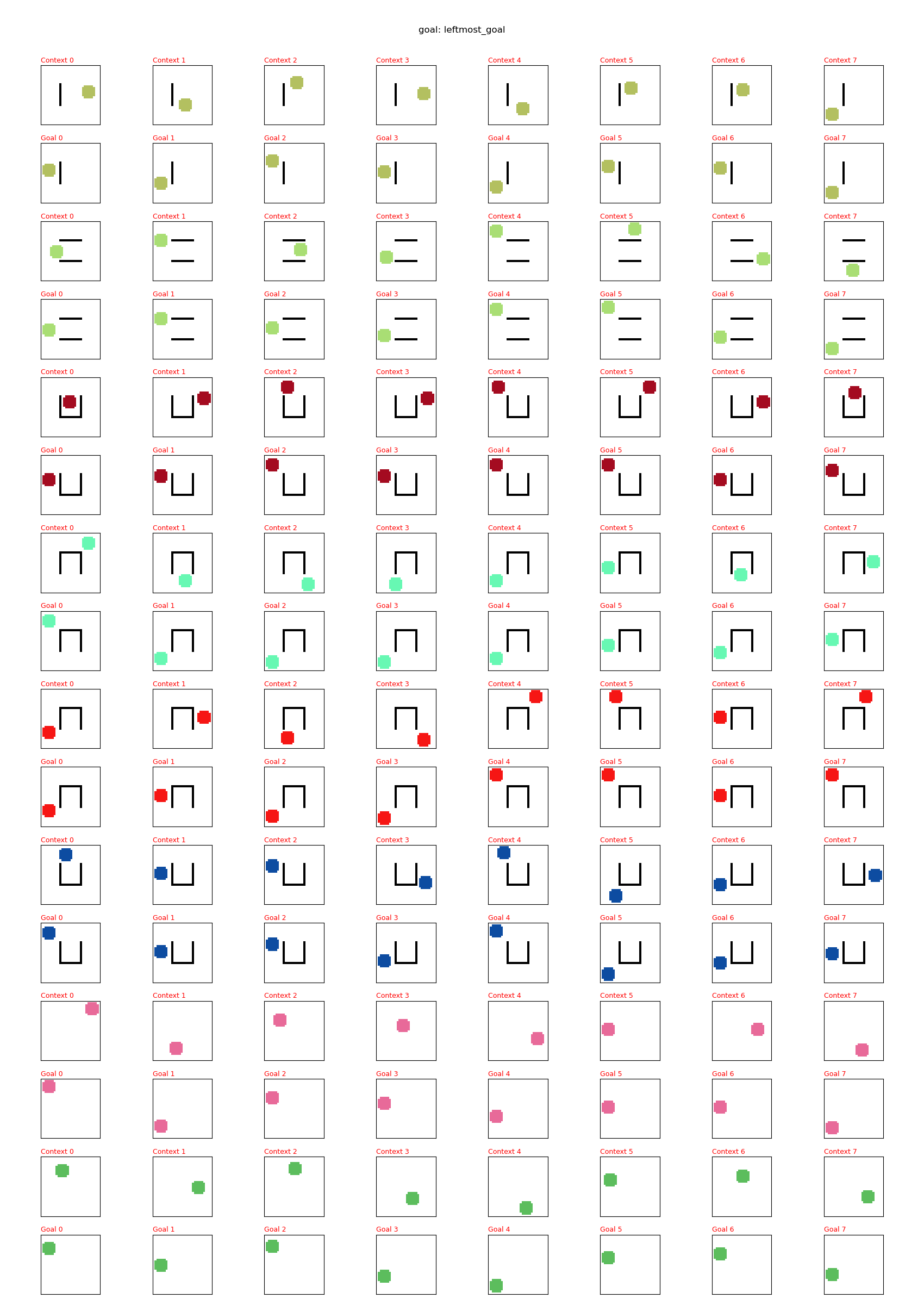 For each of the goal type mentioned above, I’ll show a large grid with pairs of rows, where the top row in the pair is the “context” or “current state”, and the bottom row is the goal that the latent mapping produced, decoded to give an image. This will let us quickly see if it’s broadly succeeding for the goal type across multiple envs.