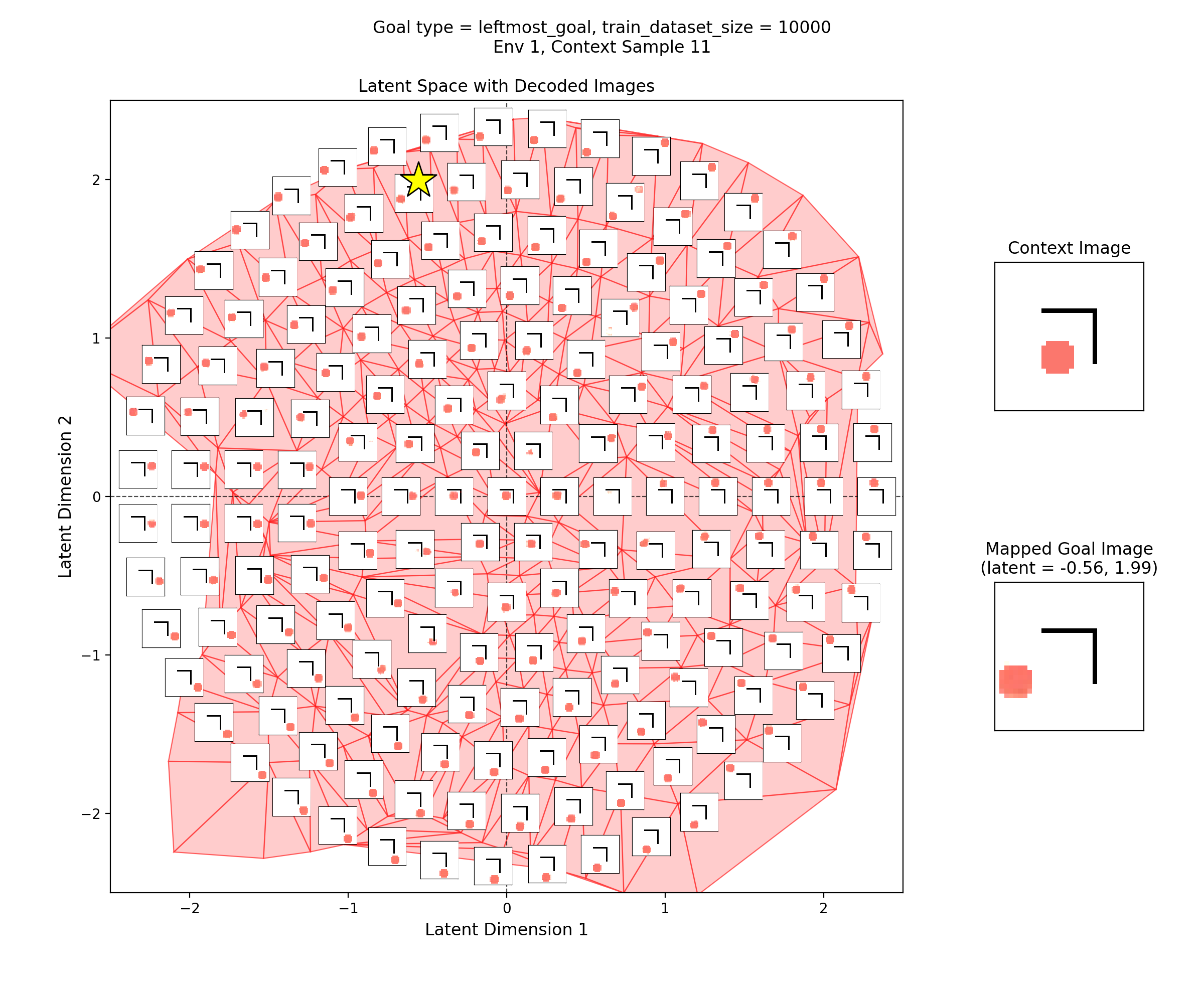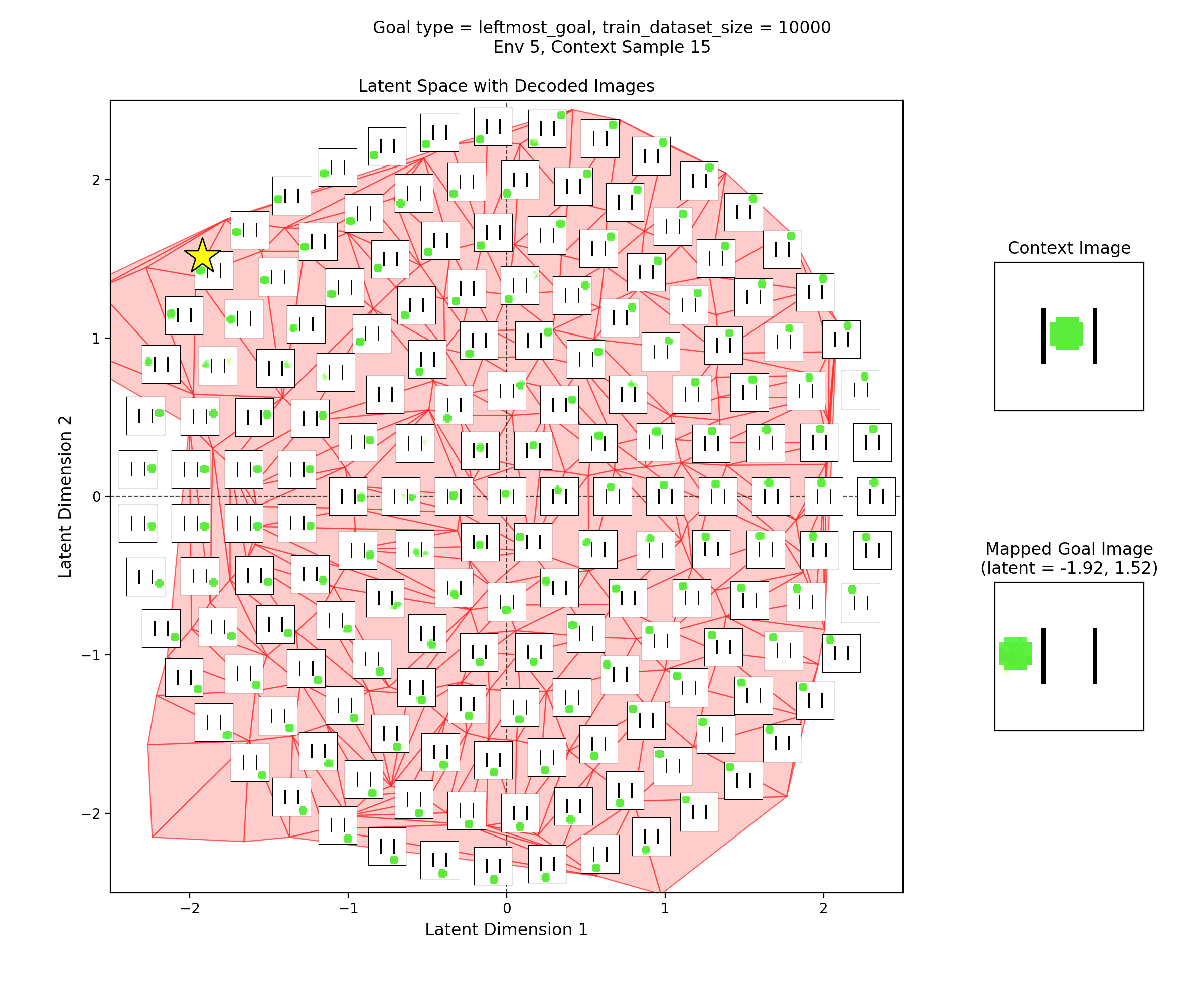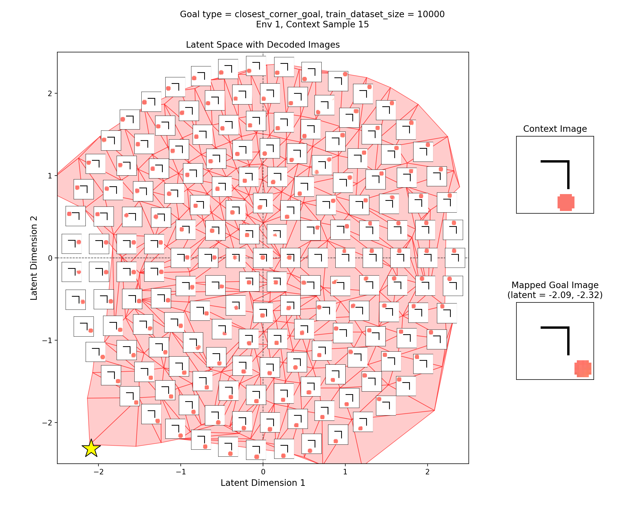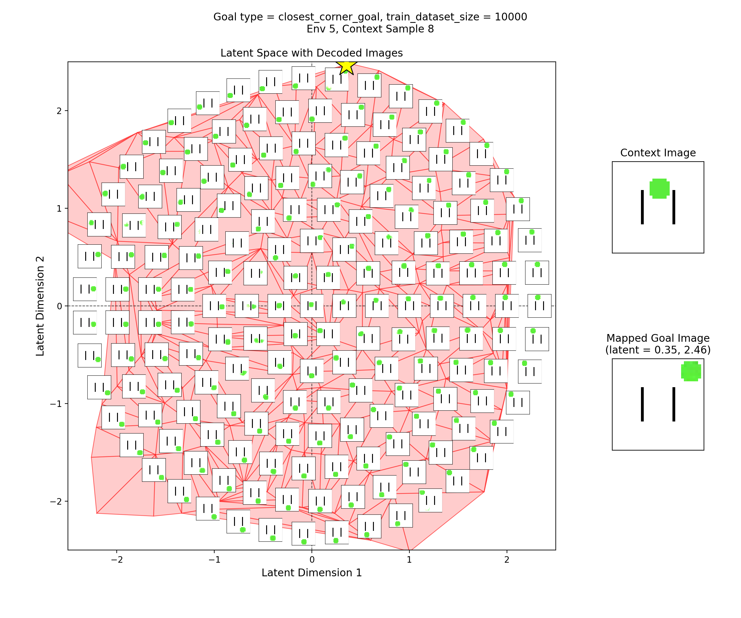 However, I think this makes sense, given what we trained the CCVAE to do. The training pairs are just two samples from the same env, where one is the context and one is the goal. Therefore, we’re basically saying saying that any valid state can be a goal from any other state in that env, and it really doesn’t need the context position at all. If I had trained it on a more restrictive set of state/goal pairs like the ones I trained the latent mapping models on, where the distribution of goals does depend on the context position, then I’d expect them to have different latent space meanings. Maybe something to confirm in the future.
