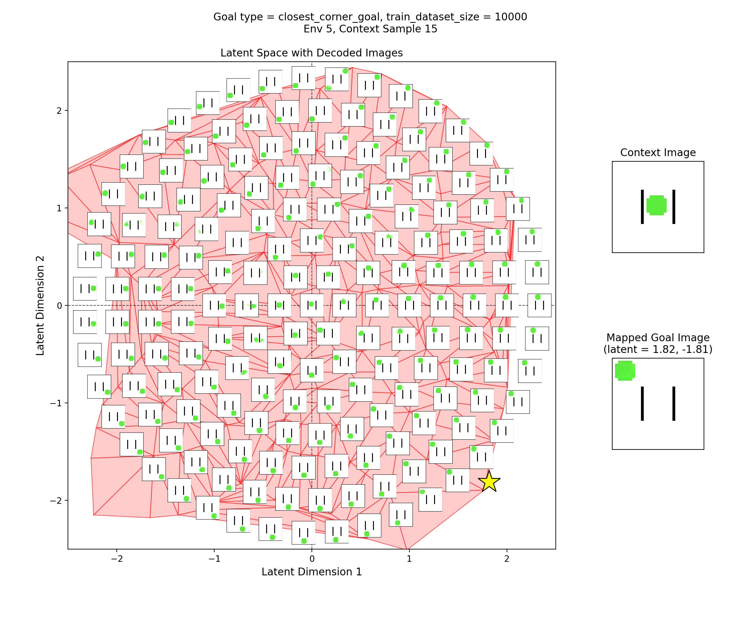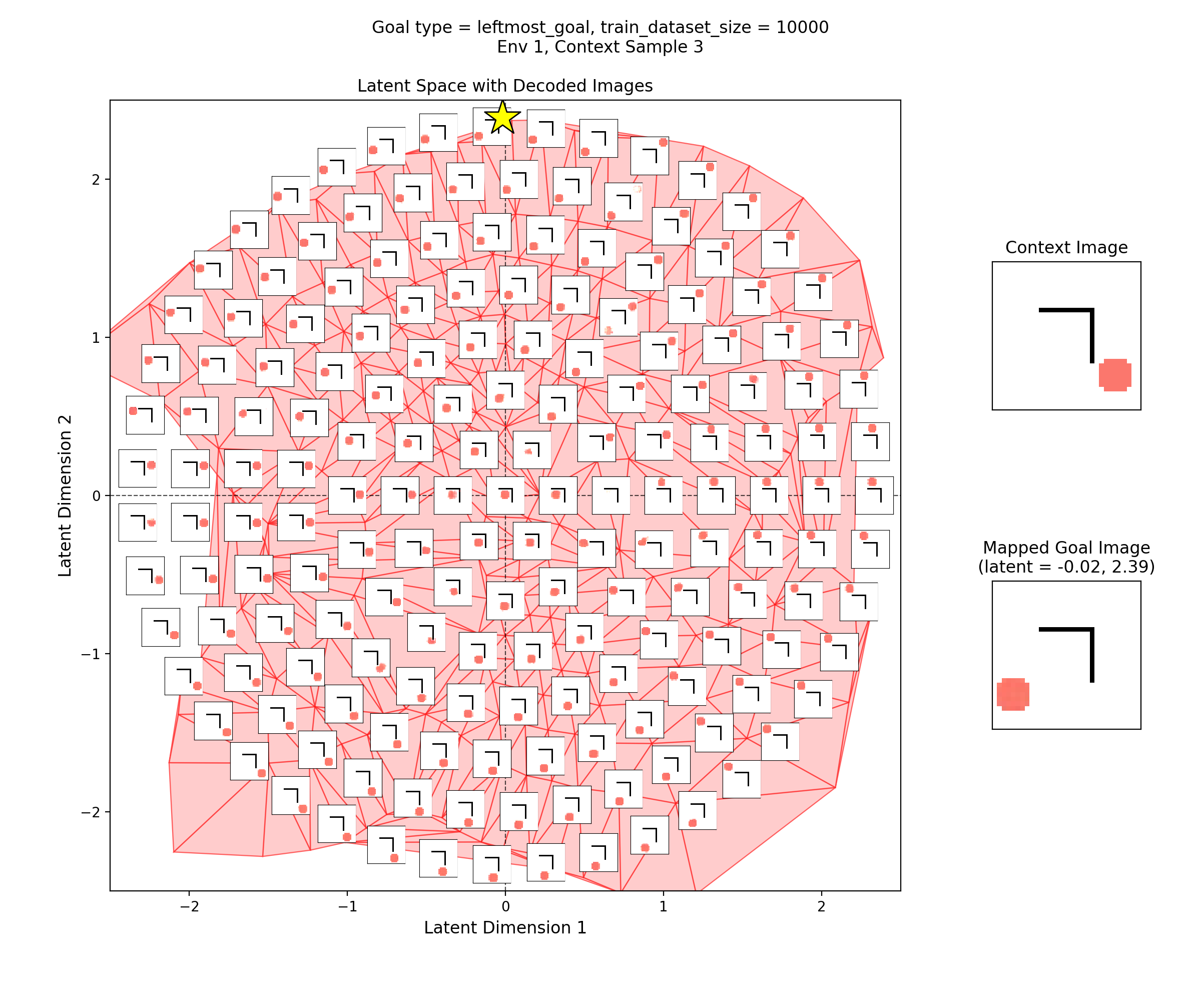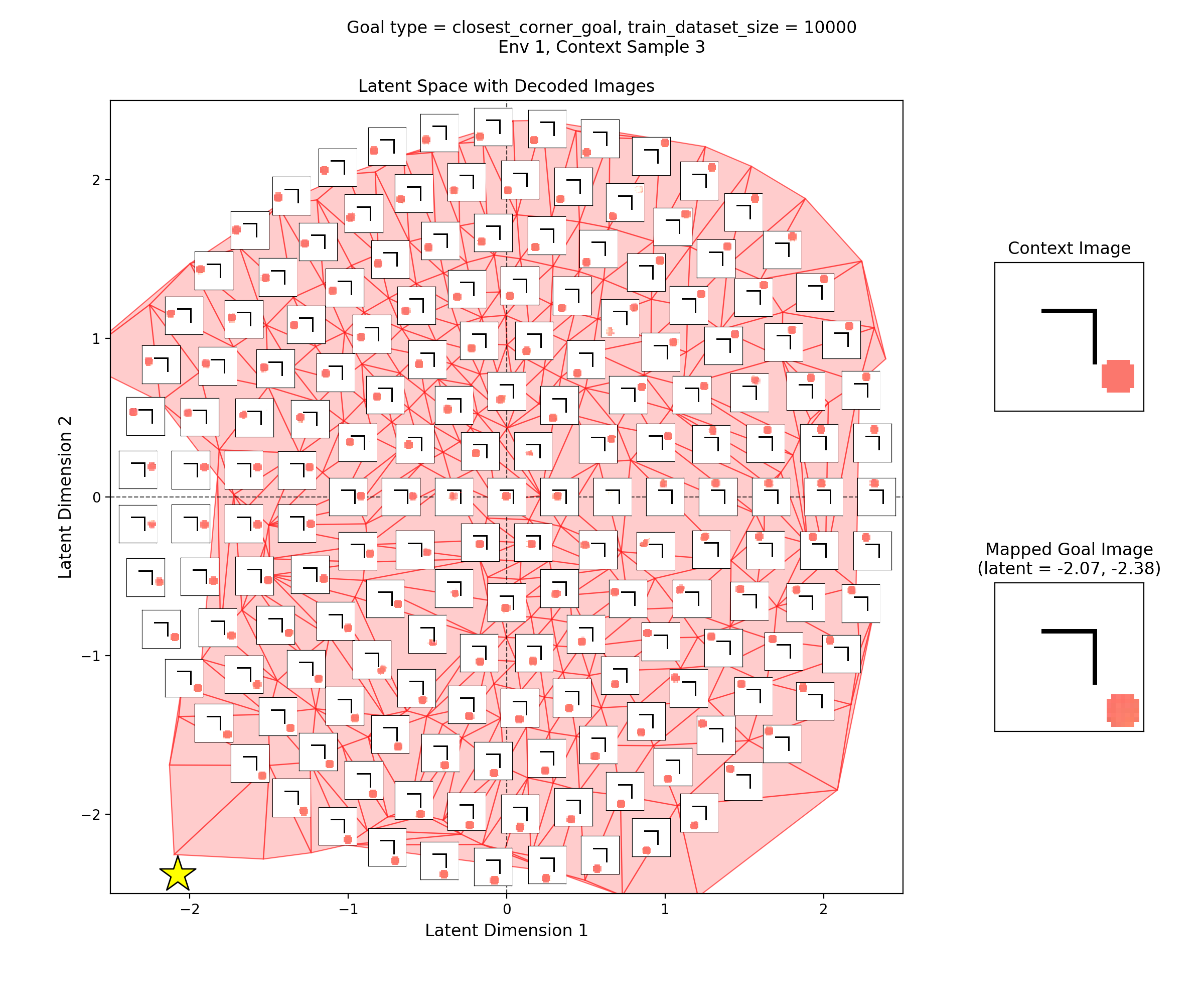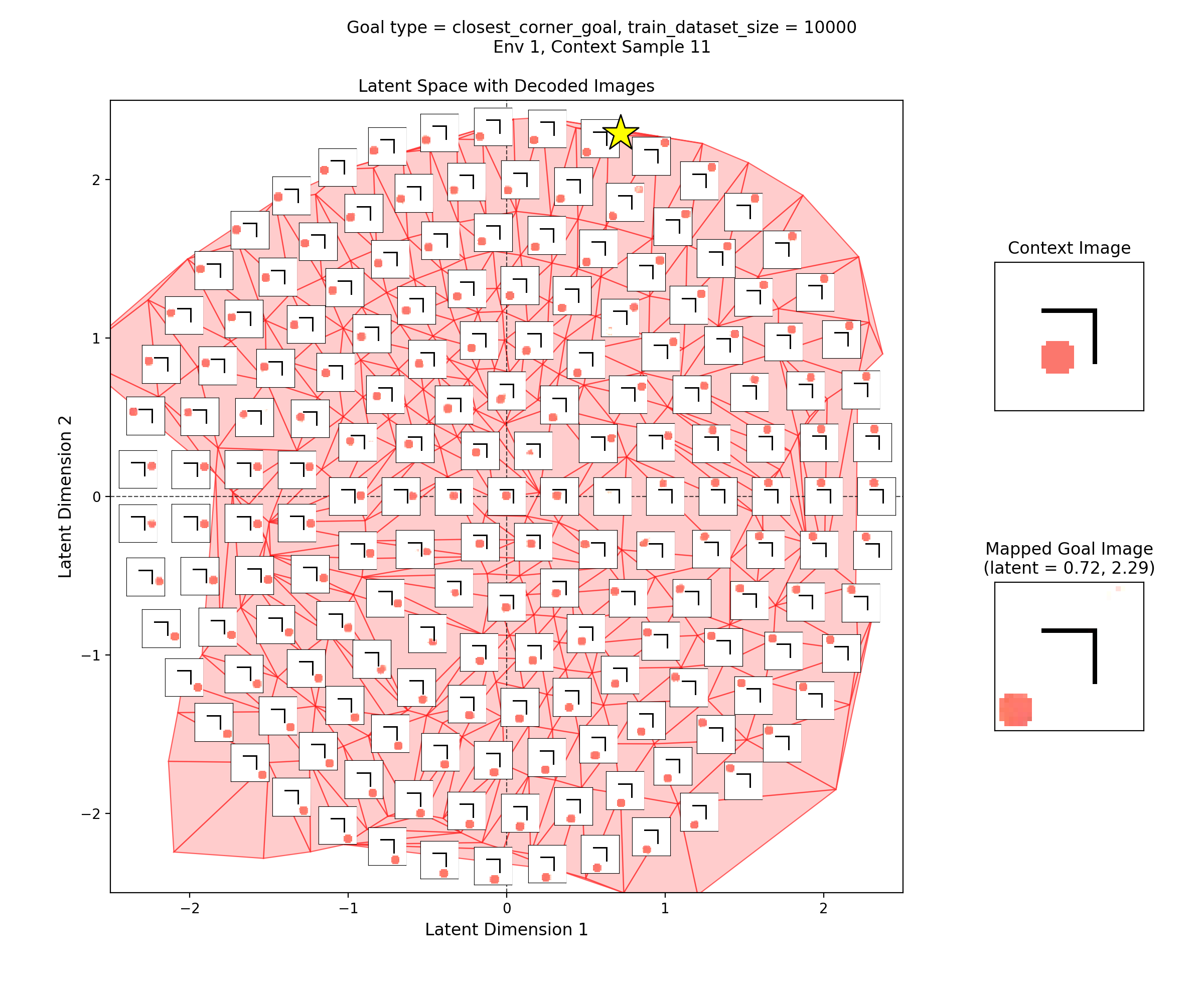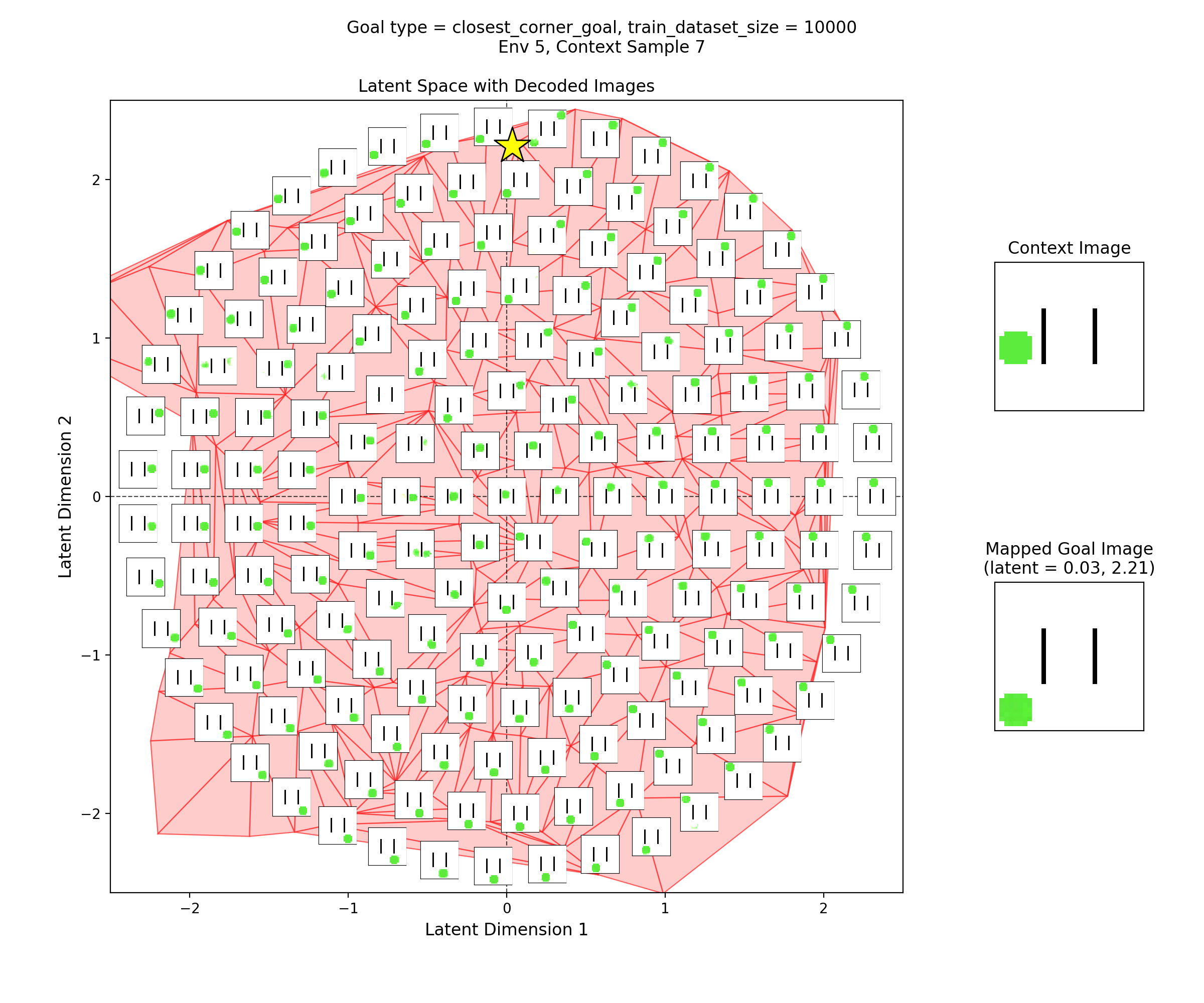 However, I think this makes sense, given what we trained the CCVAE to do. The training pairs are just two samples from the same env, where one is the context and one is the goal. Therefore, we’re basically saying saying that any valid state can be a goal from any other state in that env, and it really doesn’t need the context position at all. If I had trained it on a more restrictive set of state/goal pairs like the ones I trained the latent mapping models on, where the distribution of goals does depend on the context position, then I’d expect them to have different latent space meanings. Maybe something to confirm in the future.