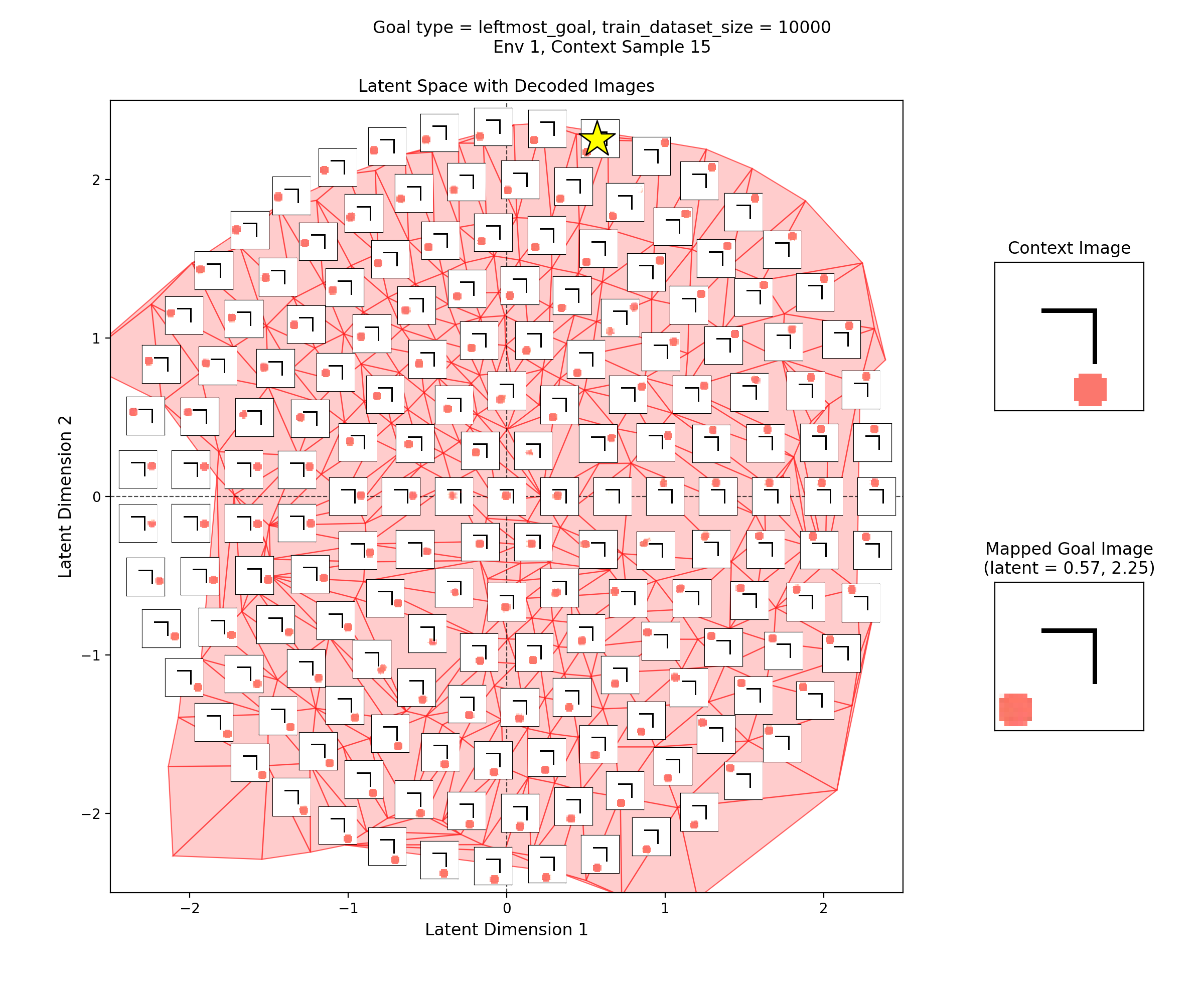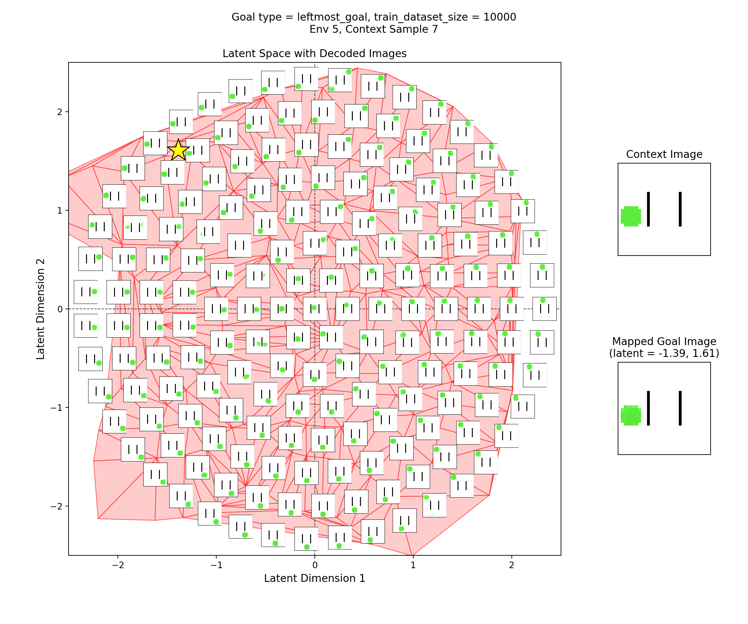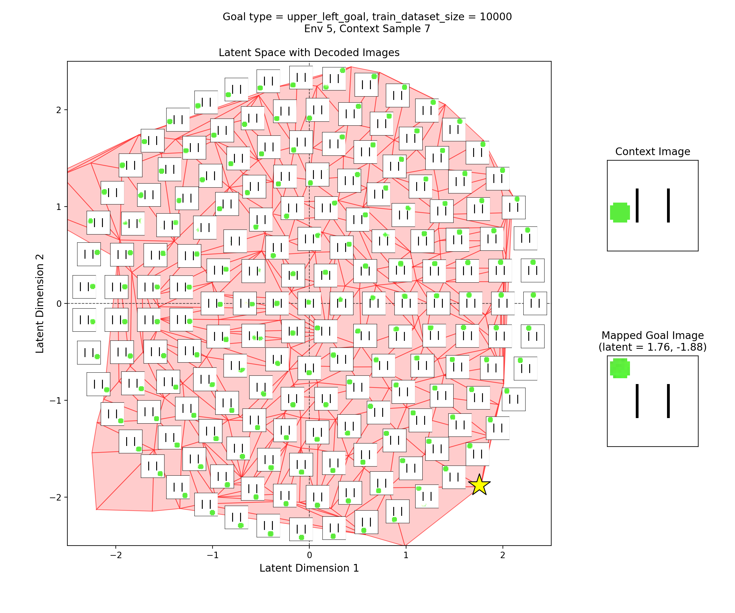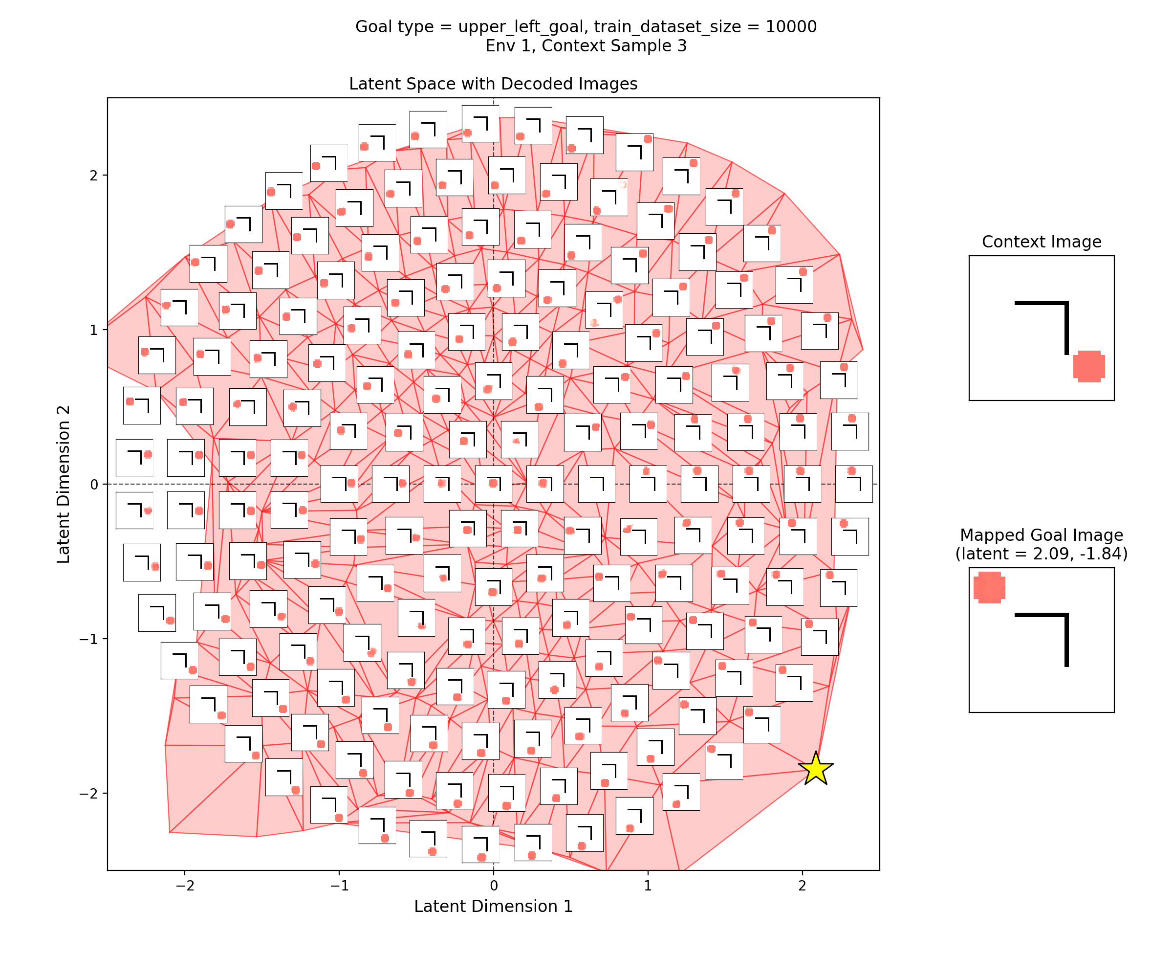 Obviously, when the context is a different env, the same $z$ will produce a goal image for that env. But this means it’s basically just encoding the circle color and wall positions in the latent context and throwing away the context circle position. In fact, even for different envs, you can see above that the same $z$ value still mostly corresponds to having the circle at the same position in that env. Since some envs have valid circle positions that are invalid for other envs, they move around a bit to accommodate this, but they’re mostly the same.