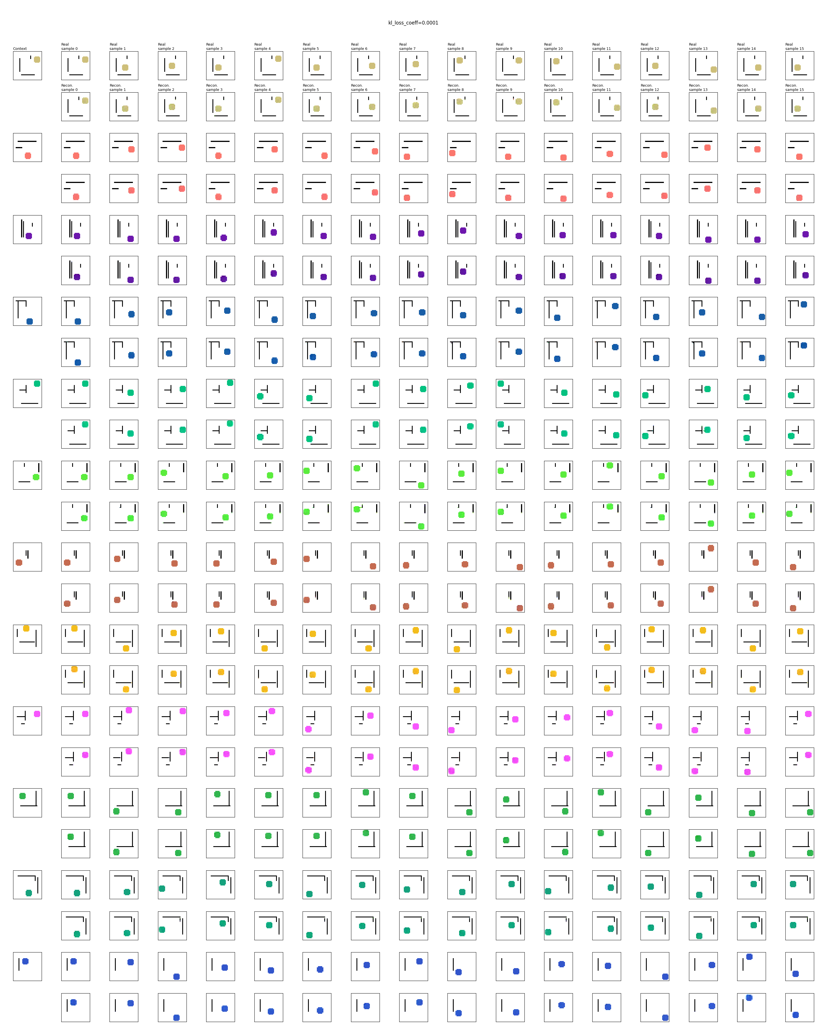 Importantly, each “episode” we sample a new “env”, i.e., a set of 0-3 horizontal and vertical walls, and a color for the circle in the episode. I say “episode”, because as I mentioned above, we’re not actually doing any RL here, but the point is that the agent would experience a distribution of these envs over different episodes, which is the distribution we’re trying to model with the CCVAE. For a given “episode”, the wall positions and circle color are fixed, but the different possible states for that episode could have the circle in any position that doesn’t have it intersecting the walls, and fully inside the grid.