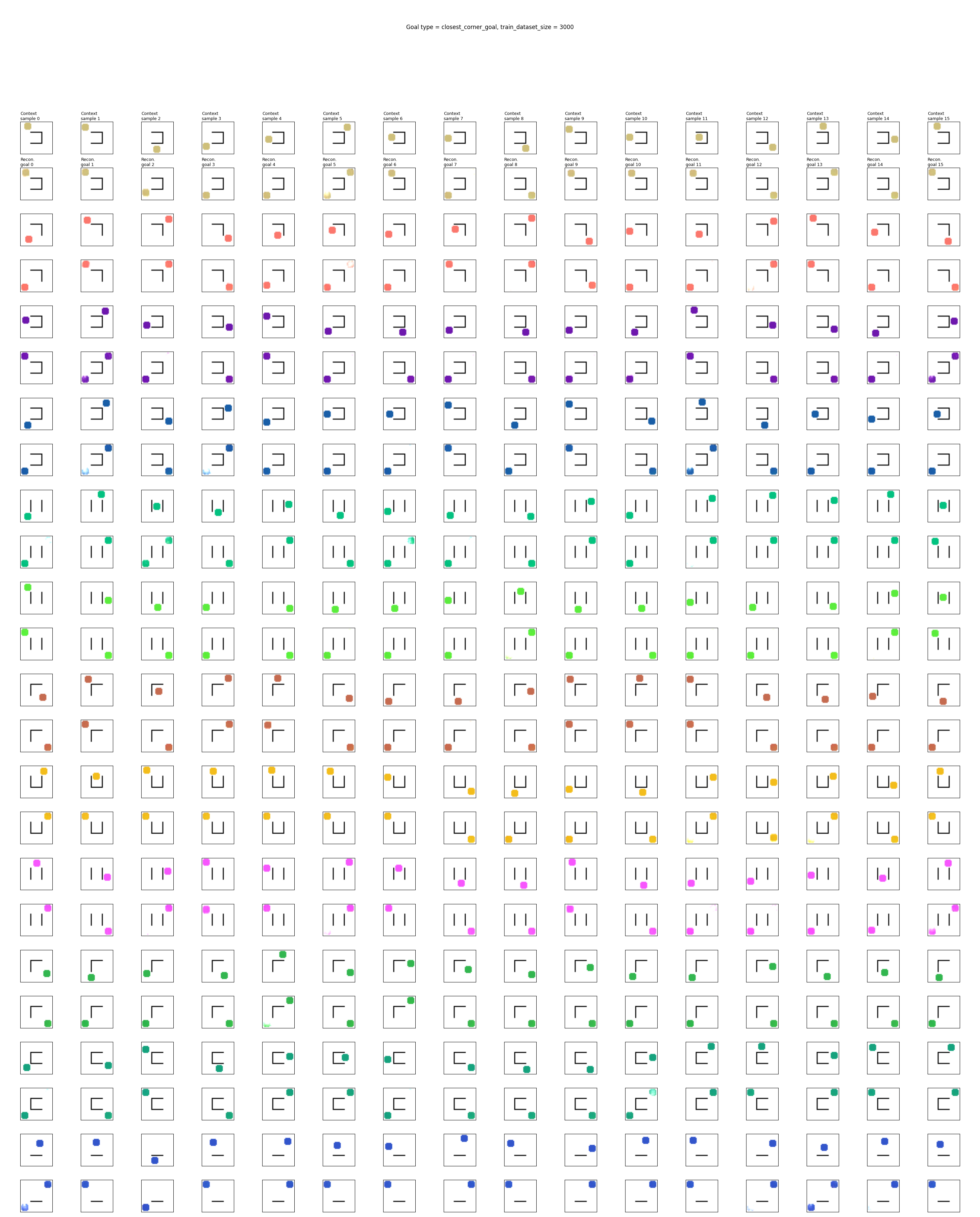 For the “closest corner” goal, it is useless at $100$, a little learned but pretty bad at $300$, mostly good but has a few errors at $1000$, and $3000$ looks very good: