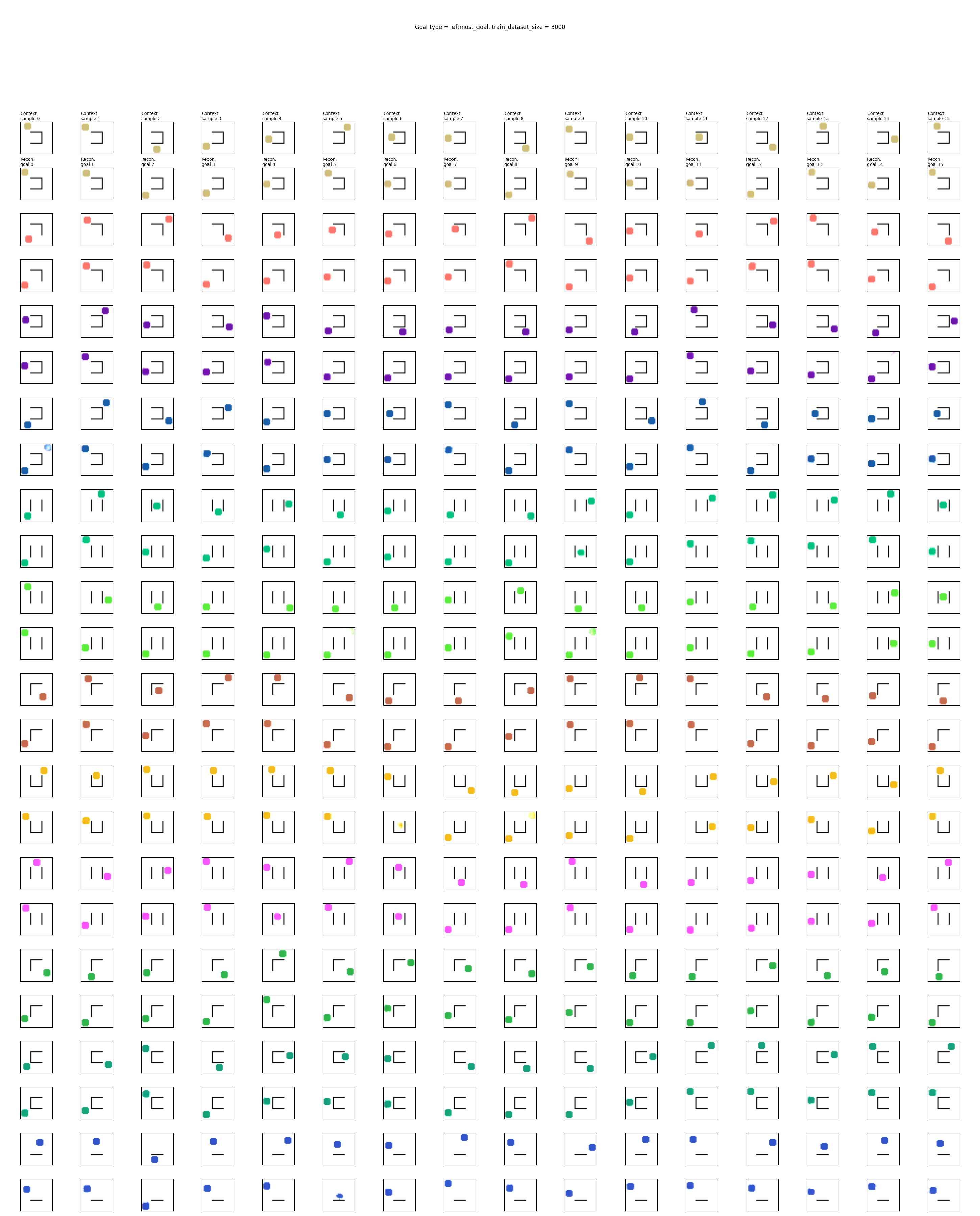 An unsatisfactory part of the whole “vastly simplifying the toy env made it work” is that I worry we basically just memorized the whole dataset. This toy env is very structured, so ideally we should be able to see a subset of all the possible envs and contexts, and generalize to unseen ones. However, after using the simpler one I realized that it’s now so limited that we may basically be showing it the vast majority of possible samples. There are 15 different wall configurations. For each, there are $\approx 200$ valid circle positions IIRC. That gives 3k wall/position samples. The circle color is a mostly unrestricted continuous RGB value. But, the train dataset size was 100k, so if we discretized the color space to 30 different colors, we’d have roughly as many training data samples as there are. There are obviously more than 30 colors and I’m guessing the dataset has many duplicates, but even being in the ballpark of it is a distinctly different regime.