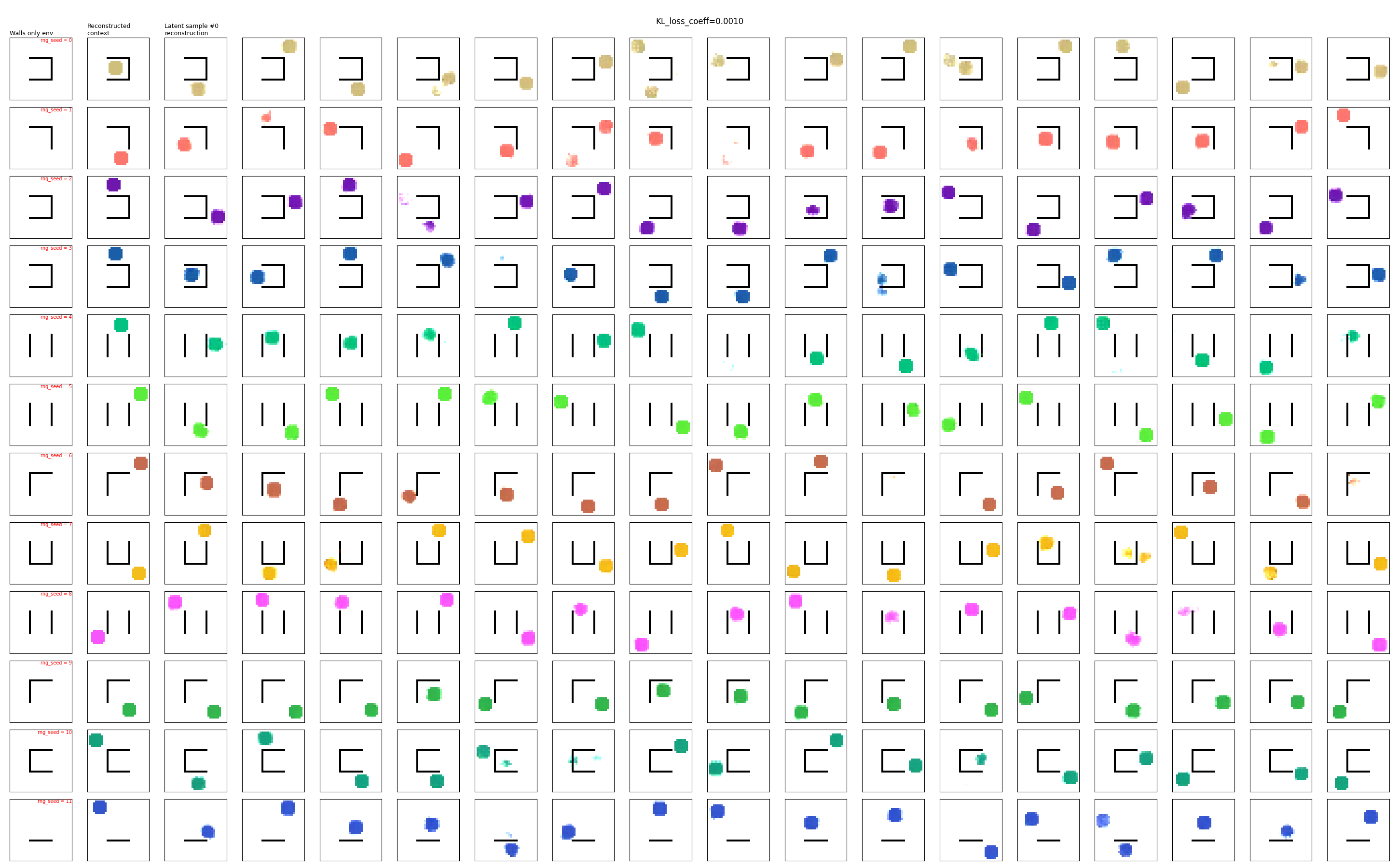 After messing around a bit, I kind of suspect that it basically learned to reconstruct the context, but also place the circle anywhere, with no concern for walls. If this were true, most of the time the circle wouldn’t intersect any wall, which would be a valid sample. But it’d also mean it hasn’t really captured the env in as meaningful a way.