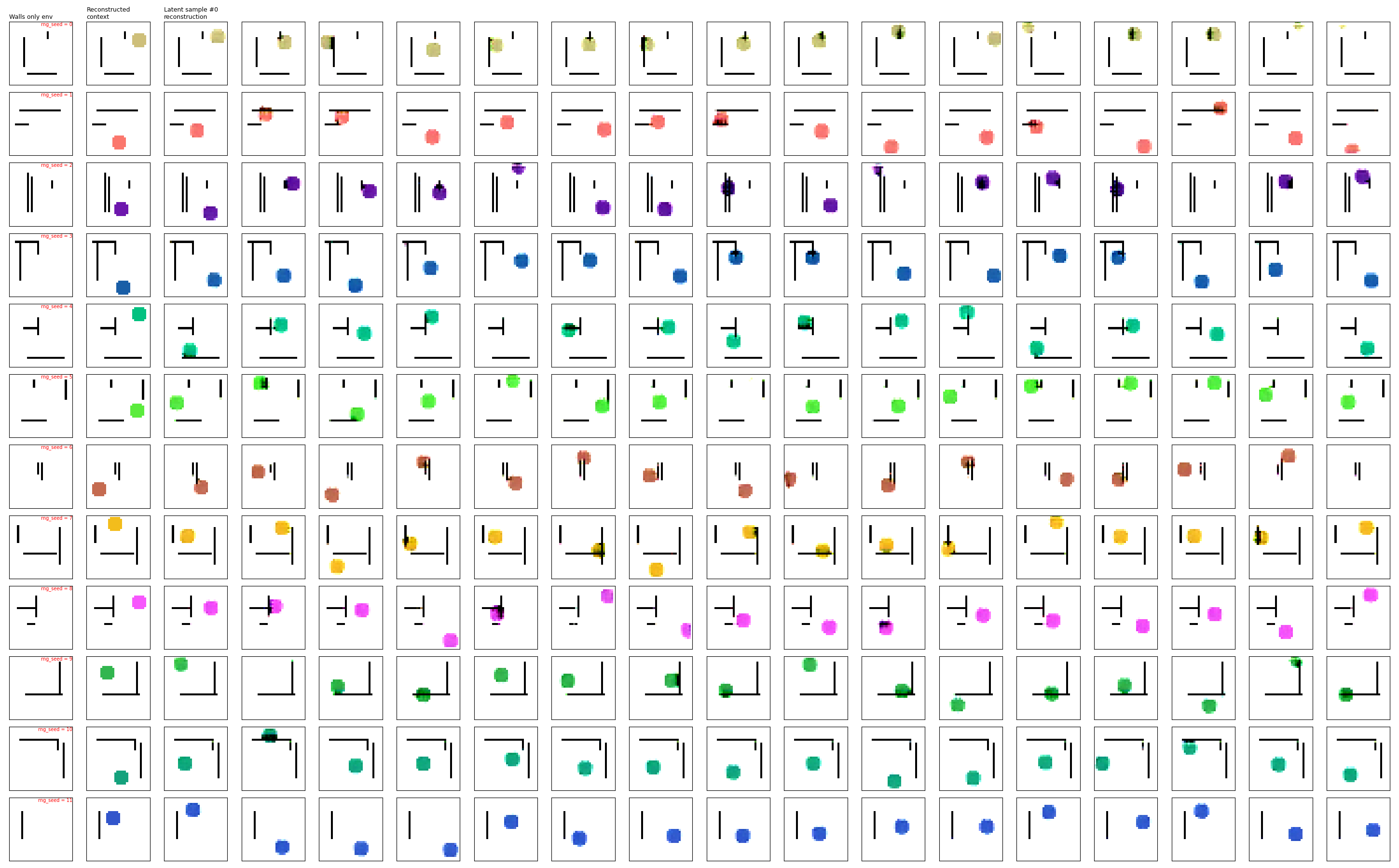 Next, let’s look at some samples from a given context, reconstructed so we can see what they look like in image space. If everything is learned well, these should all look like real samples from that env. Below, the 1st column is the env with no circle, the 2nd column is the context used for generating samples from that env, and the following columns are using that context, sampling a latent feature value, and decoding it to create a sample. Here’s an example of that: