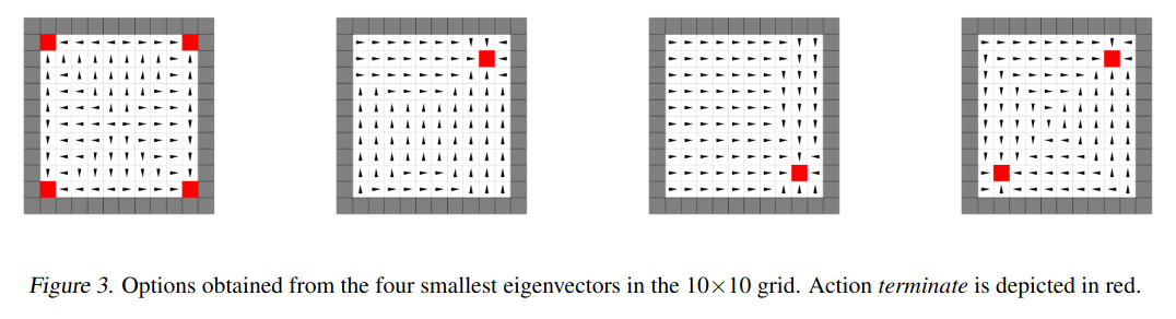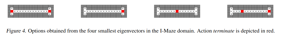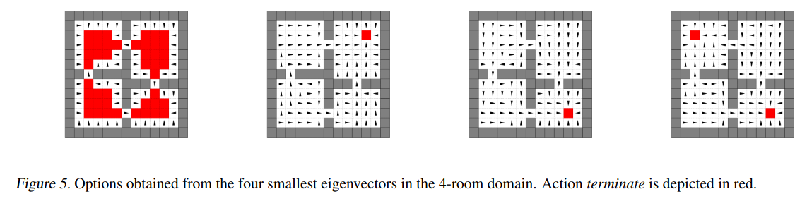To turn a policy (in this case an eigenbehavior) into an (eigen)option, you need to define termination states for it, where the option would stop and the high level controller would take over again. They define the termination states for an option as the states where the eigenbehavior has… achieved its eigenpurpose, meaning it can’t get more (cumulative) rewards for that eigenpurpose. This basically happens when it’s at a local maximum of the VF for that eigenpurpose. They give the agent a “terminate” action that it can do when it reaches those states. You can see it marked in red in the figure above.