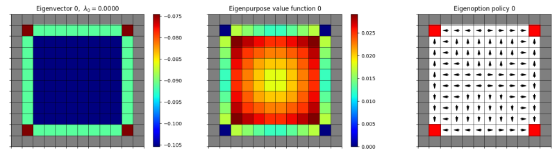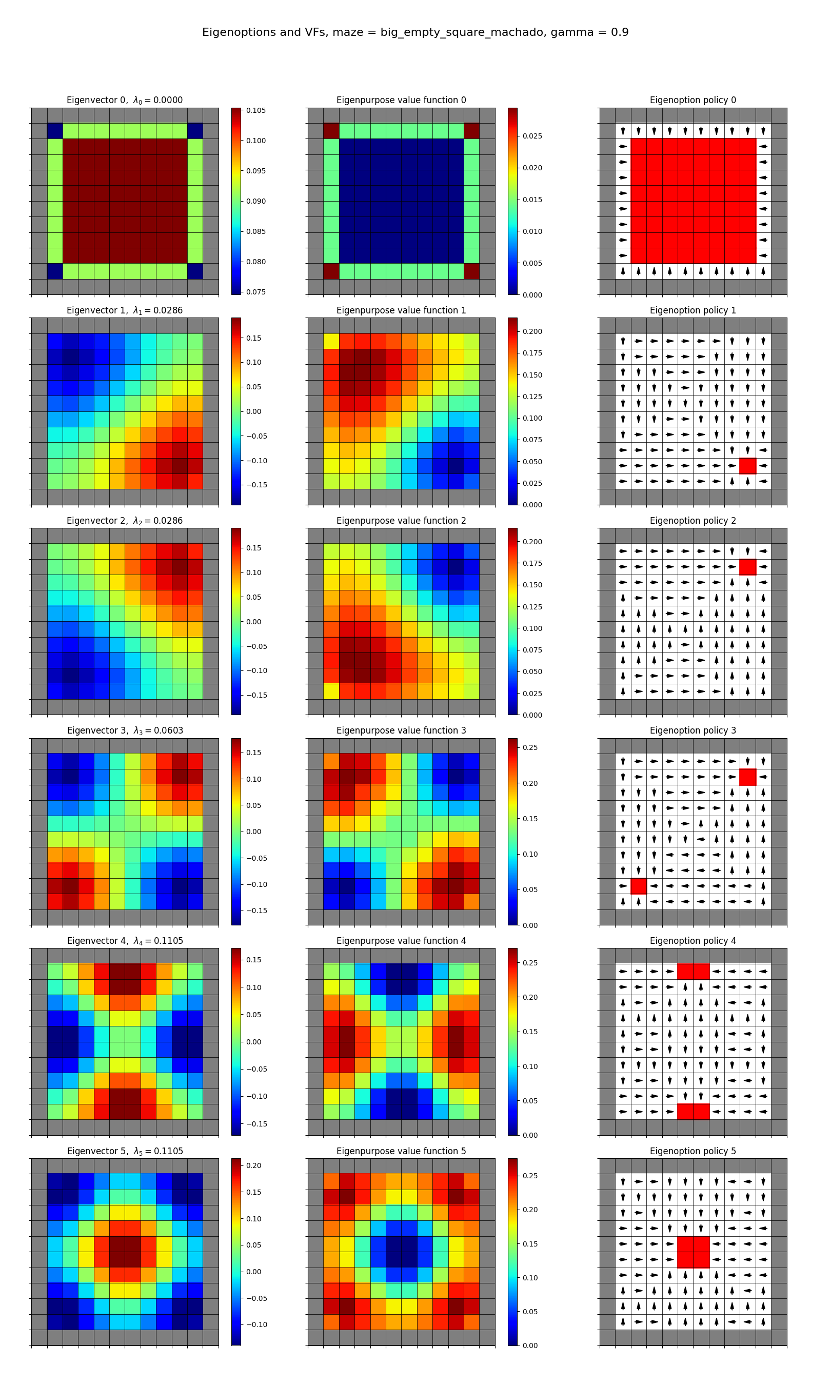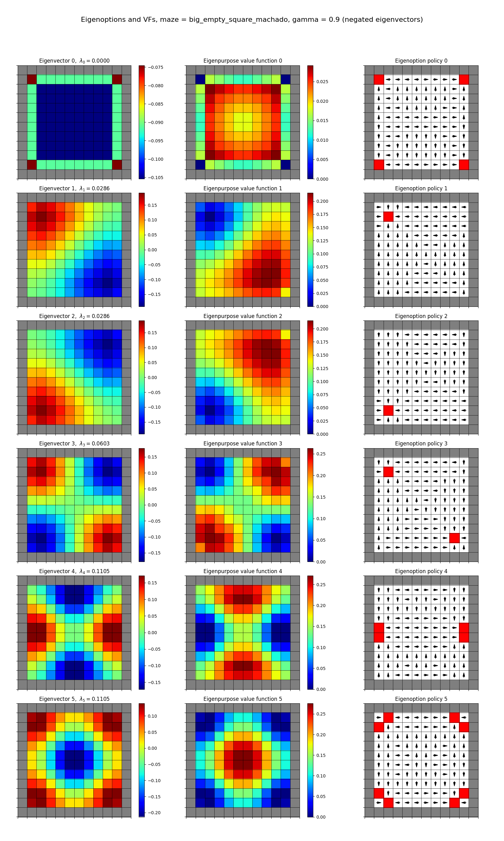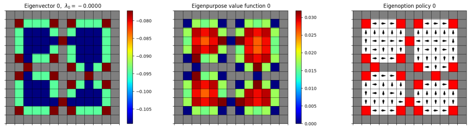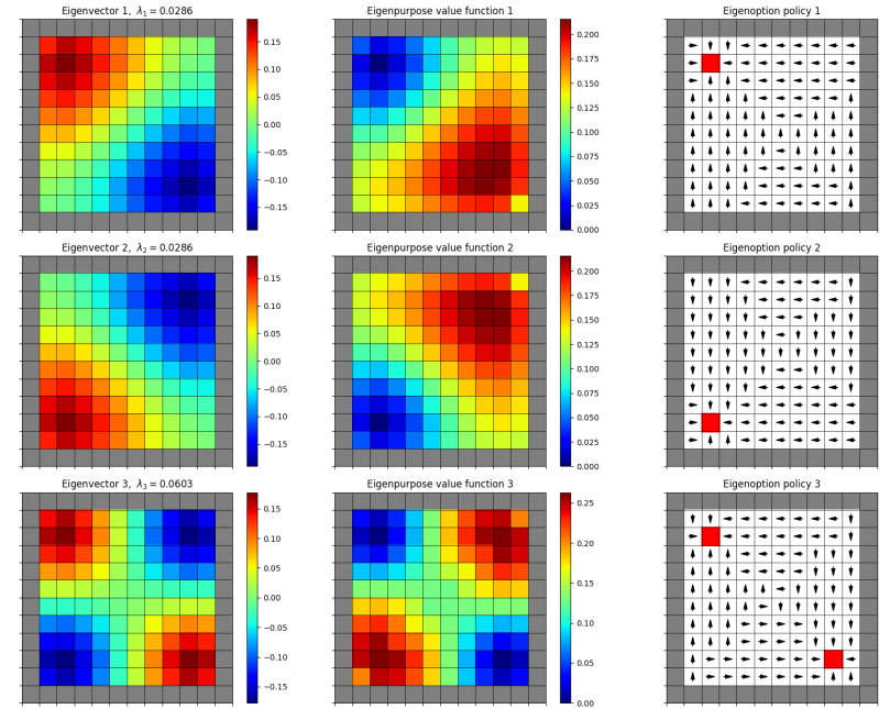 numpy.linalg.eighto find the $n$ most fundamental eigenvectors (i.e., PVFs) - For each of the PVFs, use it to define a reward function with it as above (i.e., eigenpurpose)