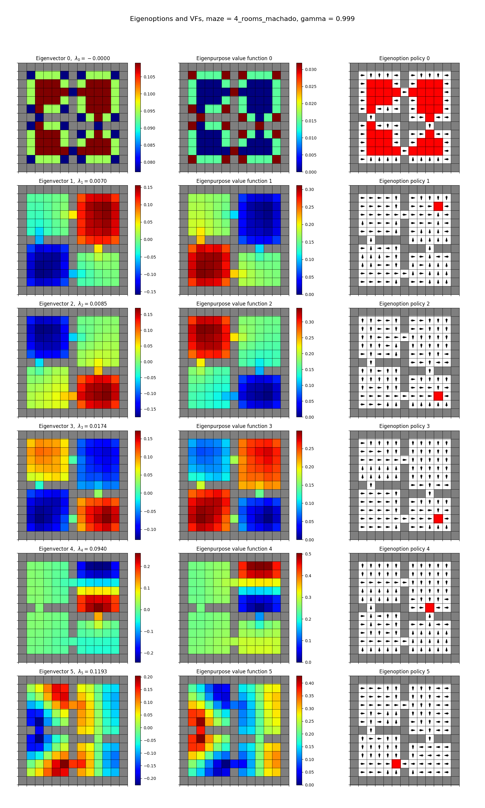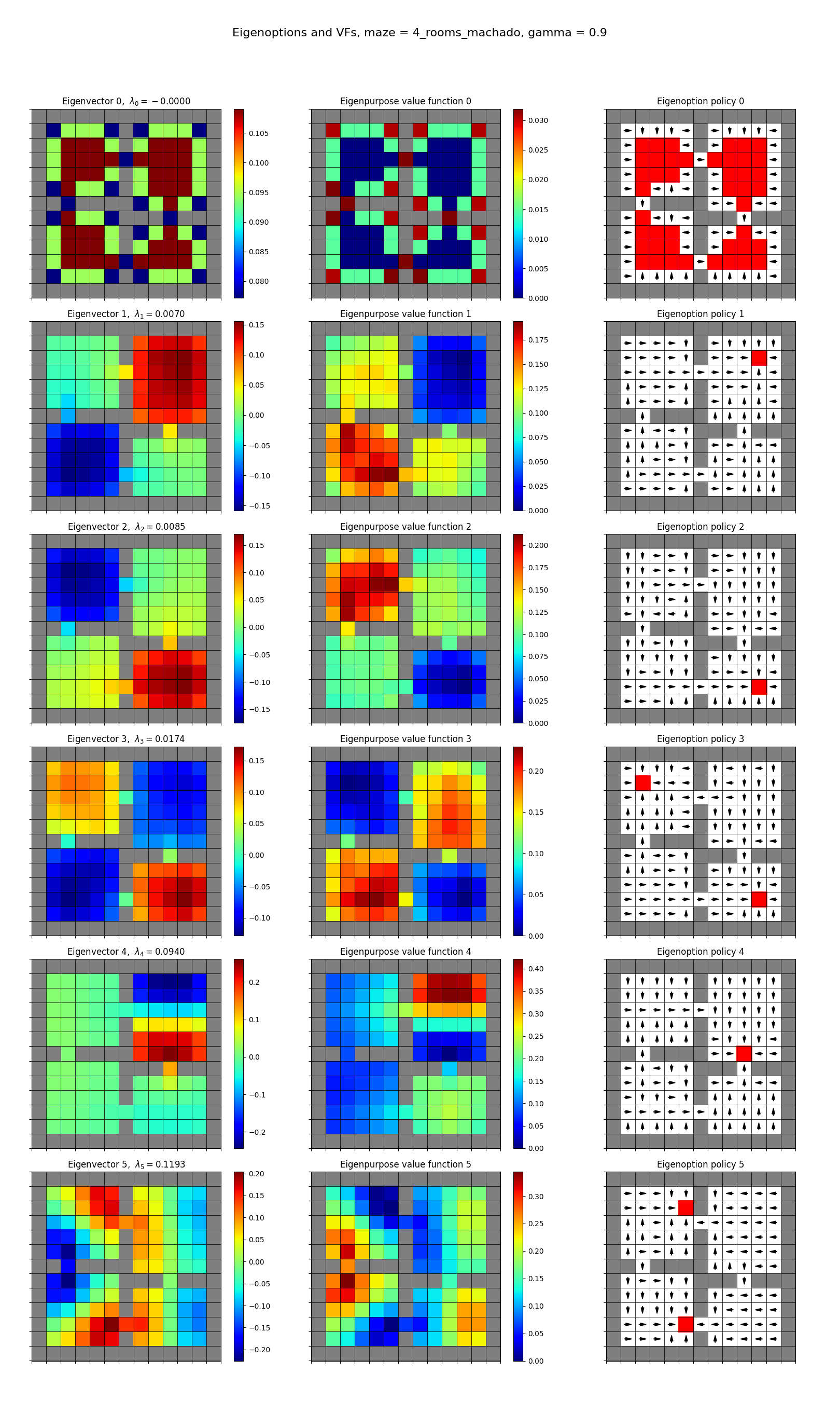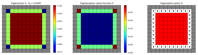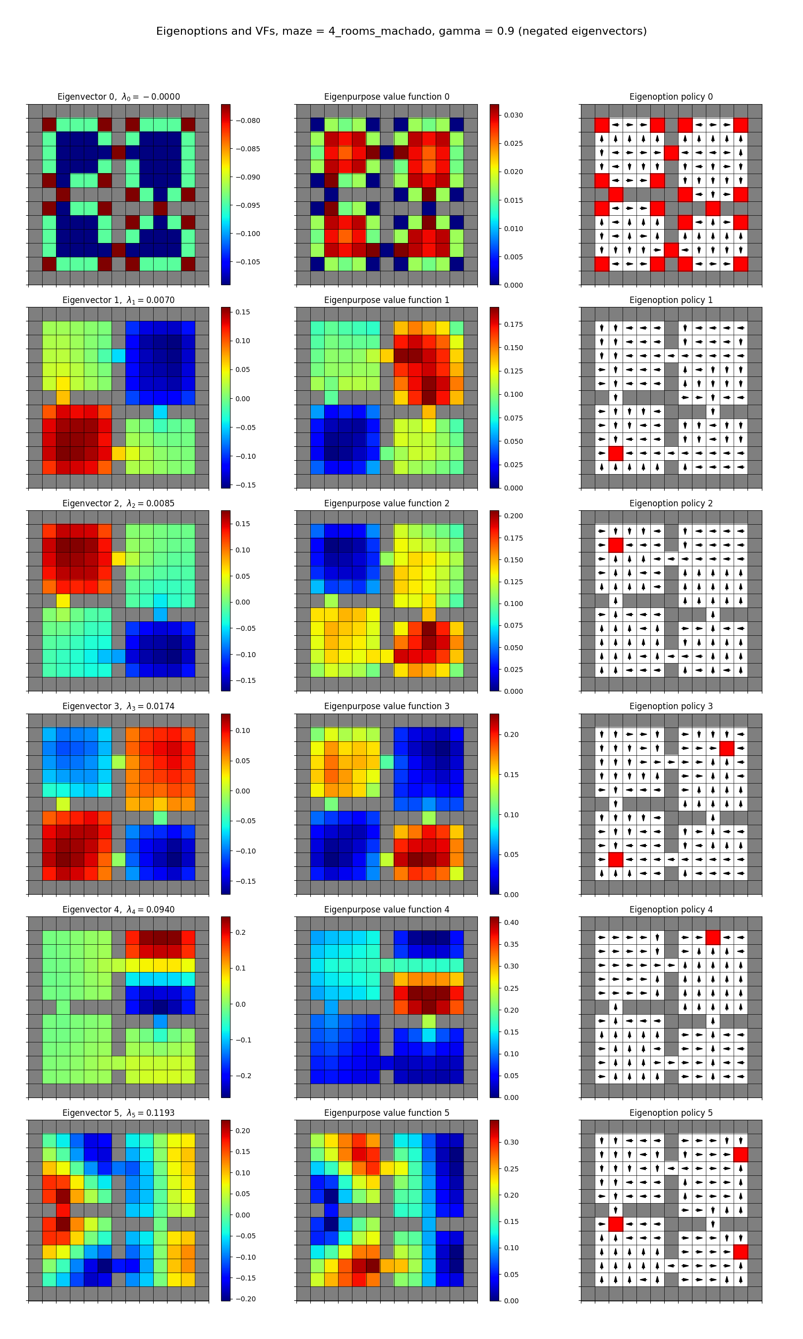 numpy.linalg.eighto find the $n$ most fundamental eigenvectors (i.e., PVFs) - For each of the PVFs, use it to define a reward function with it as above (i.e., eigenpurpose)