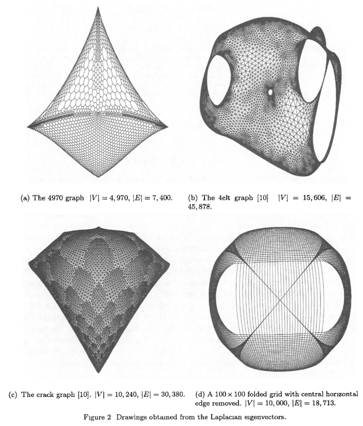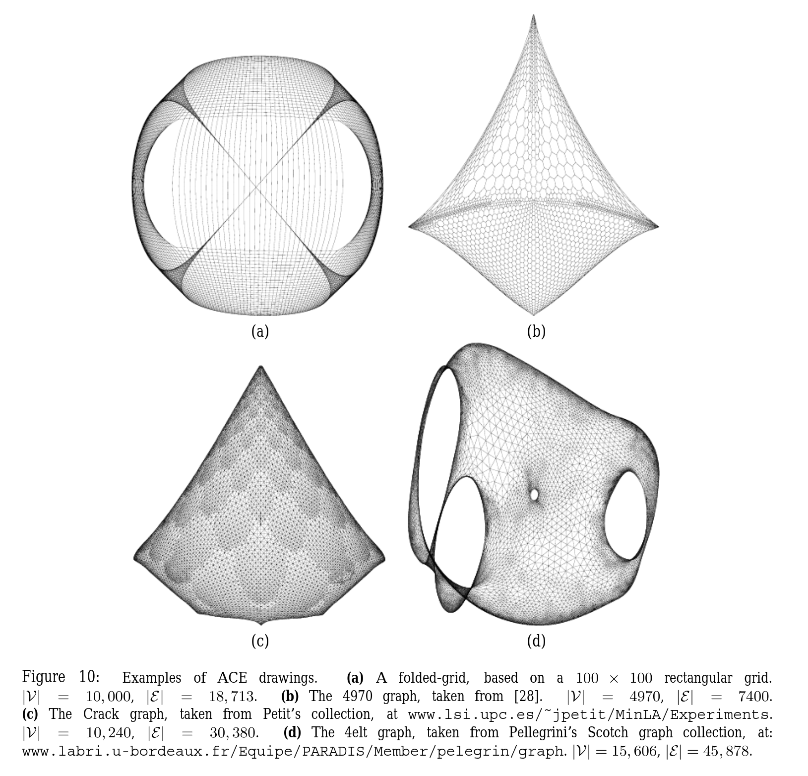 Just as an aside, I was trying to find the actual data for the graphs in the Koren paper and it led me on somewhat of a wild goose chase. His other paper, “ACE: A Fast Multiscale Eigenvectors Computation for Drawing Huge Graphs”, also uses these graphs, with a few references:
