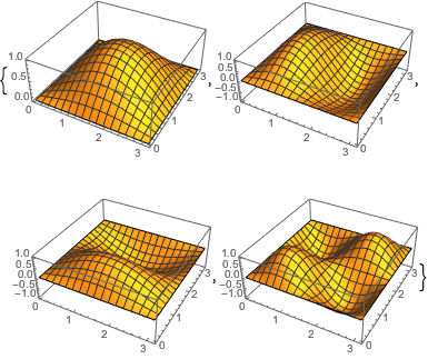 The shapes here might look familiar from various physics classes; however, one difference from most of when I’ve seen these before is that here we’re using von Neumann boundary conditions, so these functions are composed of cosines rather than sines (see the 1D eigenfunctions above) and therefore aren’t all zero at their edges. Here’s an example from Wolfram with the more common Dirichlet BC’s where you can see the functions go to zero at the edges: