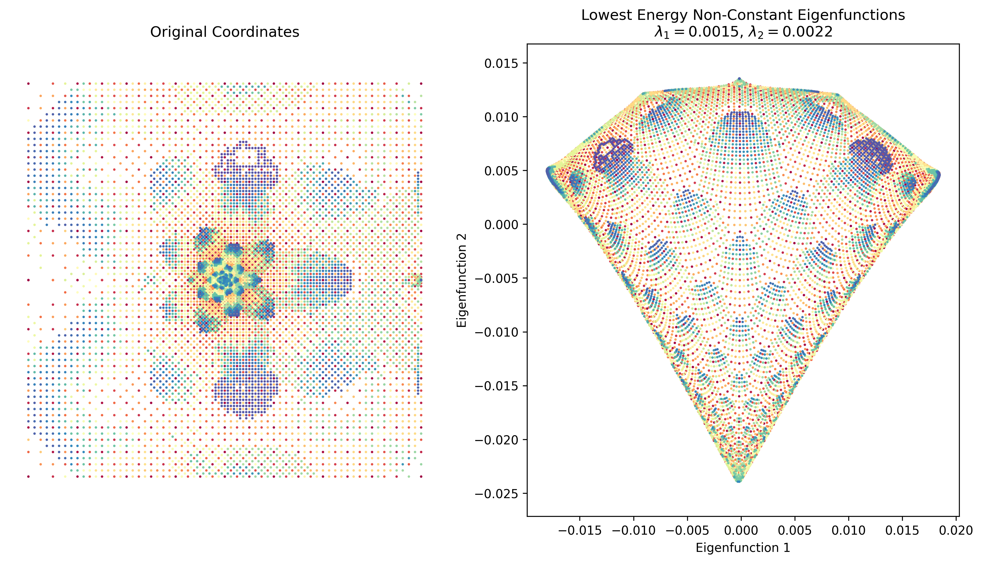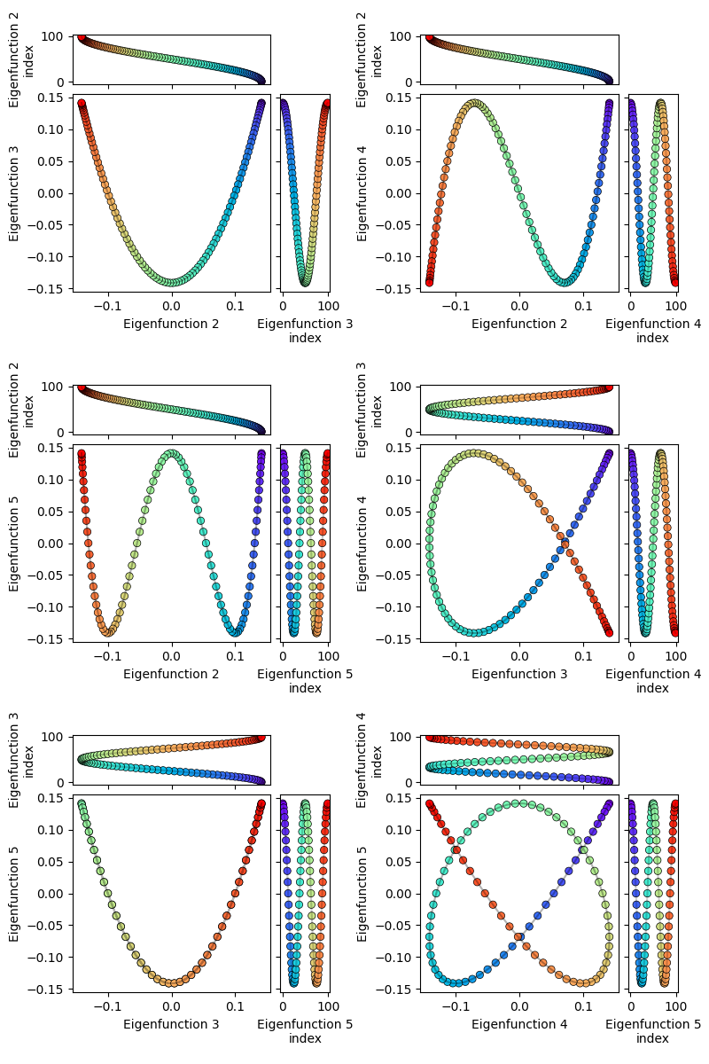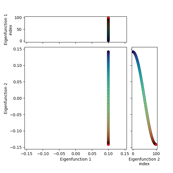 You can see that the 1st eigenfunction is constant, and hence all the points have the same coordinate in that dimension, while the 2nd eigenfunction varies in its dimension, illustrating the “bunching up” at the edges.