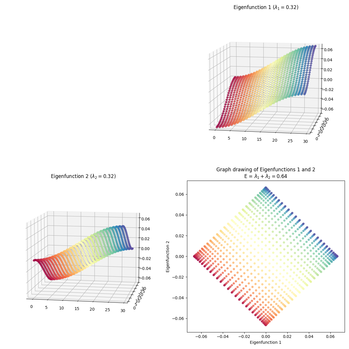 As a result, even though this graph is “2D”, the eigenfunctions produced by np.linalg.eigh themselves are still 1D vectors assigning a value to each node. When we looked at the 1D graph previously, the node indices were just assigned to the 1D chain nodes, increasing from left to right, so we could directly plot the eigenfunctions as a 1D curve to see their shape.