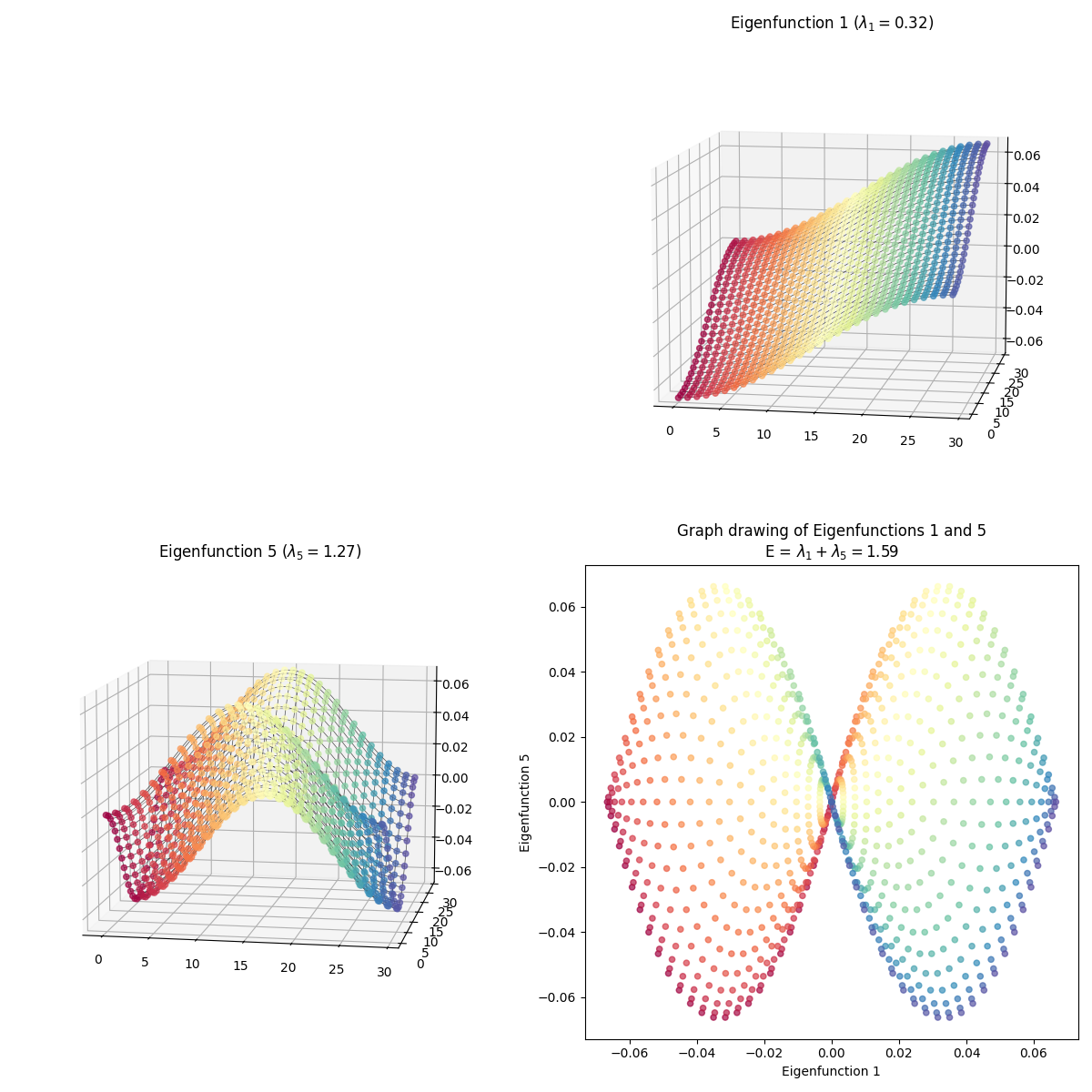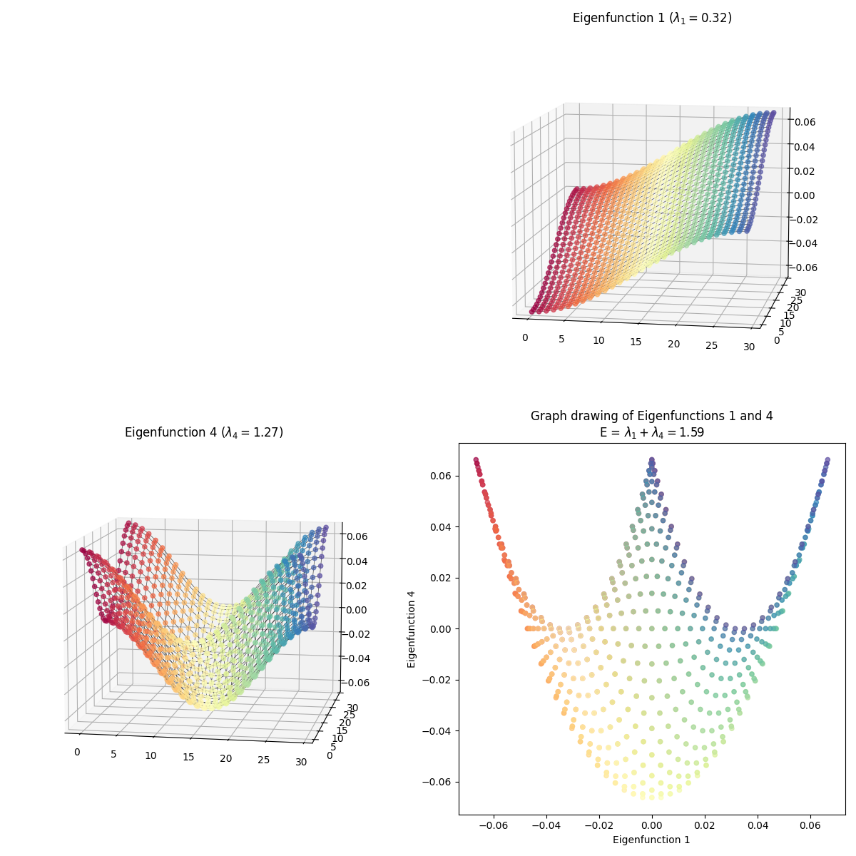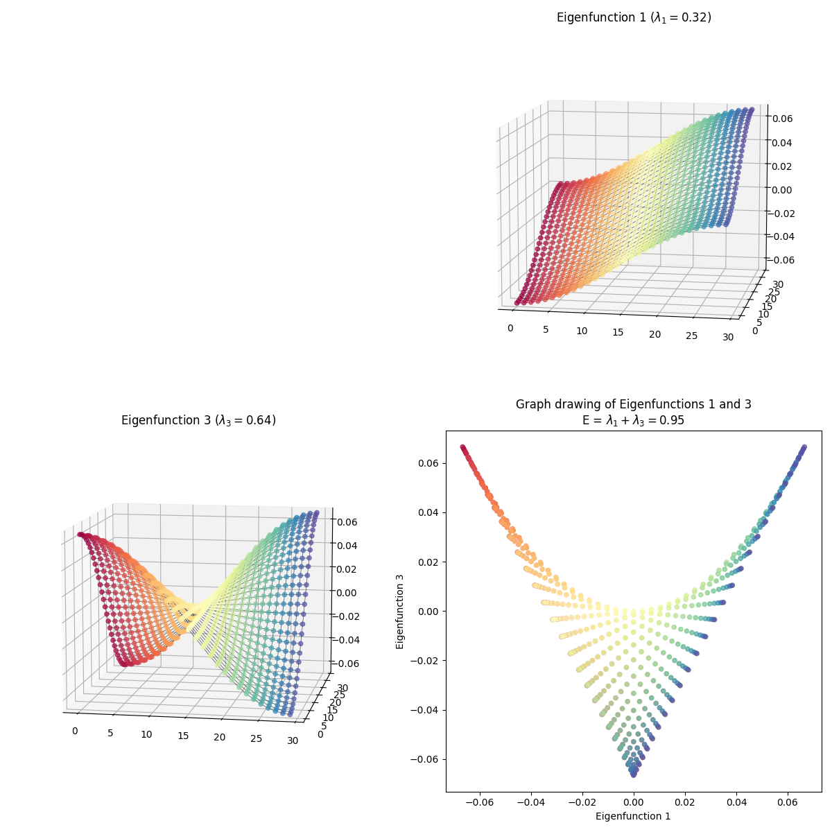 For each, I’ve plotted the two eigenfunctions being used in the left and top plots, and then plotted the resulting graph drawing in the 2D plot to the bottom right. Again, the same color corresponds to the same graph node in all of them.