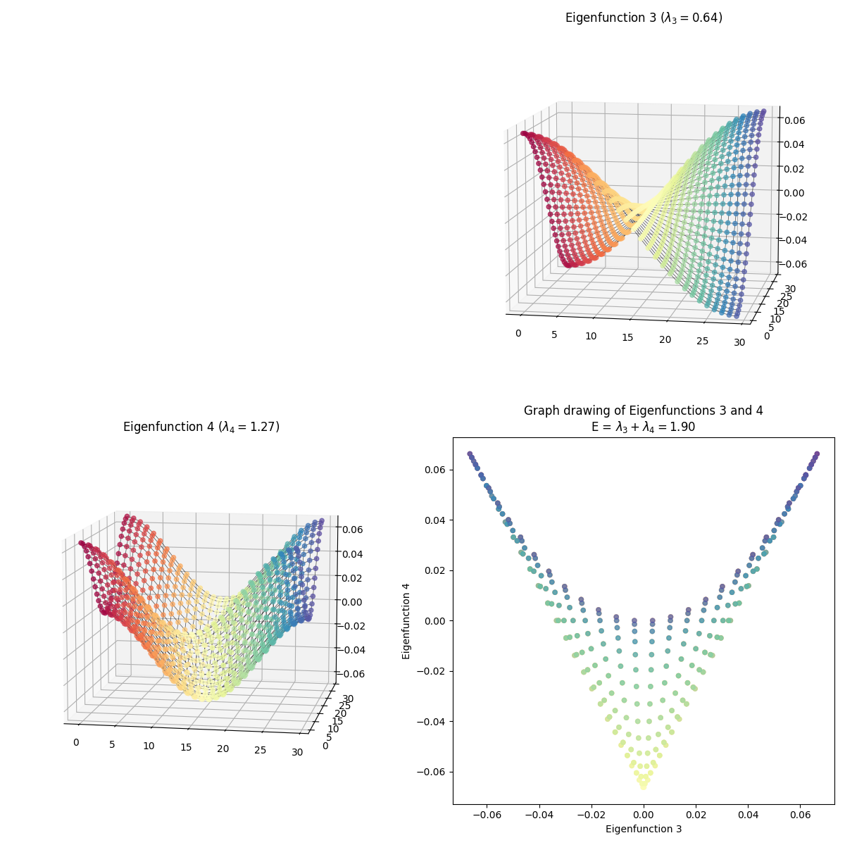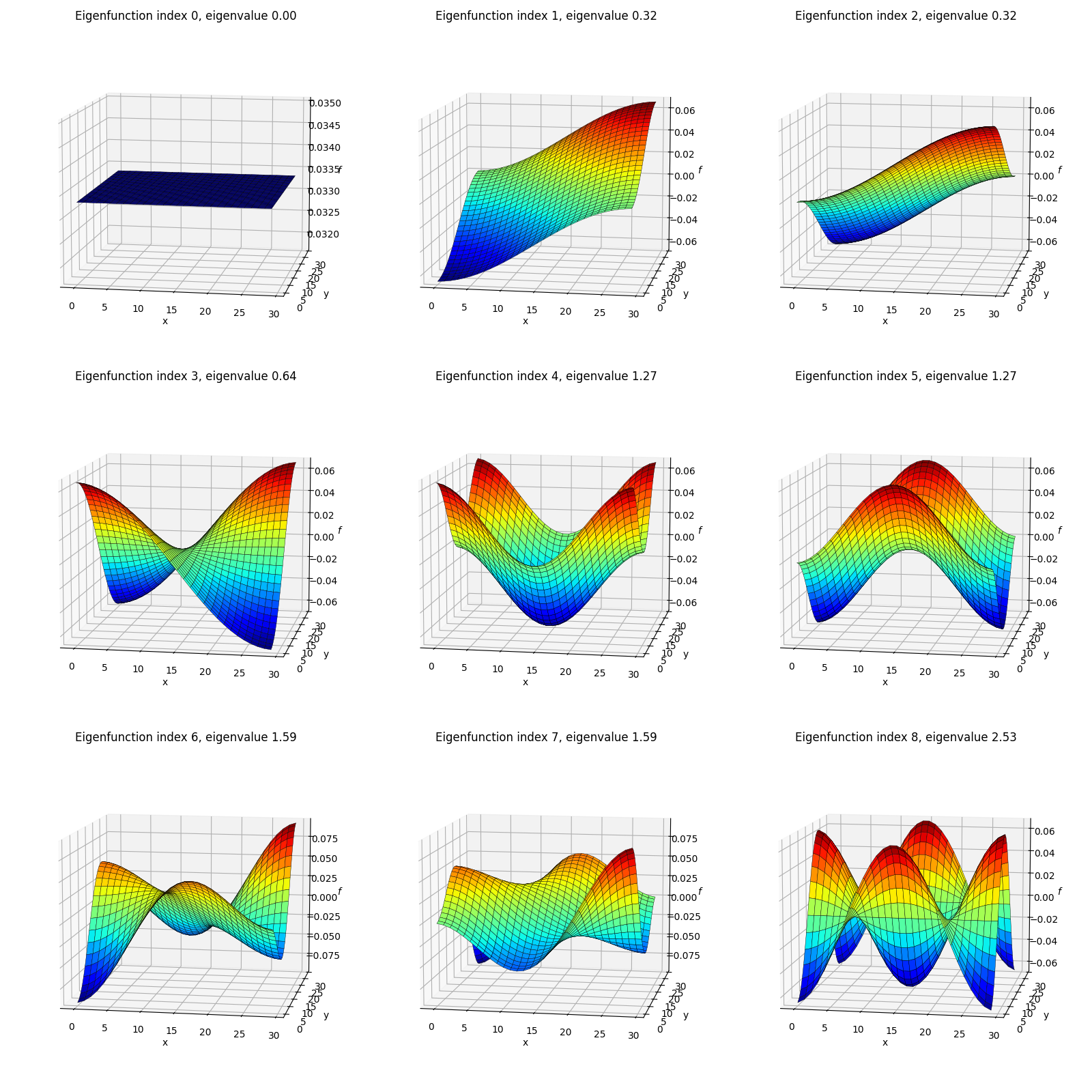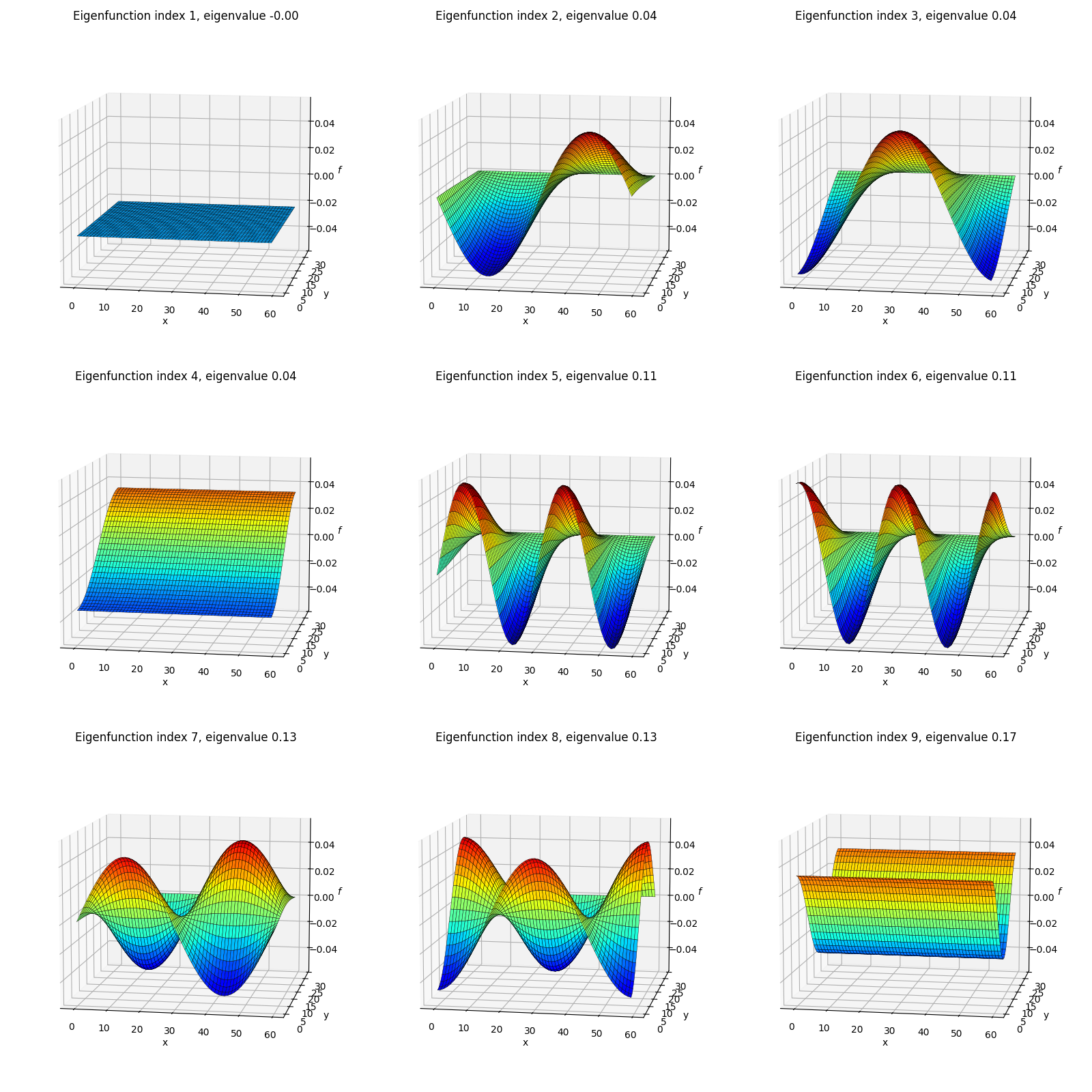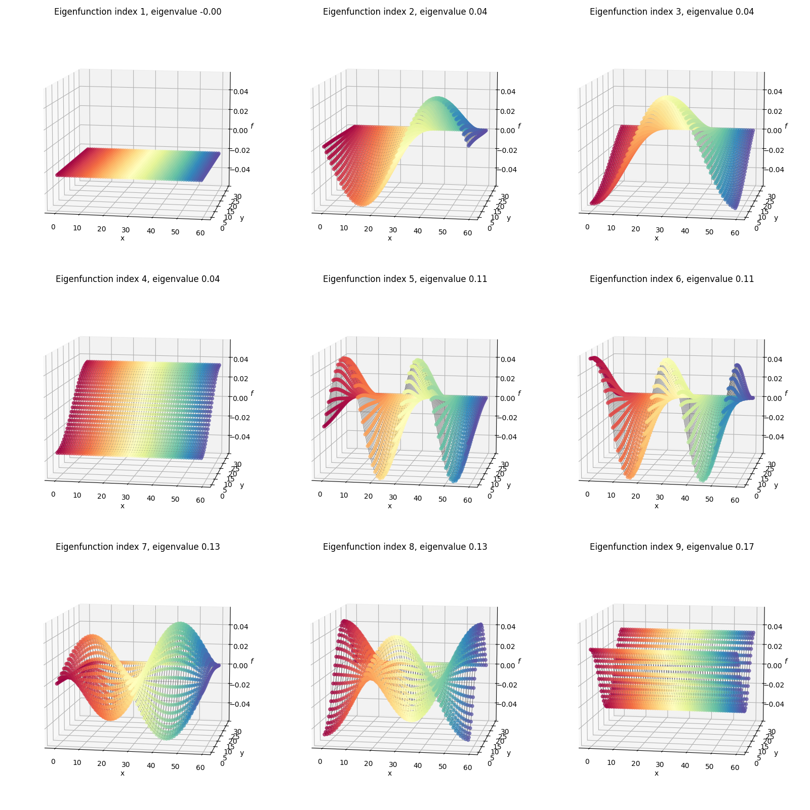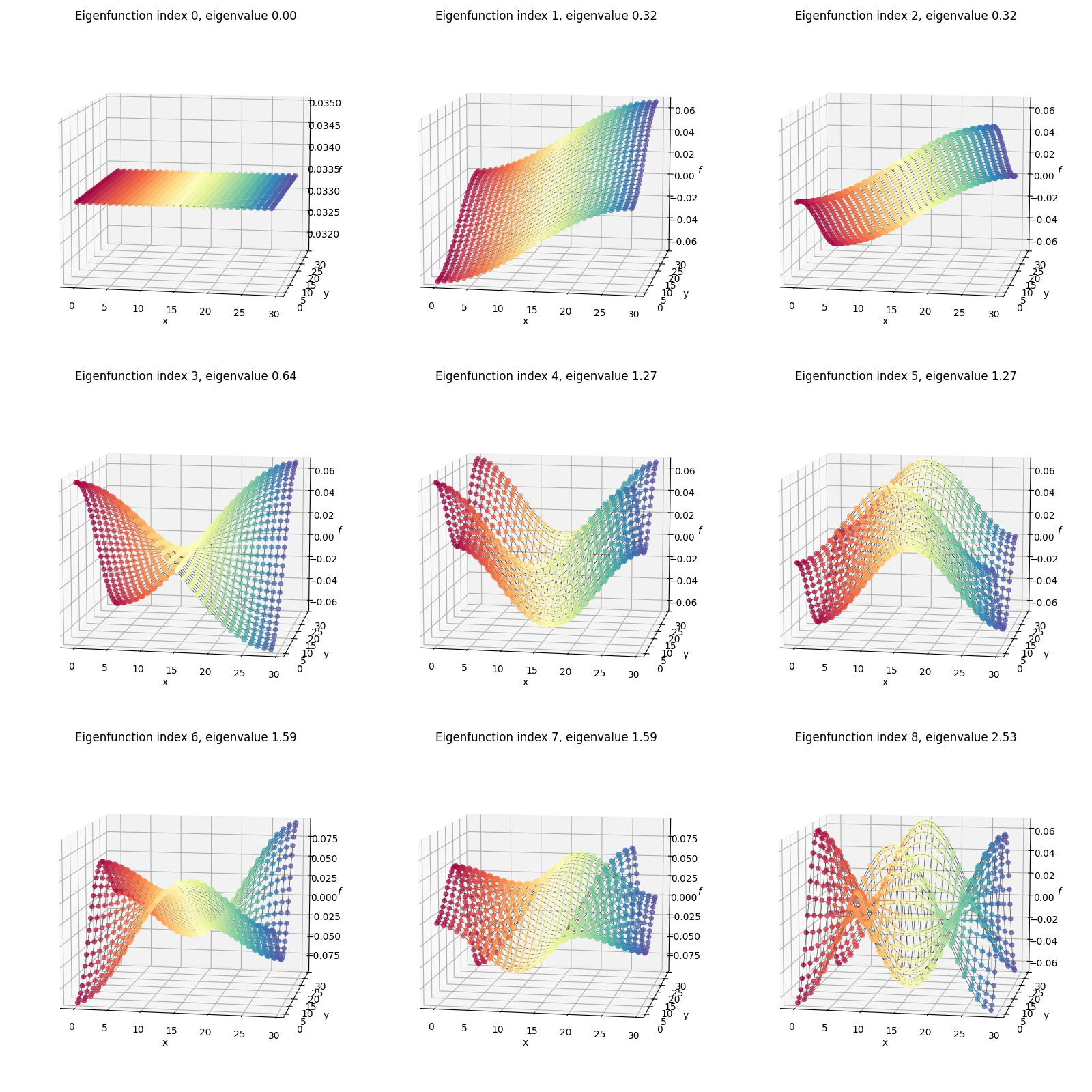 But for 2D, that wouldn’t show us much – the node indices don’t have much relation to their 2D positions in the graph, so the eigenfunction components would be all jumbled in 1D. So to actually see the shapes of the eigenfunctions in a way that makes sense for 2D, we should take each eigenfunction component $i$ and plot it with respect to the 2D position of the graph node with index $i$. I.e., plot the eigenfunction values as heights on a 3D plot, where the $(x, y)$ coordinates are the ones from the original manifold.