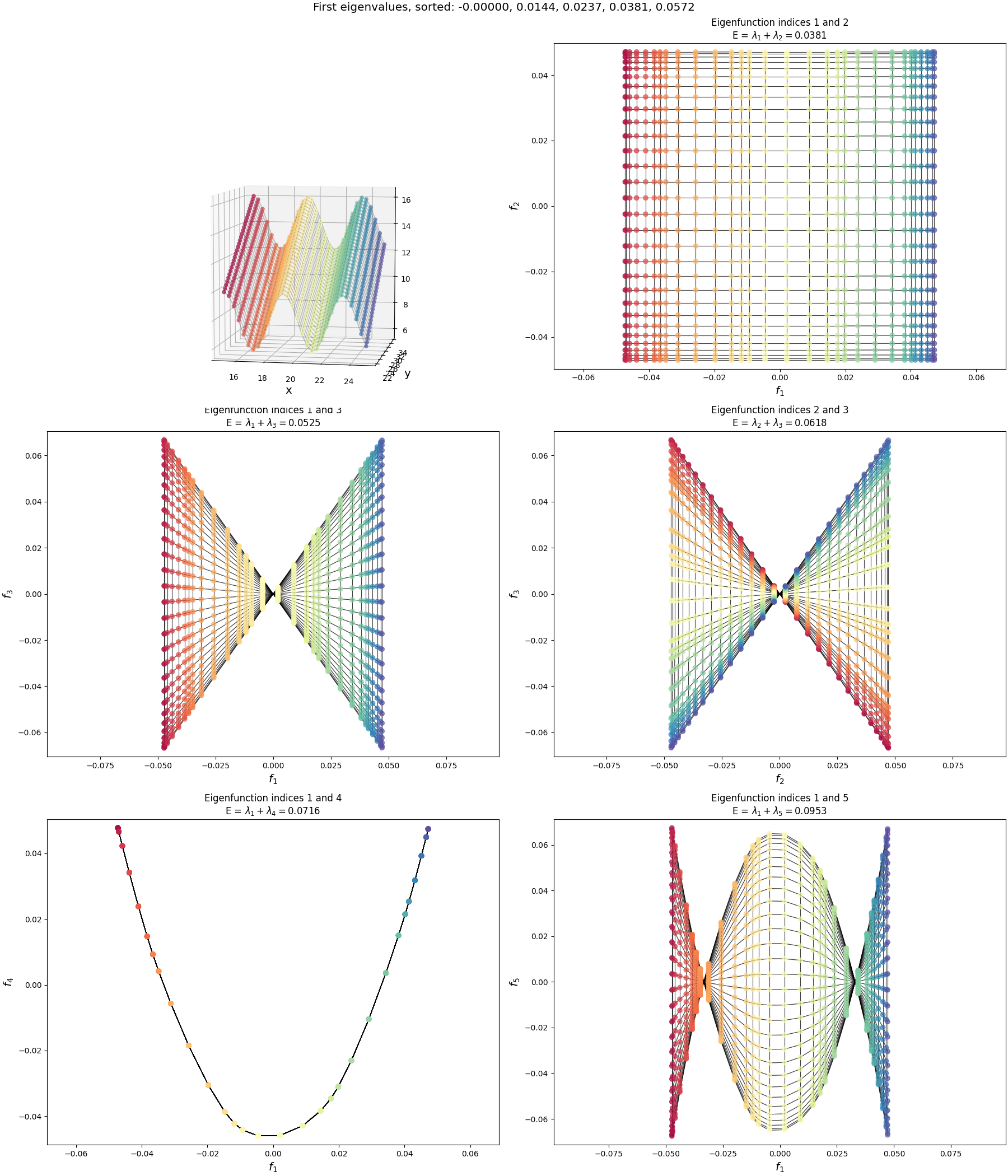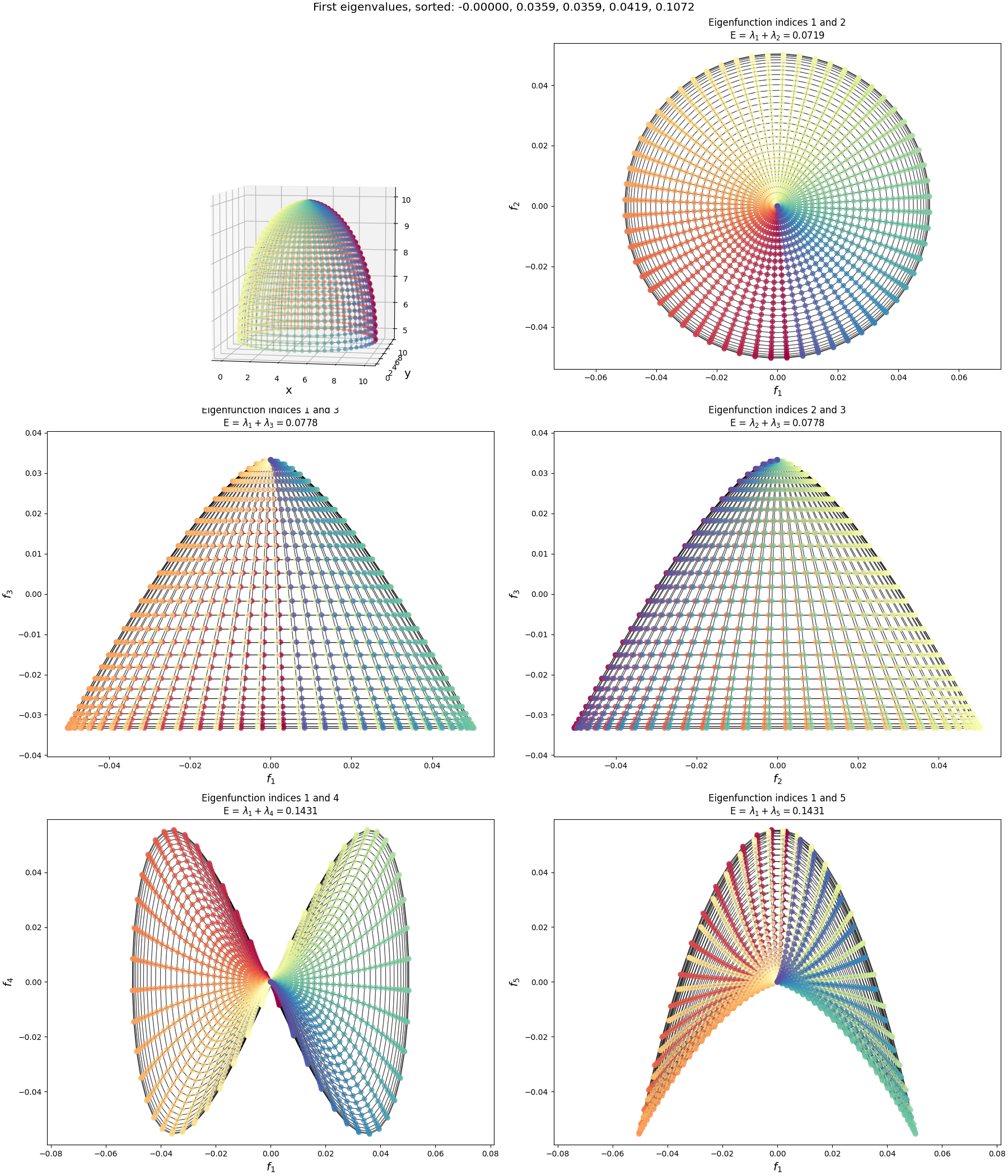 Secondly, I’ve plotted each eigenfunction as a surface colored by the height (eigenfunction value):