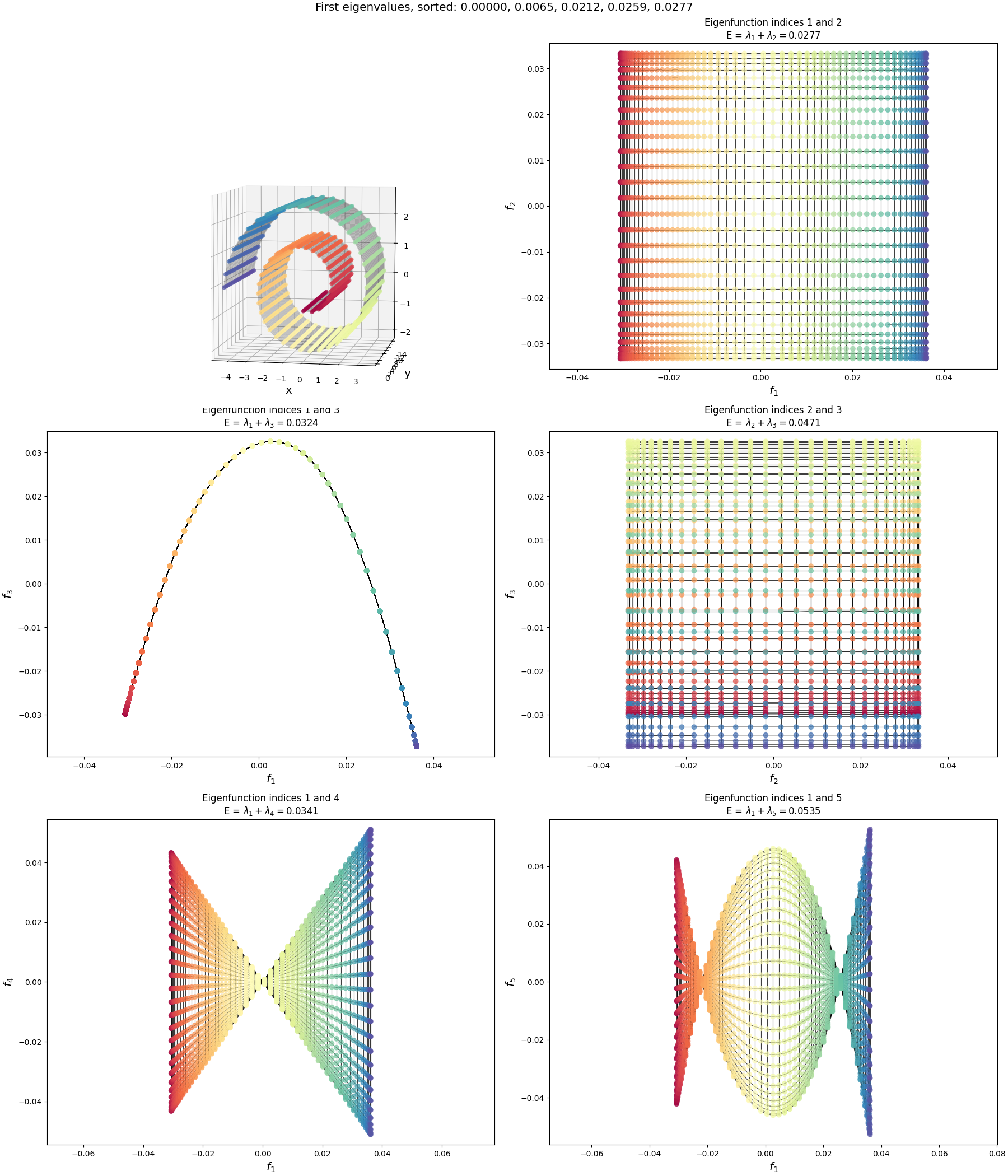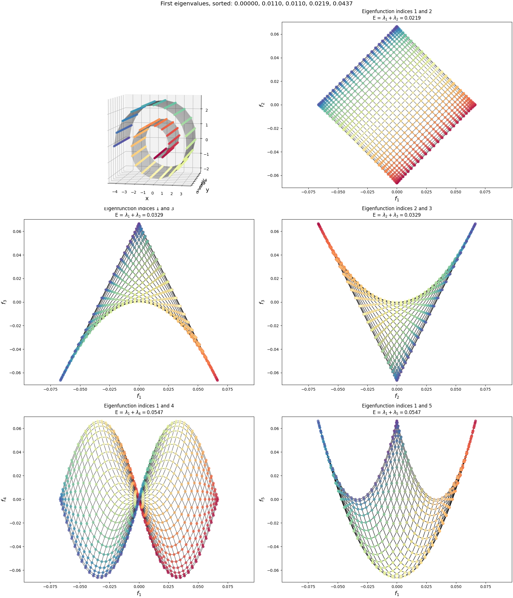 Anyway, it’s more fun to plot the non-constant eigenfunctions against each other. Here, I’ve plotted the first few against each other, along with the actual 1D eigenfunctions on the sides of the plot:
