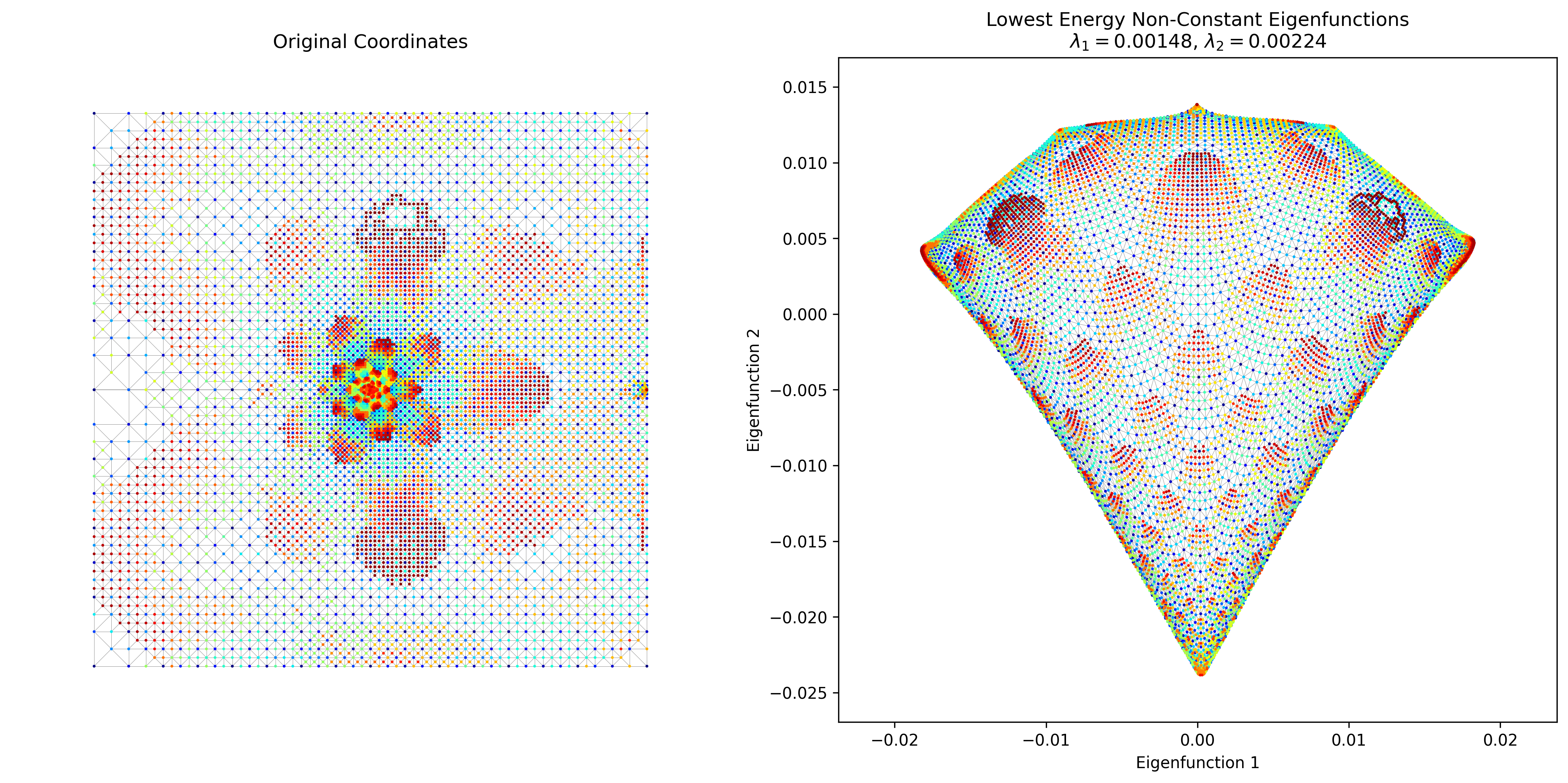 So those are the eigenfunctions themselves. Now let’s do graph drawing with them, where we match them up to embed them in 2D: