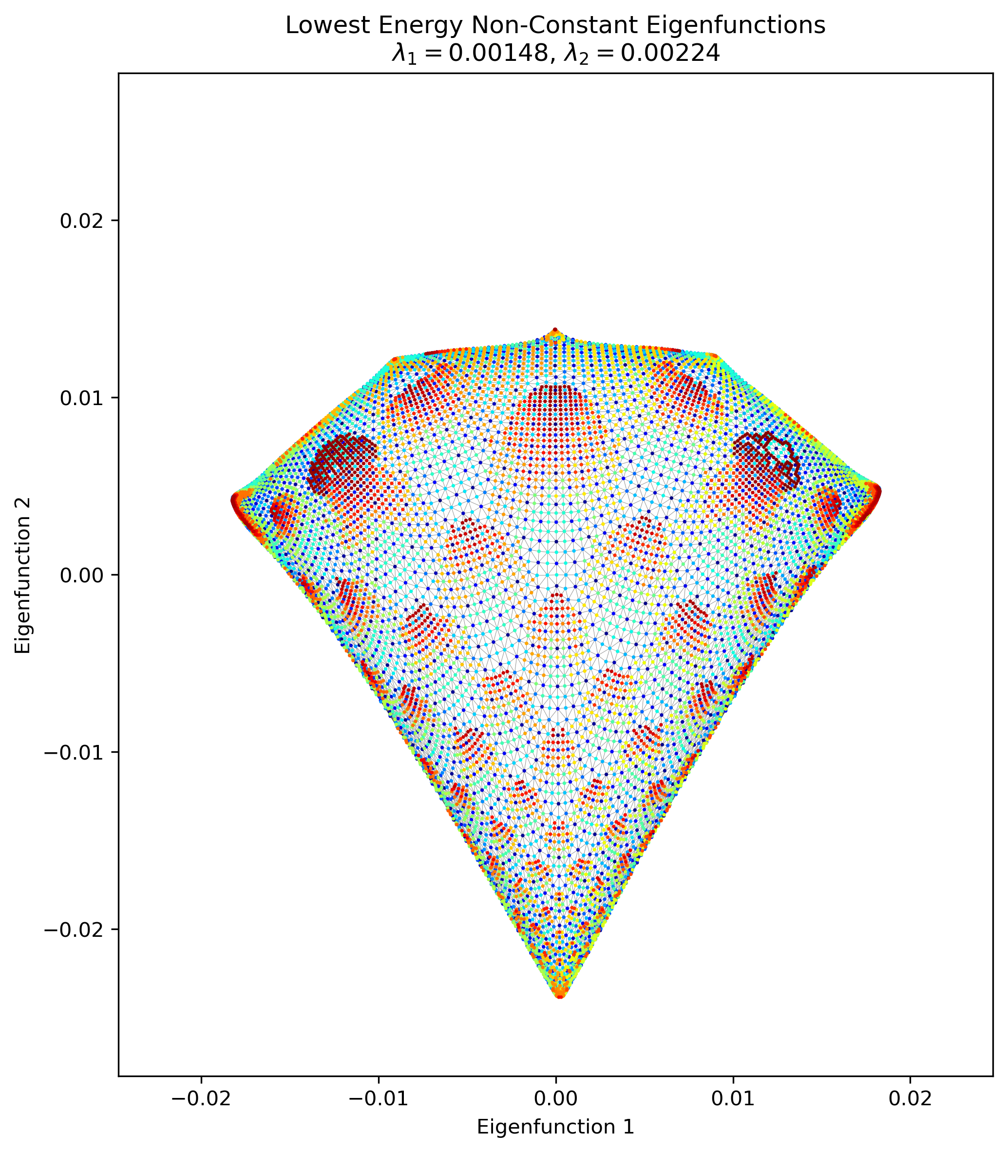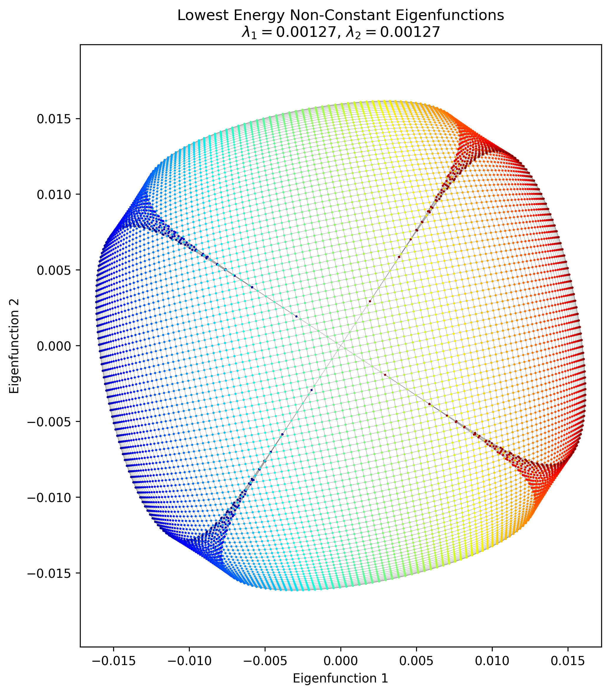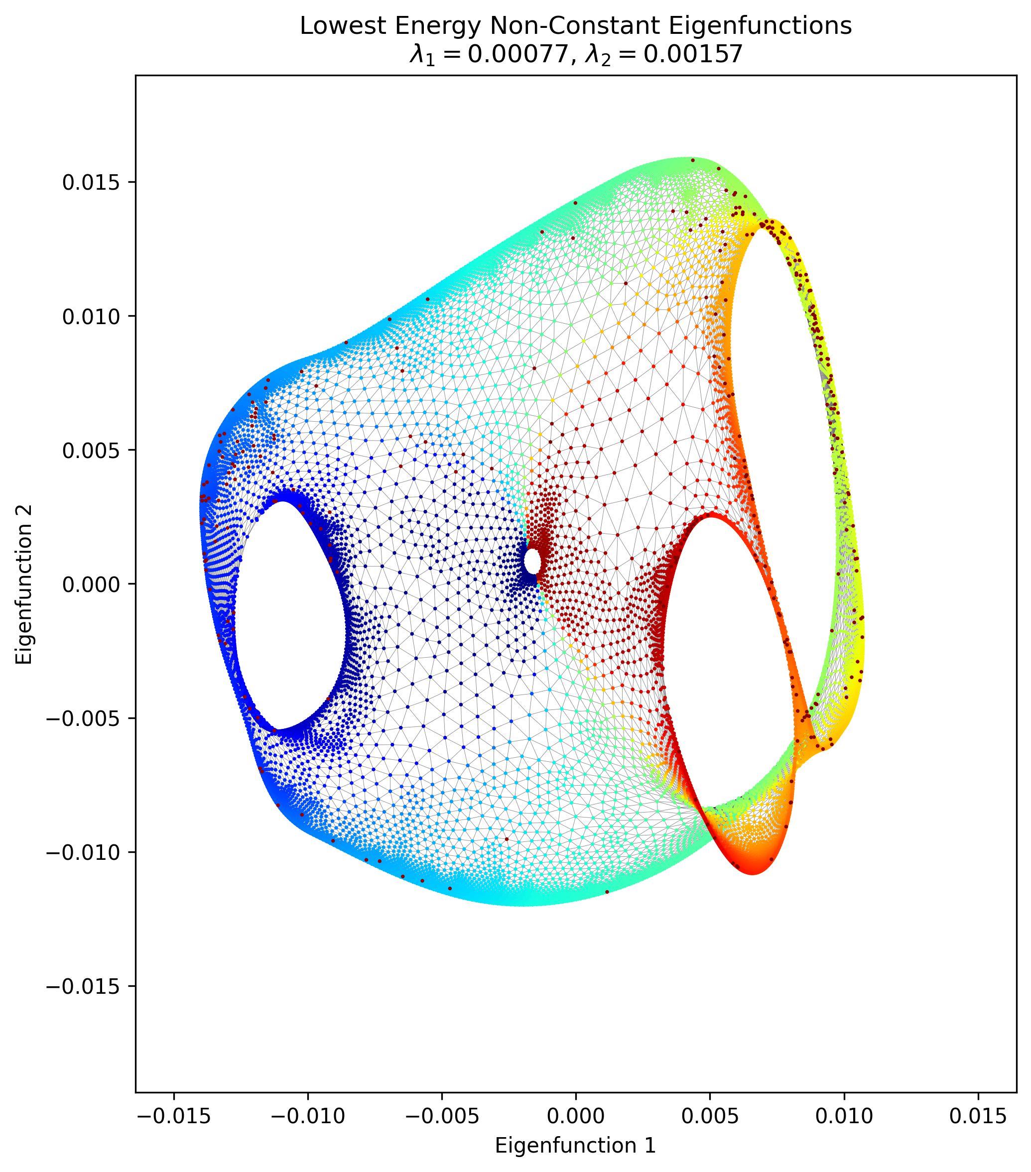 Now we’re effectively taking one of these rows, and matching it with another row point by point, so the pairs of matched points form 2D points, which we can plot in 2D space. For example, even though I said above that we usually skip the first eigenfunction, it’s actually useful to see what the 1st and 2nd eigenfunctions look like plotted together here: