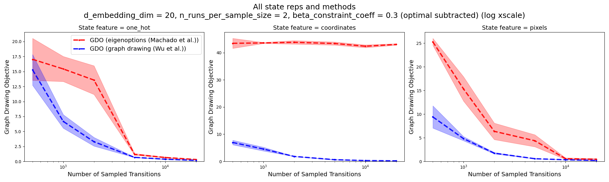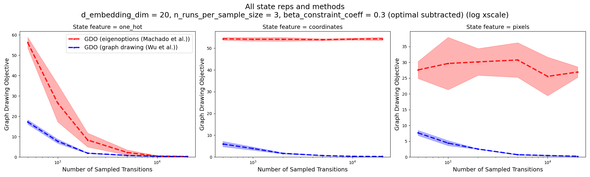 Not bad! It has ballpark the right numbers, and definitely the right shapes. Note that (like theirs above), the x-axis has a log scale. The takeaways we’re supposed to get from this are that 1) their method beats the eigenoptions method at almost all numbers of samples, and 2) for most state representations, and 3) the gap to optimal goes to zero with enough samples for their method, but only goes to zero for one-hot SR for the eigenoptions method.