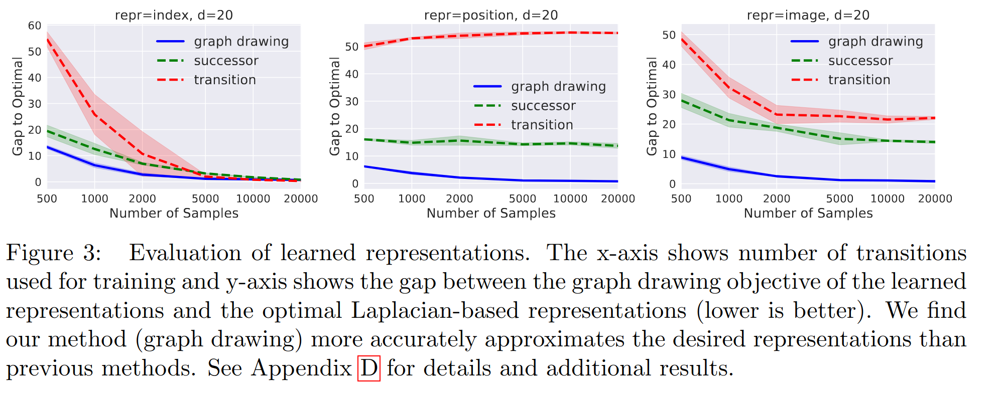Implementation of baselines. Both of the approaches in Machado et al. (2017a) and Machado et al. (2017b) output $d$ eigenoptions $e_1, \dots, e_d \in \mathbb R^m$ where $m$ is the dimension of a state feature space $\psi : S \rightarrow \mathbb R^m$, which can be either the raw representation (Machado et al., 2017a) or a representation learned by a forward prediction model (Machado et al., 2017b). Given the $d$ eigenoptions, an embedding can be obtained by letting $f_i(s) = \psi(s)^\intercal e_i$. Following their theoretical results it can be seen that if $\psi$ is the one-hot representation of the tabular states and the stacked rows contains unique enumeration of all transitions/states $\phi = [f_1, \dots, f_d]$ spans the same subspace as the smallest $d$ eigenvectors of the Laplacian.