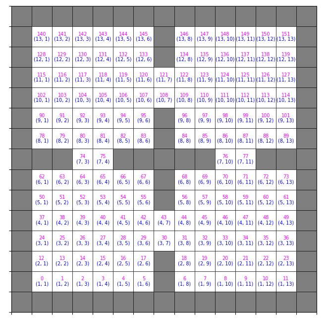 1) a one-hot vector (length $152$ in this case) where the agent’s cell index is 1, 2) a coordinates representation that’s the agent’s $(x, y)$ coordinates you see in the maze above, normalized to be in $[-1, 1]^2$, and 3) an image based one that’s a $15 \times 15 \times 3$ RGB image, where the agent’s cell is colored red
