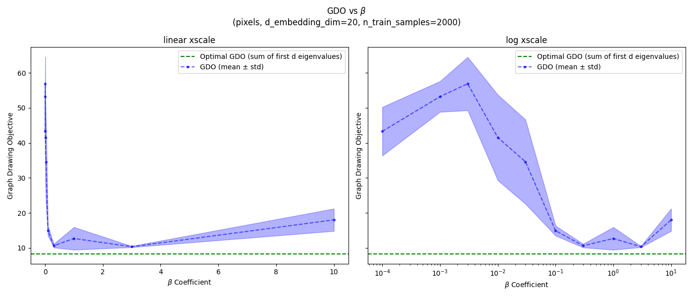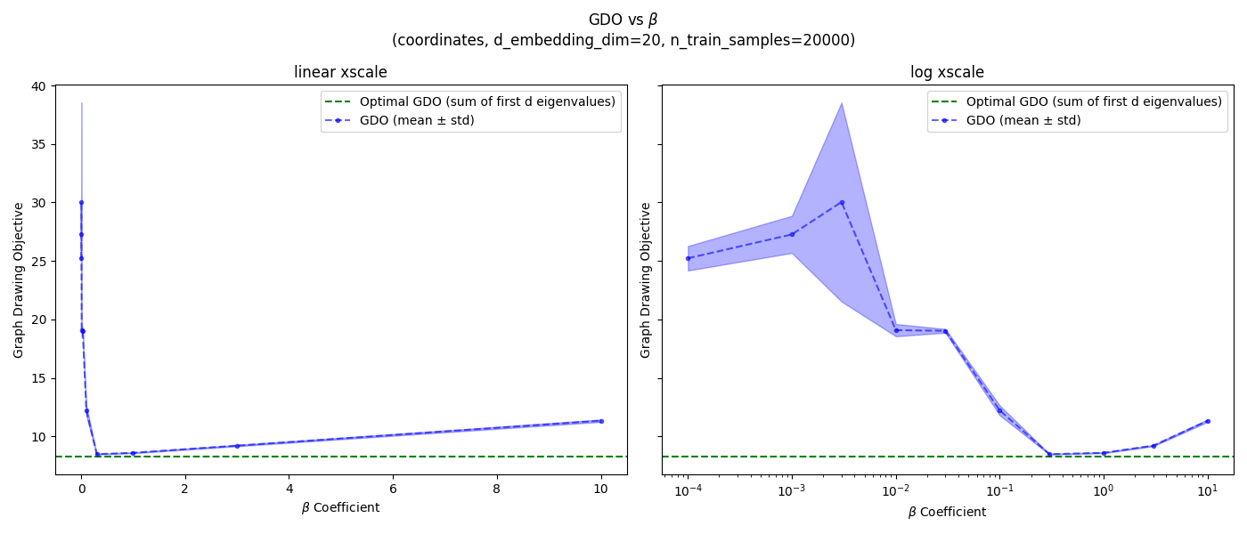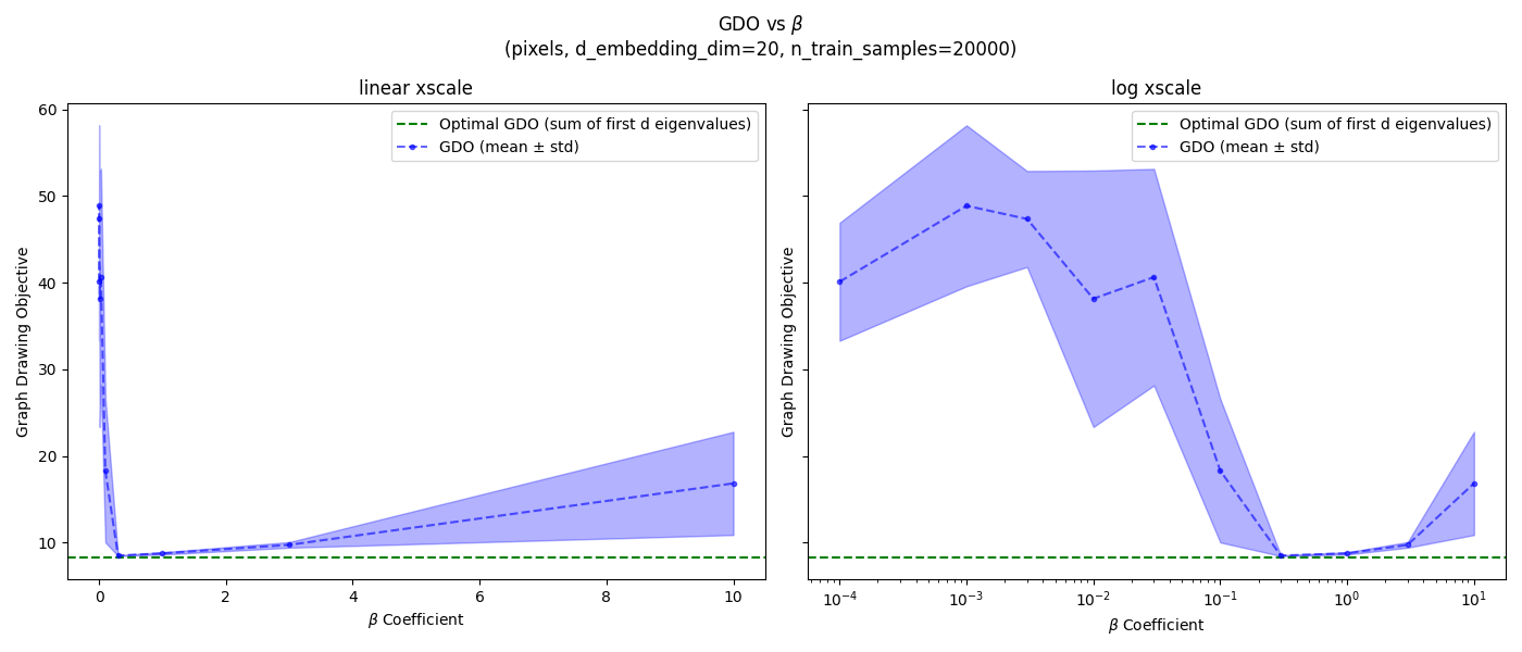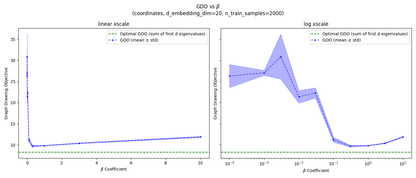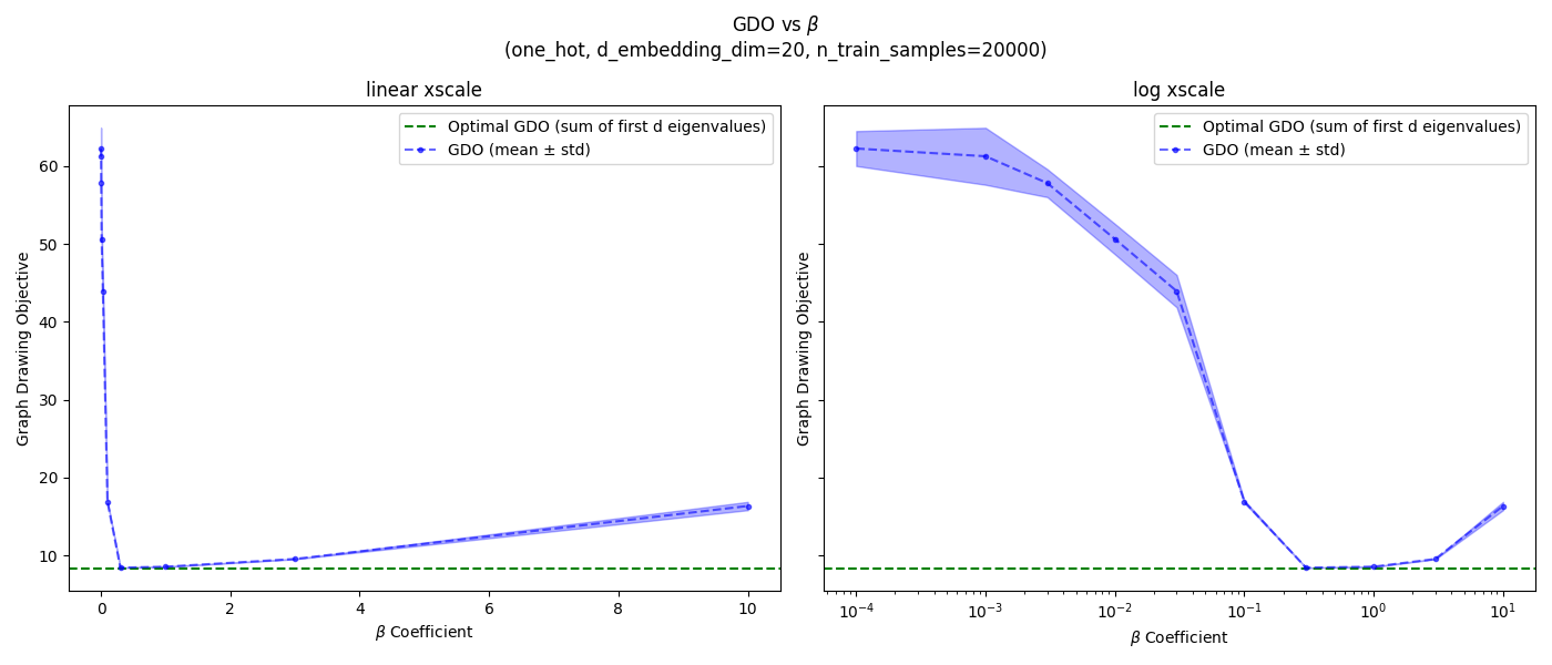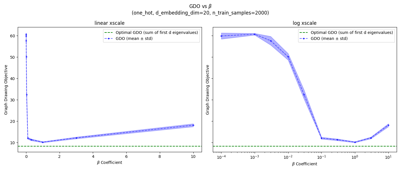 One more thing: the GDO in those plots increases with larger $\beta$, since it’s a harder optimization problem. But you might notice that it also increases with very small $\beta$, which might seem weird because small $\beta$ means that it could minimize the GDO without having to worry about satisfying the constraint as much. What gives?