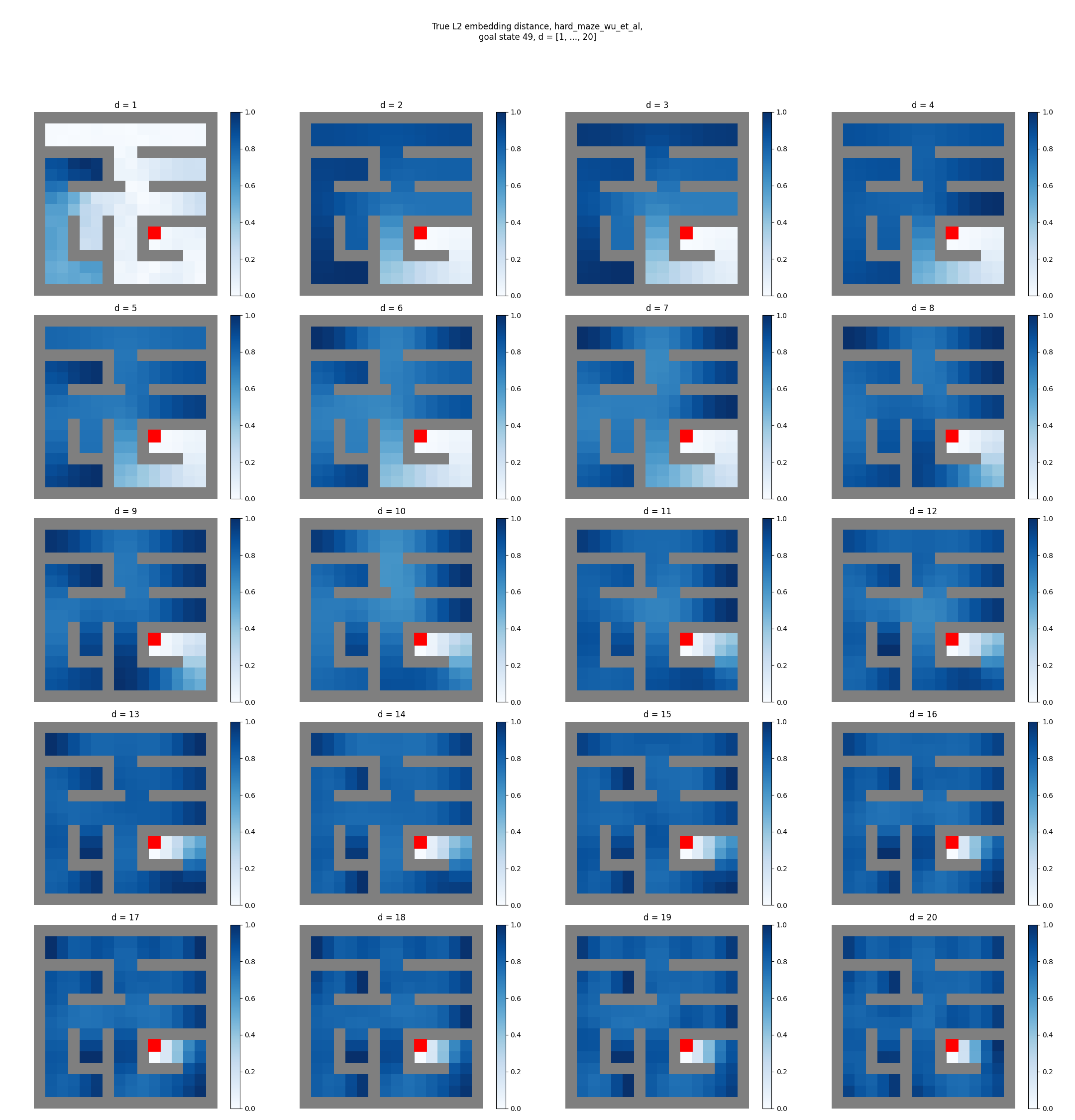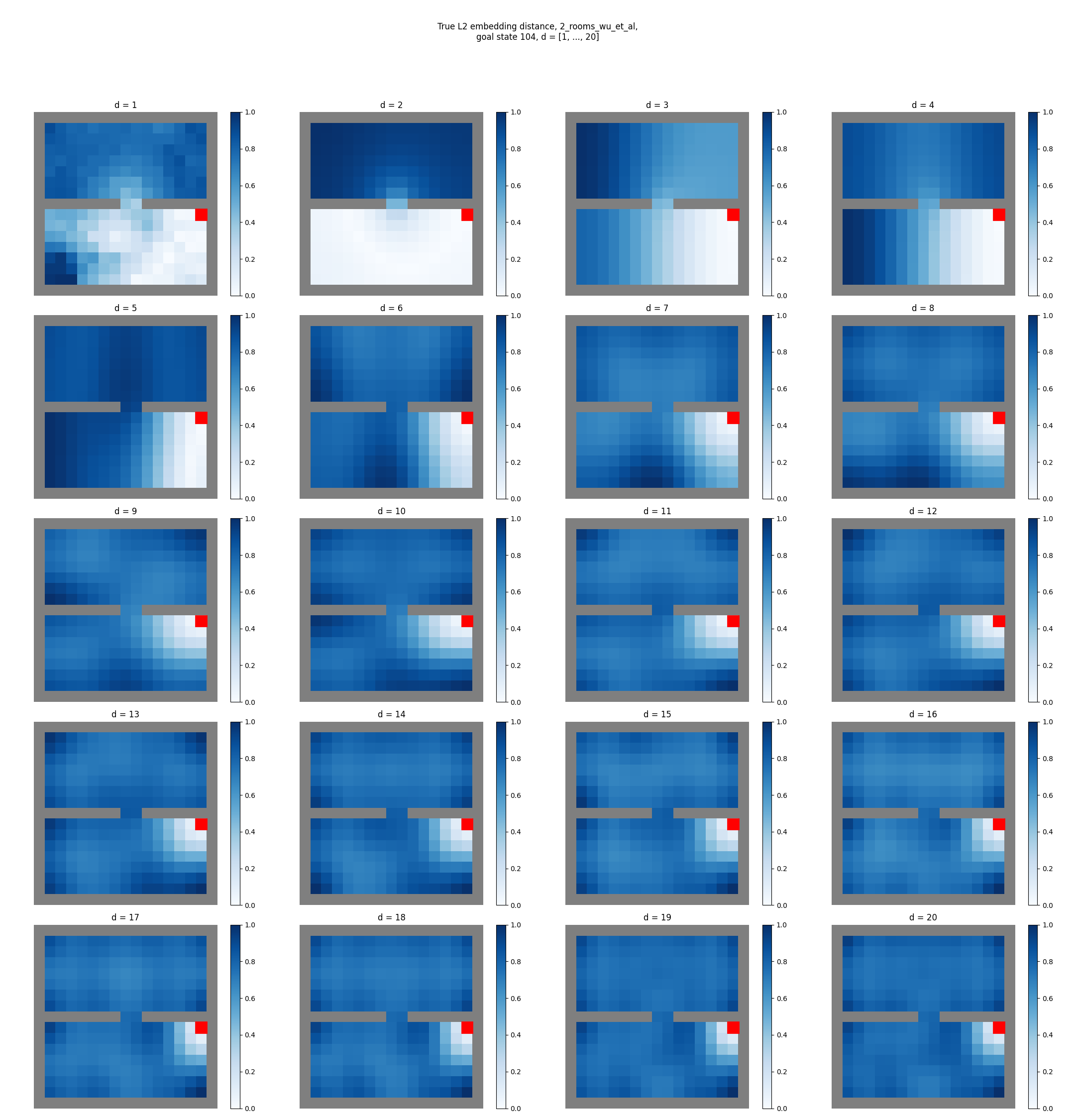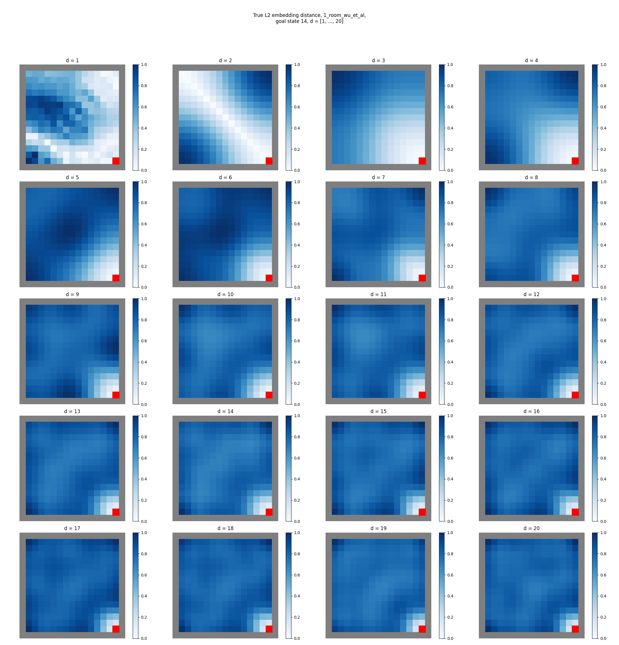 You can see that for each, as we increase $d$, it seems like it has the effect of “washing out” the reward function at most distances away from the goal (note that the $d=1$ embedding distance looks a bit weird, because it contains only 1st eigenfunction which is ~constant, but I divide each embedding distance by its max, which magnifies those very small differences).
