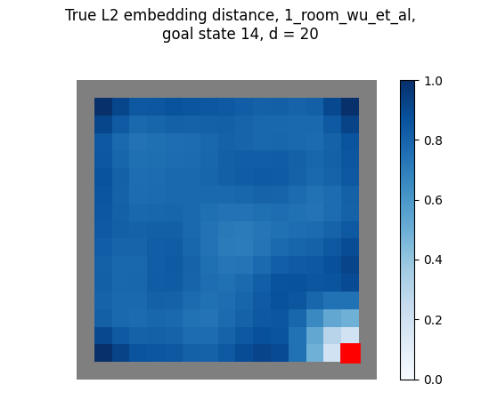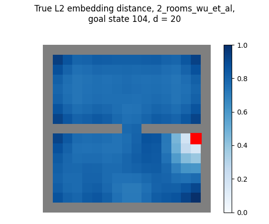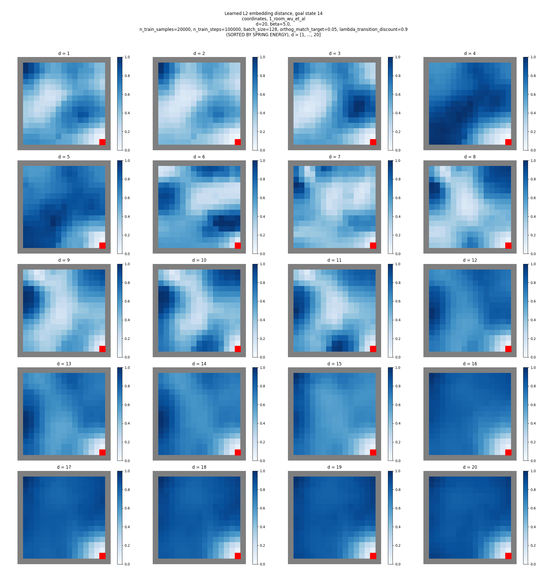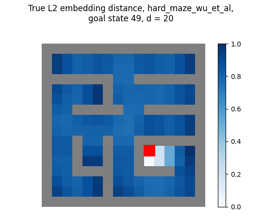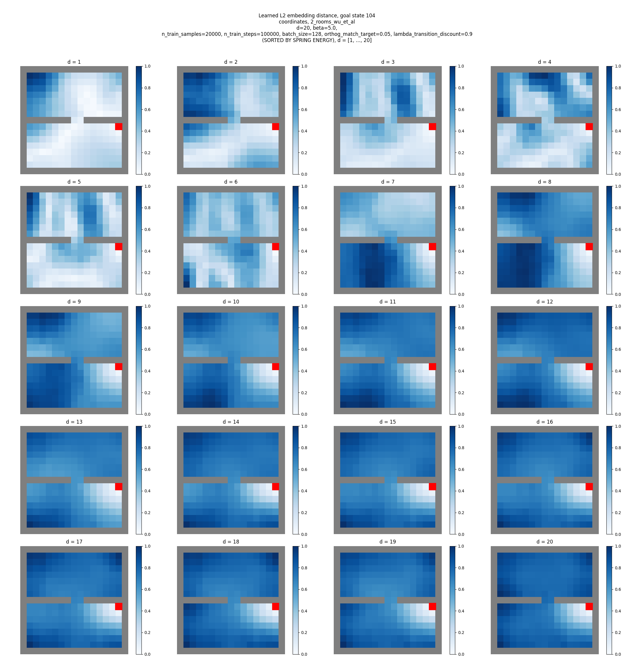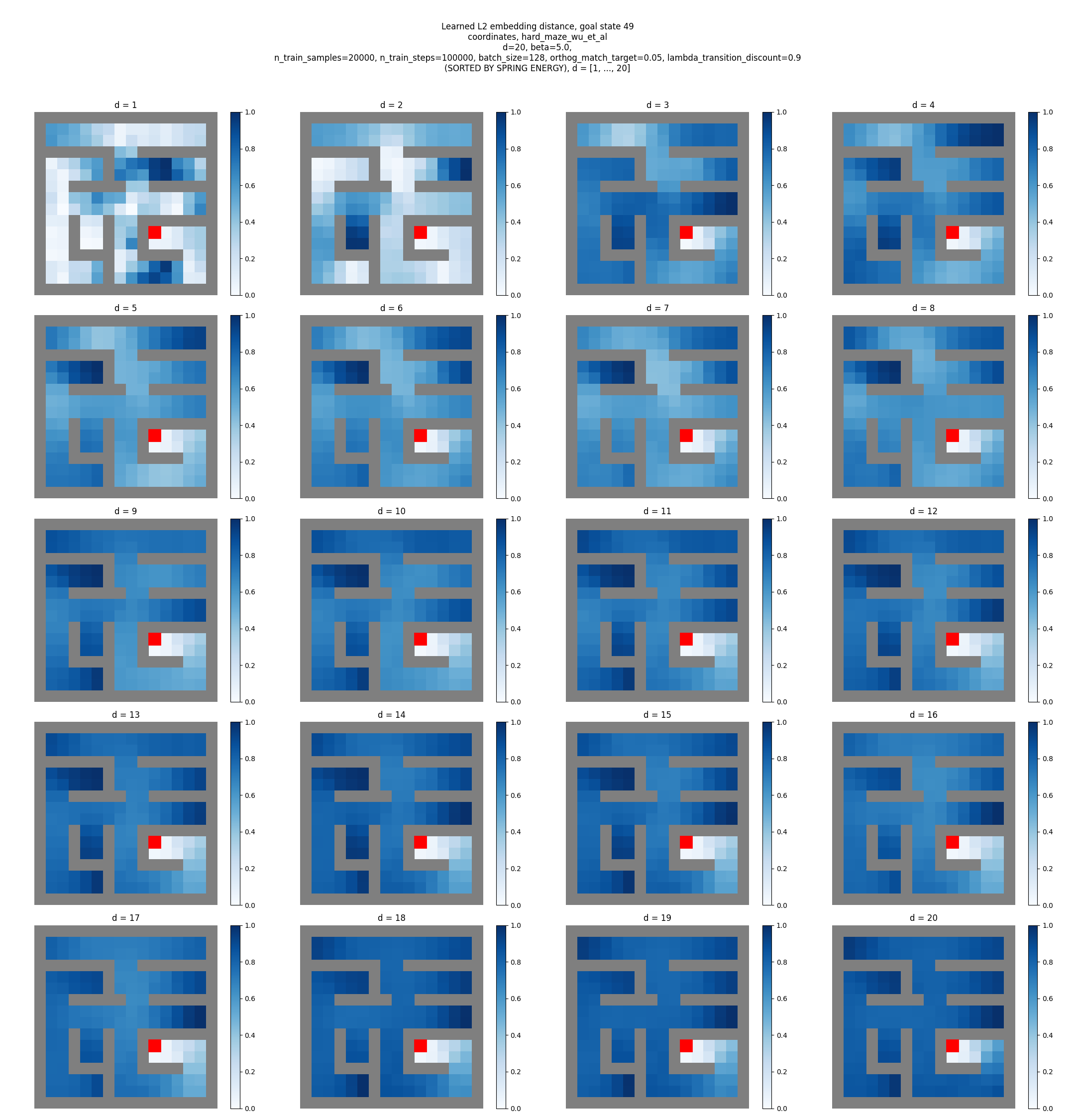 You can see that for each, as we increase $d$, it seems like it has the effect of “washing out” the reward function at most distances away from the goal (note that the $d=1$ embedding distance looks a bit weird, because it contains only 1st eigenfunction which is ~constant, but I divide each embedding distance by its max, which magnifies those very small differences).