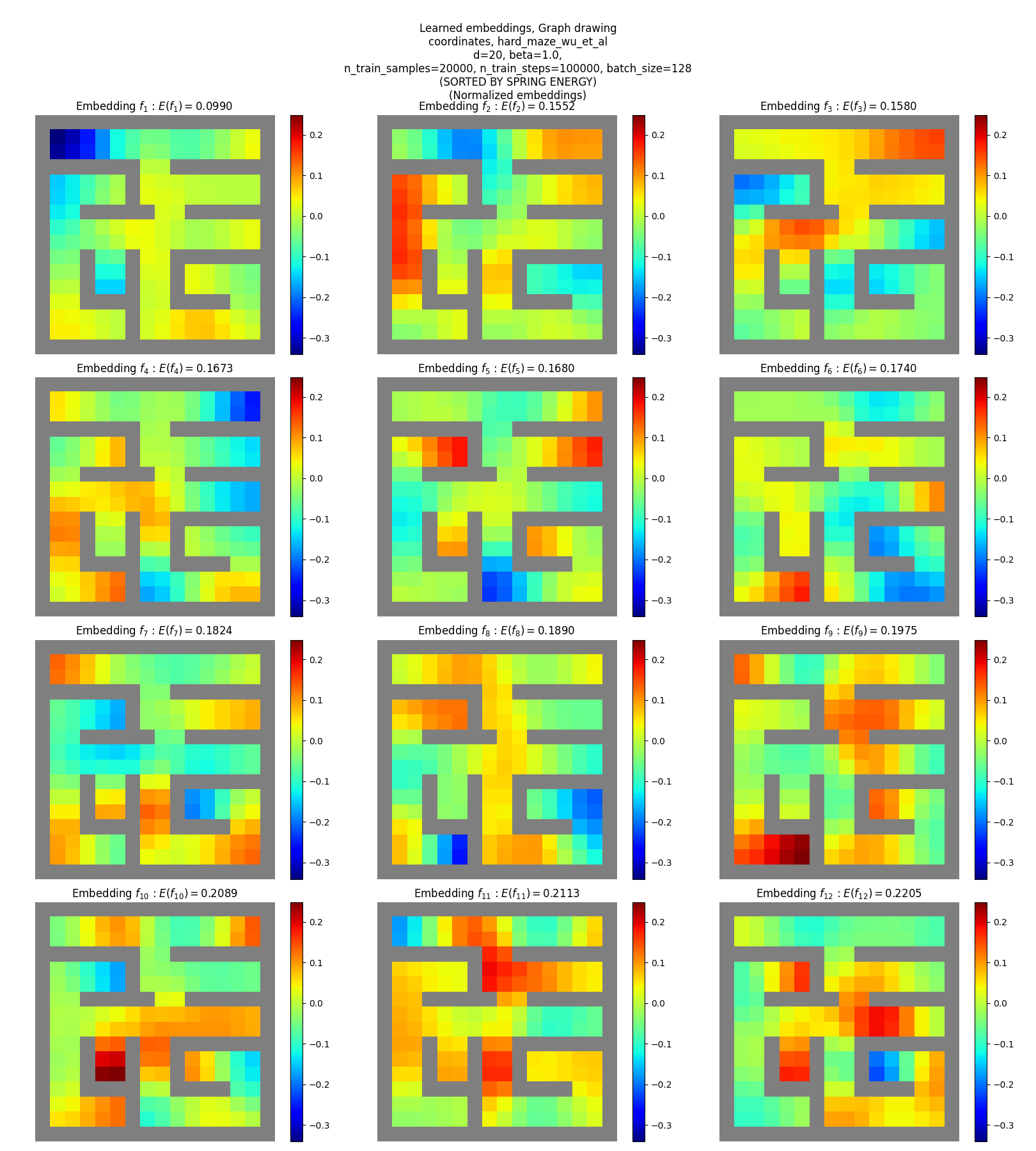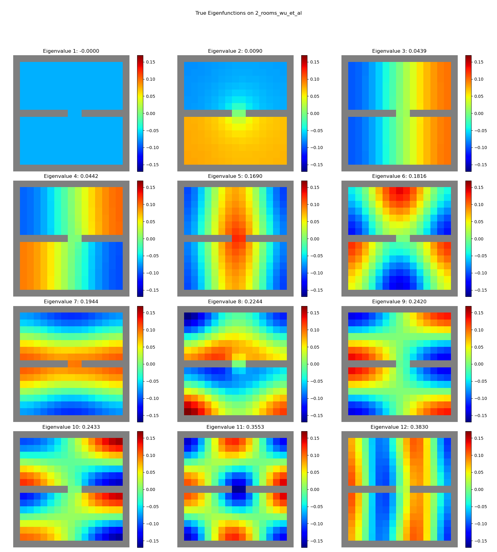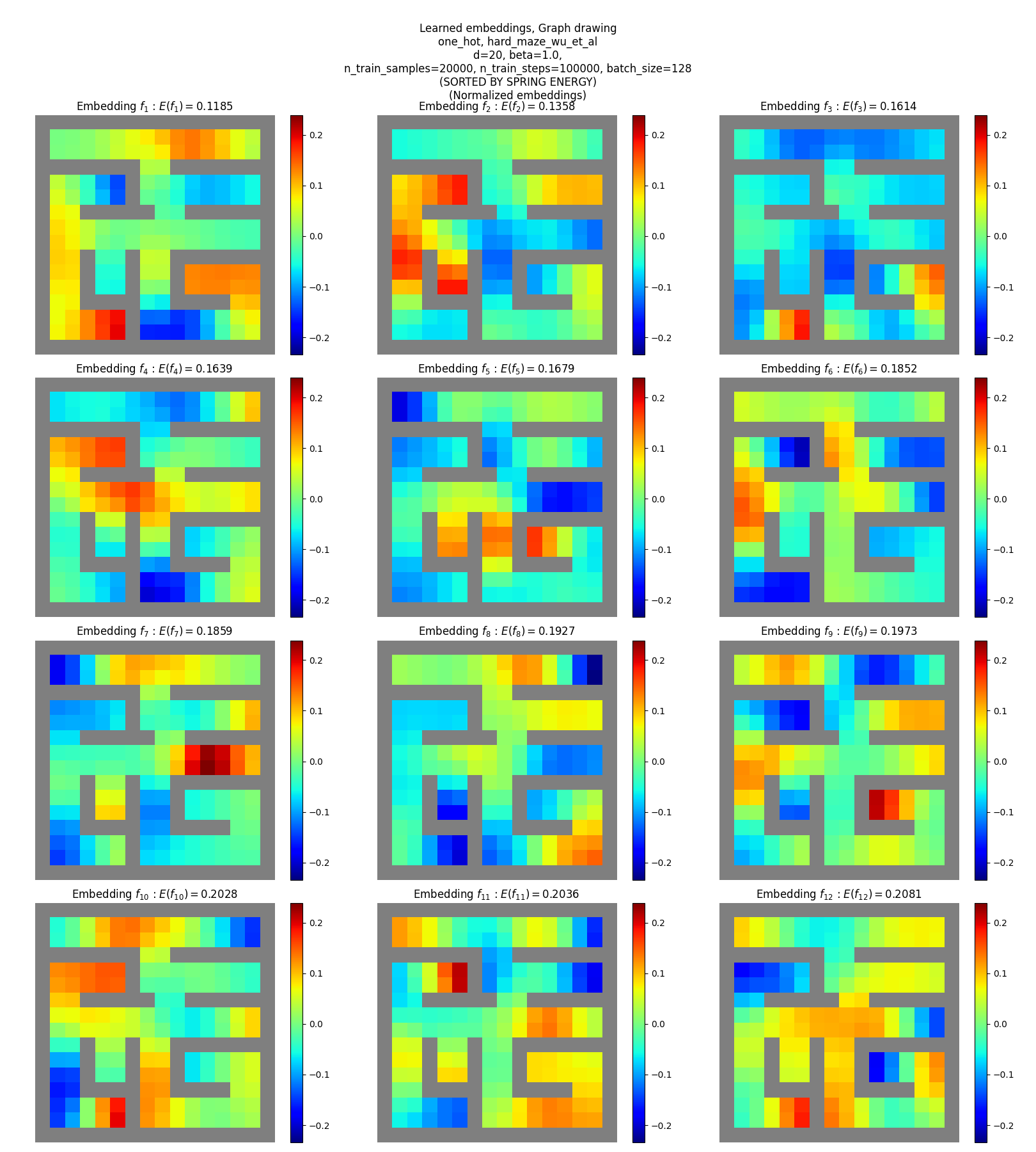 First, let’s actually make these with the true eigenfunctions (which we can just solve for) as a sanity check. So to be clear, I’m finding the eigenfunctions of each maze using np.linalg.eigh on the Laplacian matrix defined by the adjacency matrix.