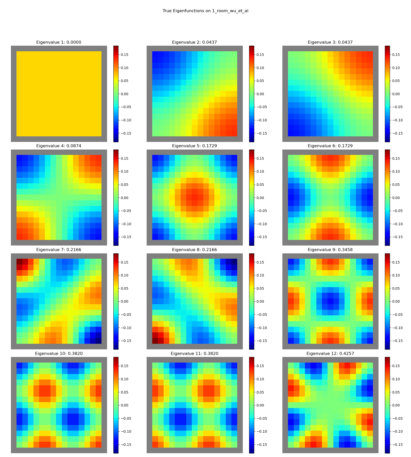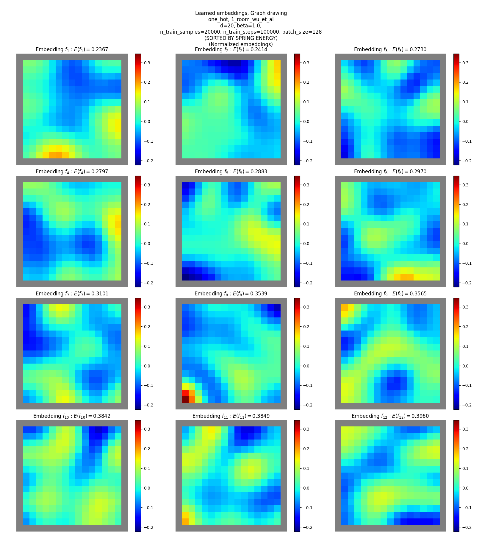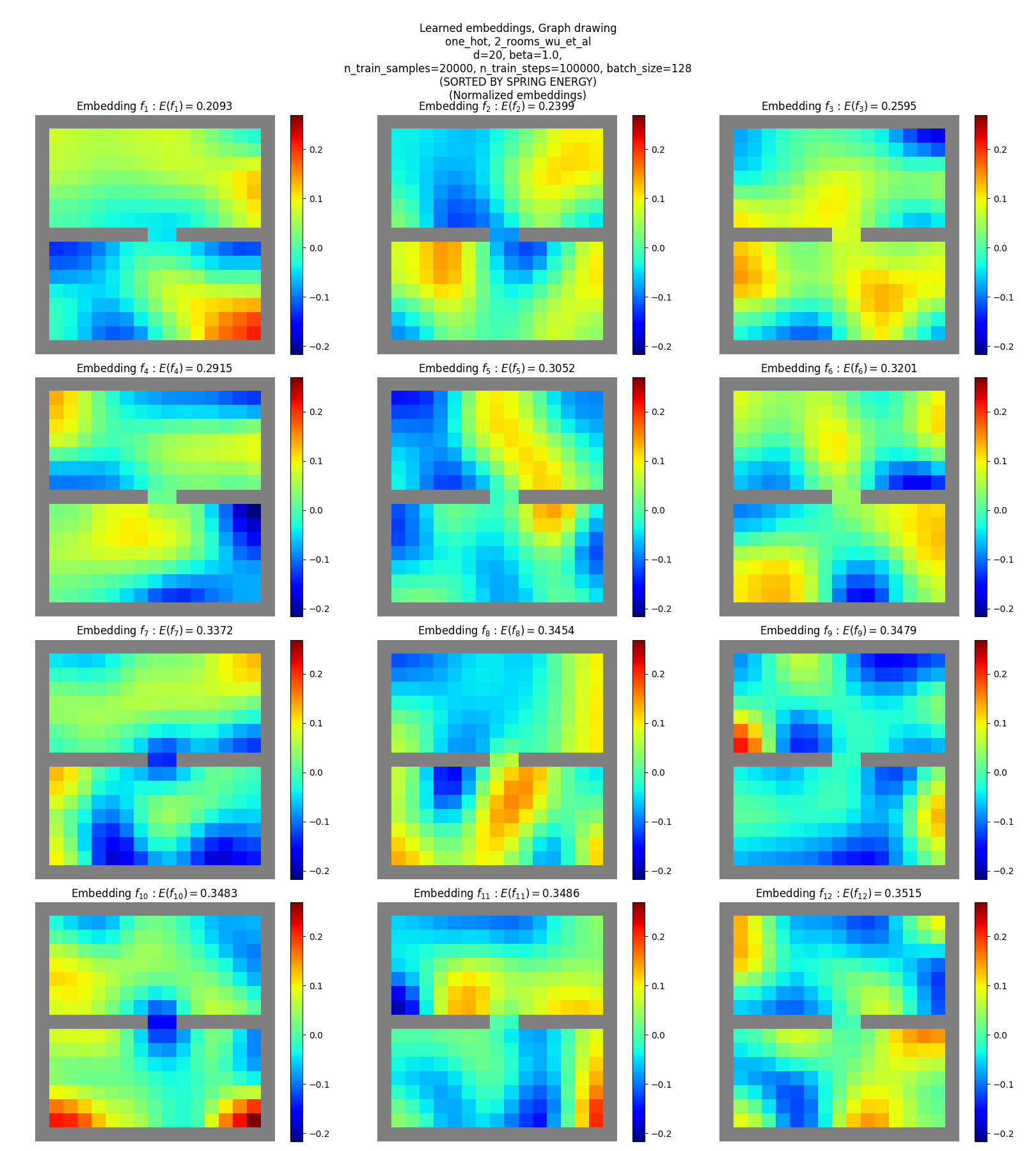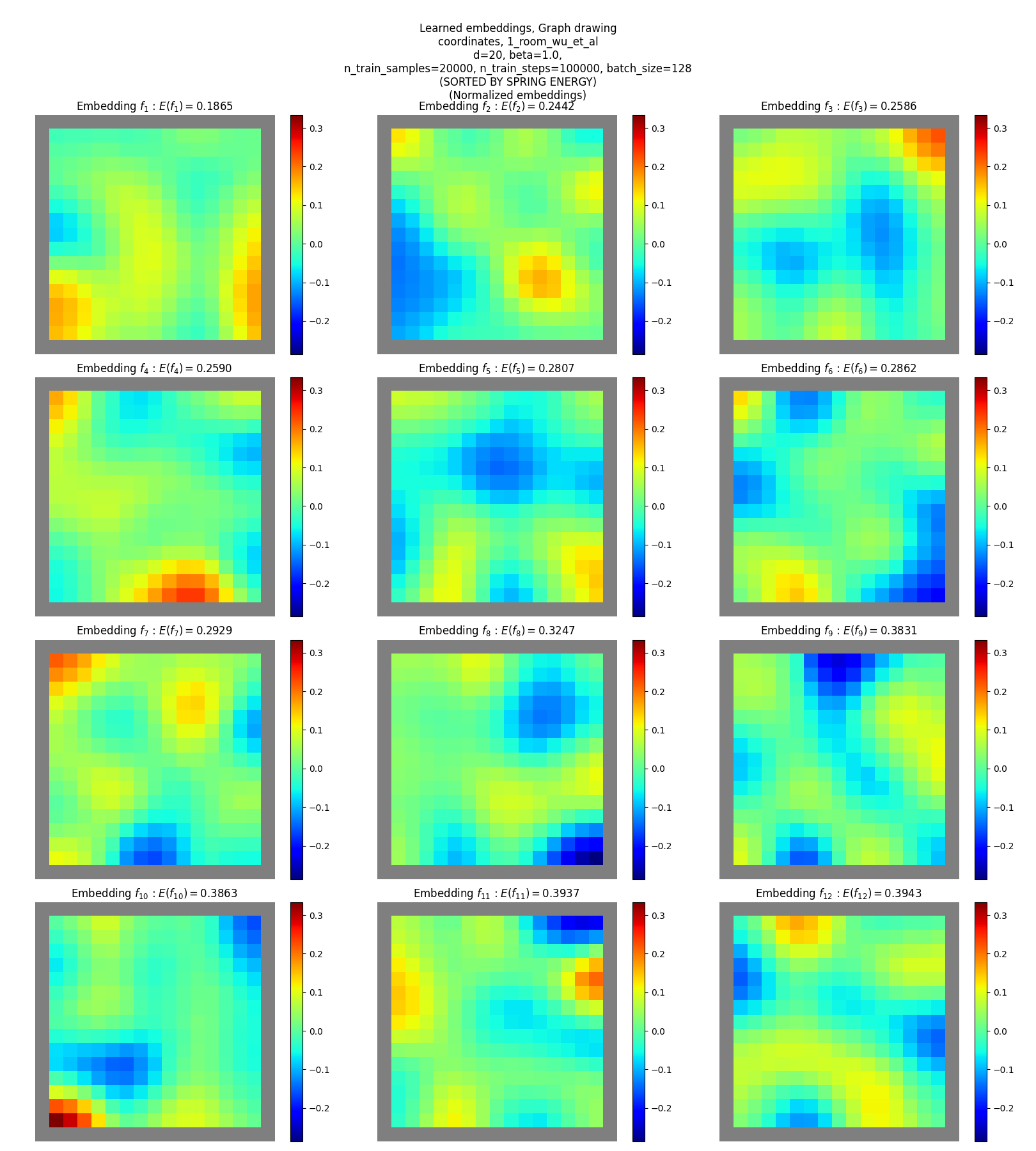 First, let’s actually make these with the true eigenfunctions (which we can just solve for) as a sanity check. So to be clear, I’m finding the eigenfunctions of each maze using np.linalg.eigh on the Laplacian matrix defined by the adjacency matrix.