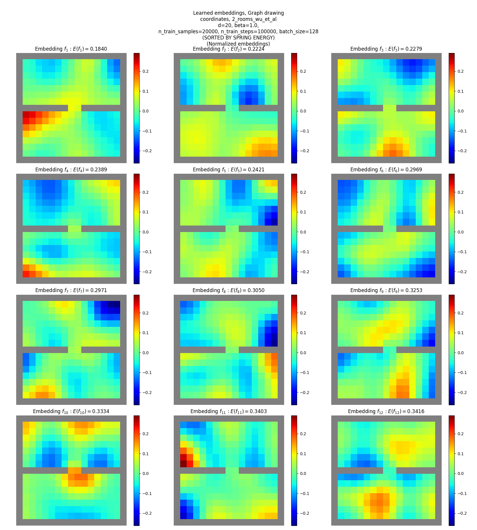 That said, these are the true eigenfunctions, and therefore probably of better quality in some way. Now let’s try it with the learned embeddings. There are a few details here I won’t go into too deeply, but a few big differences they do from the earlier stuff are: