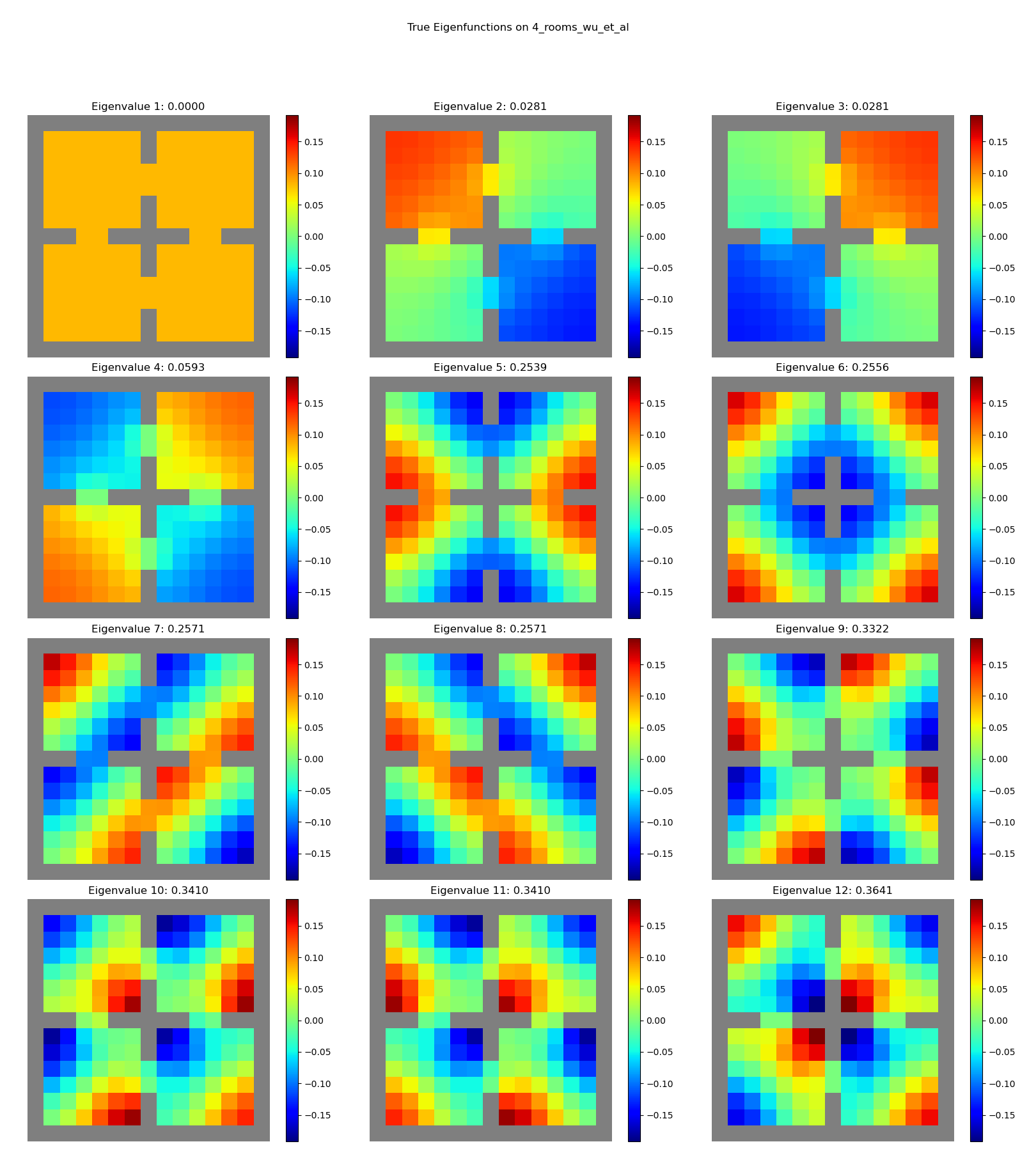 In the appendix, they say they use $d = 20$ for the gridworld reward shaping experiments. So if I use the first 20 true eigenfunctions for the mazes above, I get: