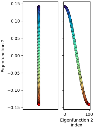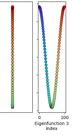 - The next eigenfunction (red) looks pretty close to a straight line, but it’s actually not. We can see why if we pretend it starts as an actual line centered at zero and think about what would happen to it given the objective we know the eigenfunctions minimize: all the nodes want to move closer to each other while maintaining orthogonality to the other eigenfunctions (and maintaining a unit magnitude). In this case, the only eigenfunction so far is the constant one, so orthogonality with that is already satisfied since it’s symmetric around zero.