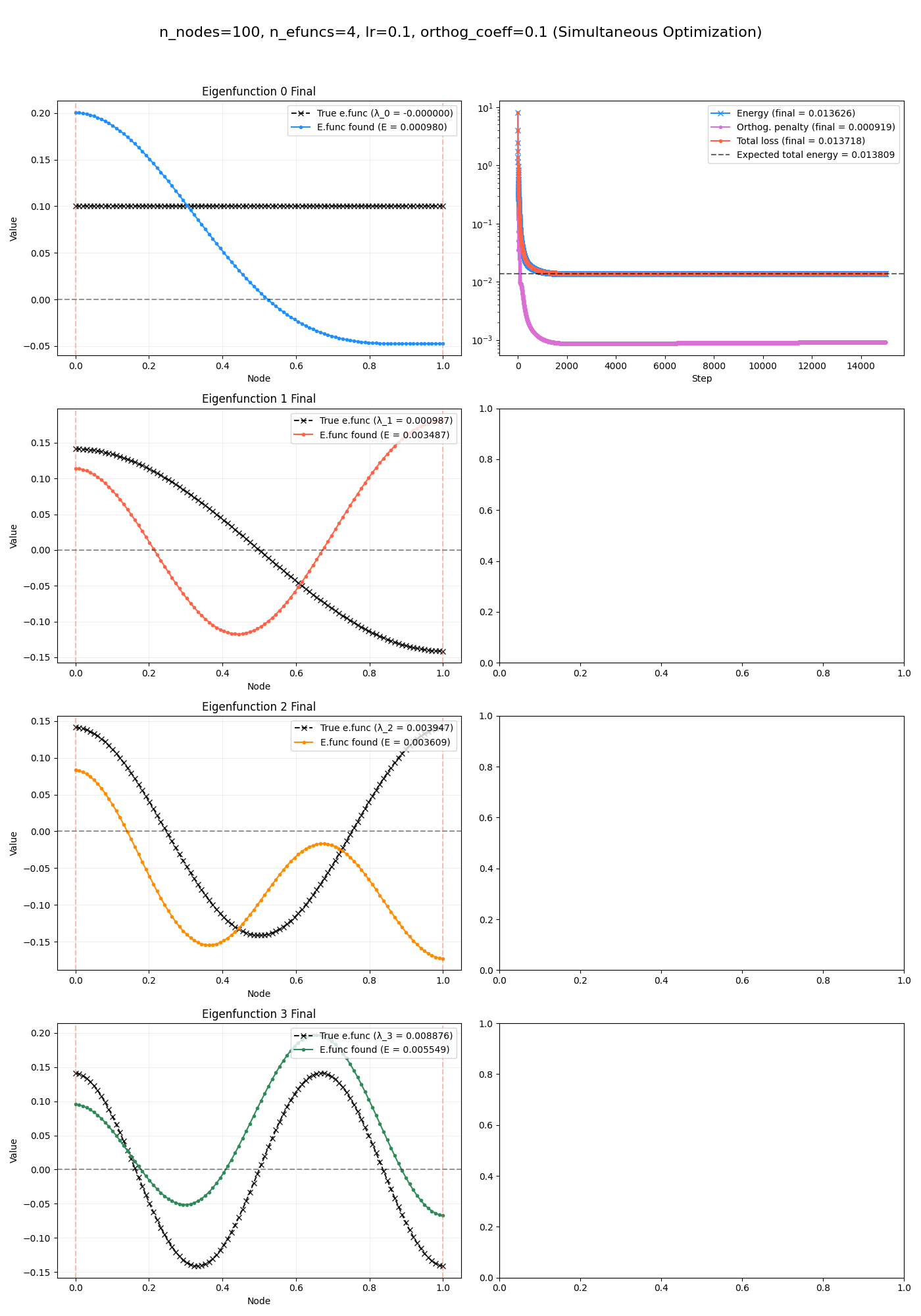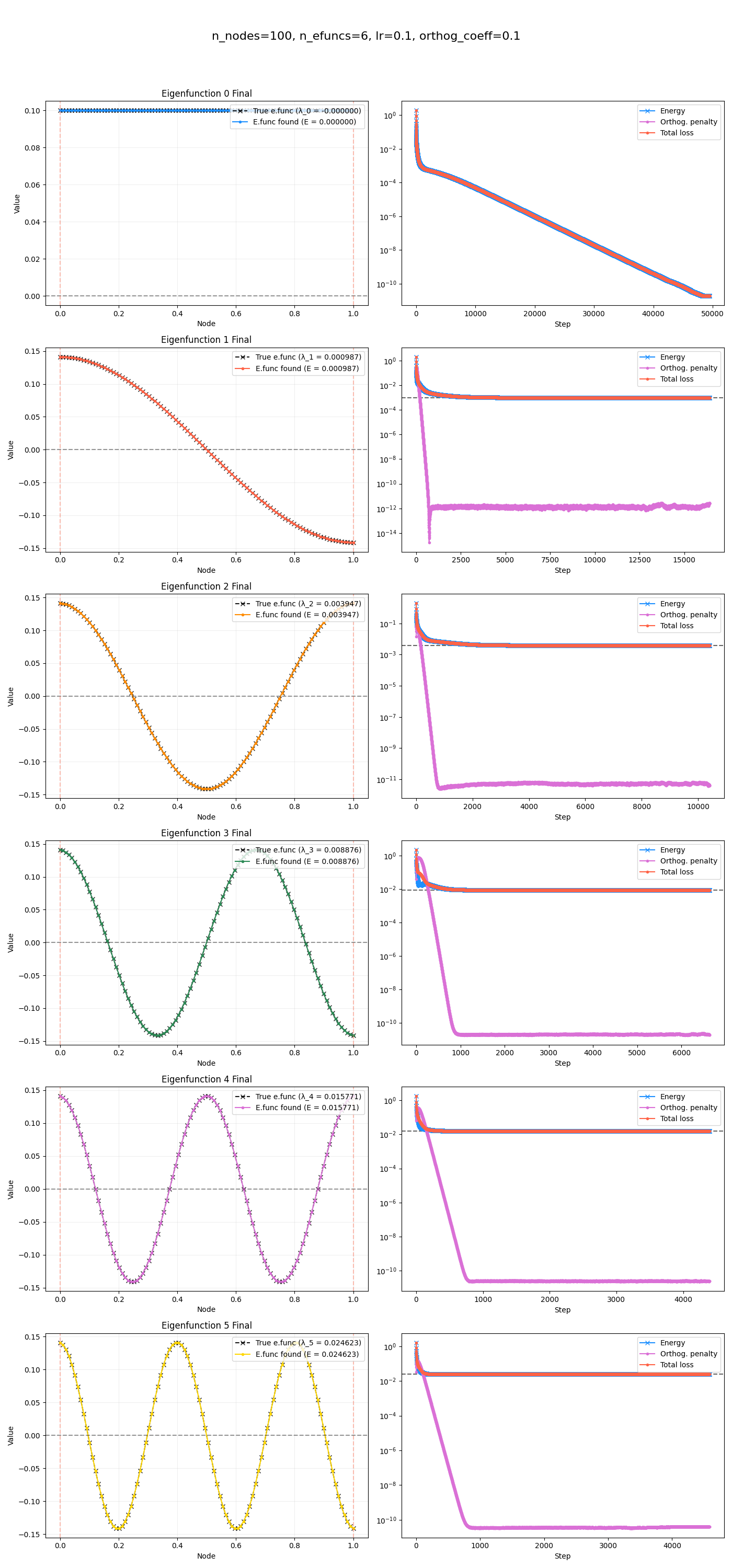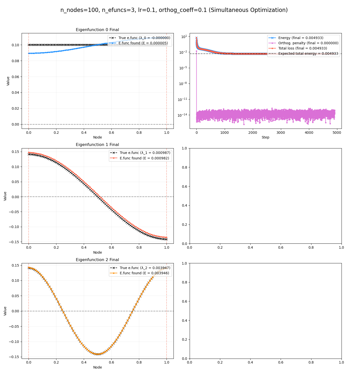 In the left column are the optimized eigenfunctions (in color) and the true eigenfunctions (black); you can see they’re basically exact. The legend also shows the spring energy for each of them. The right column shows the loss terms for each eigenfunction’s optimization; I have it stop when the loss hasn’t decreased for some steps.