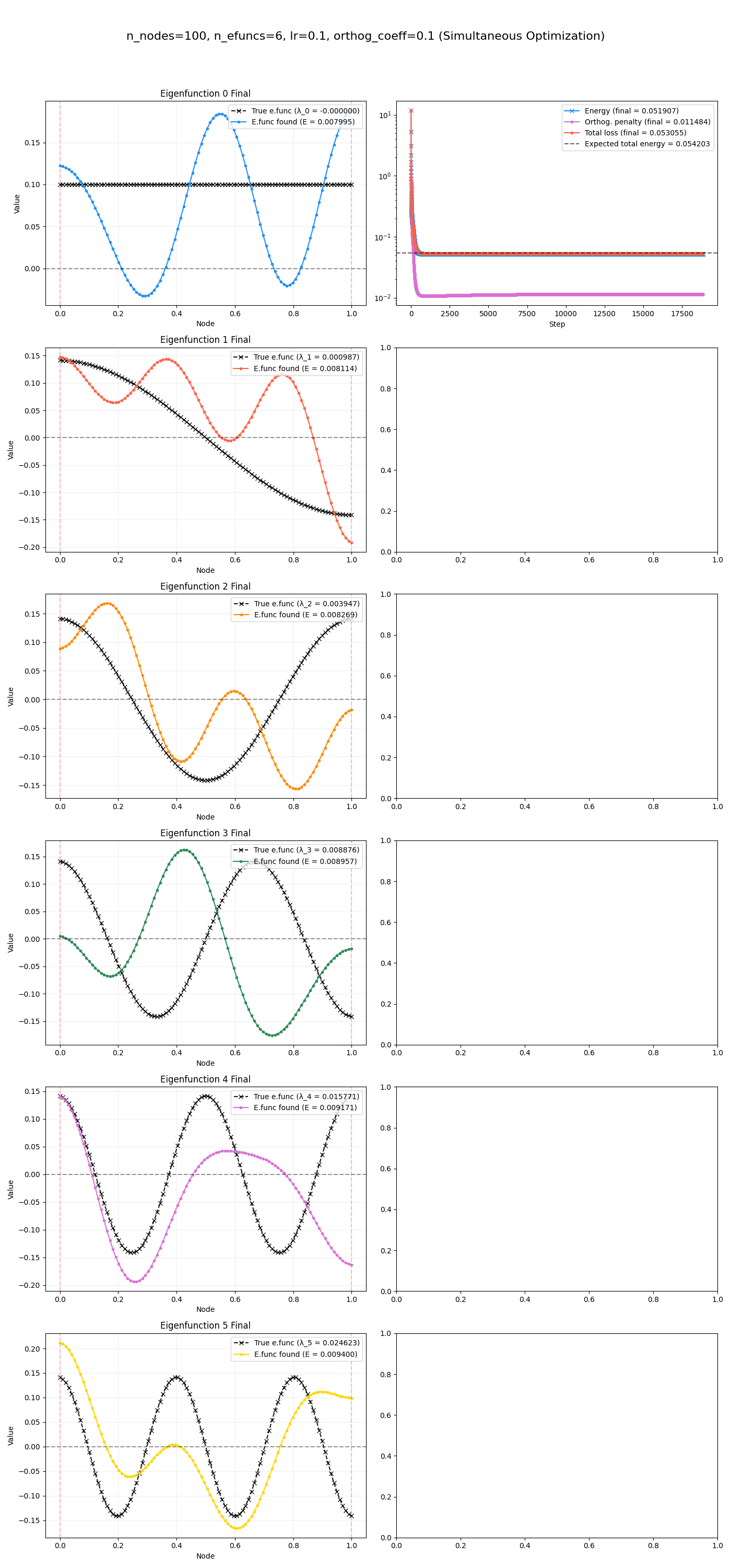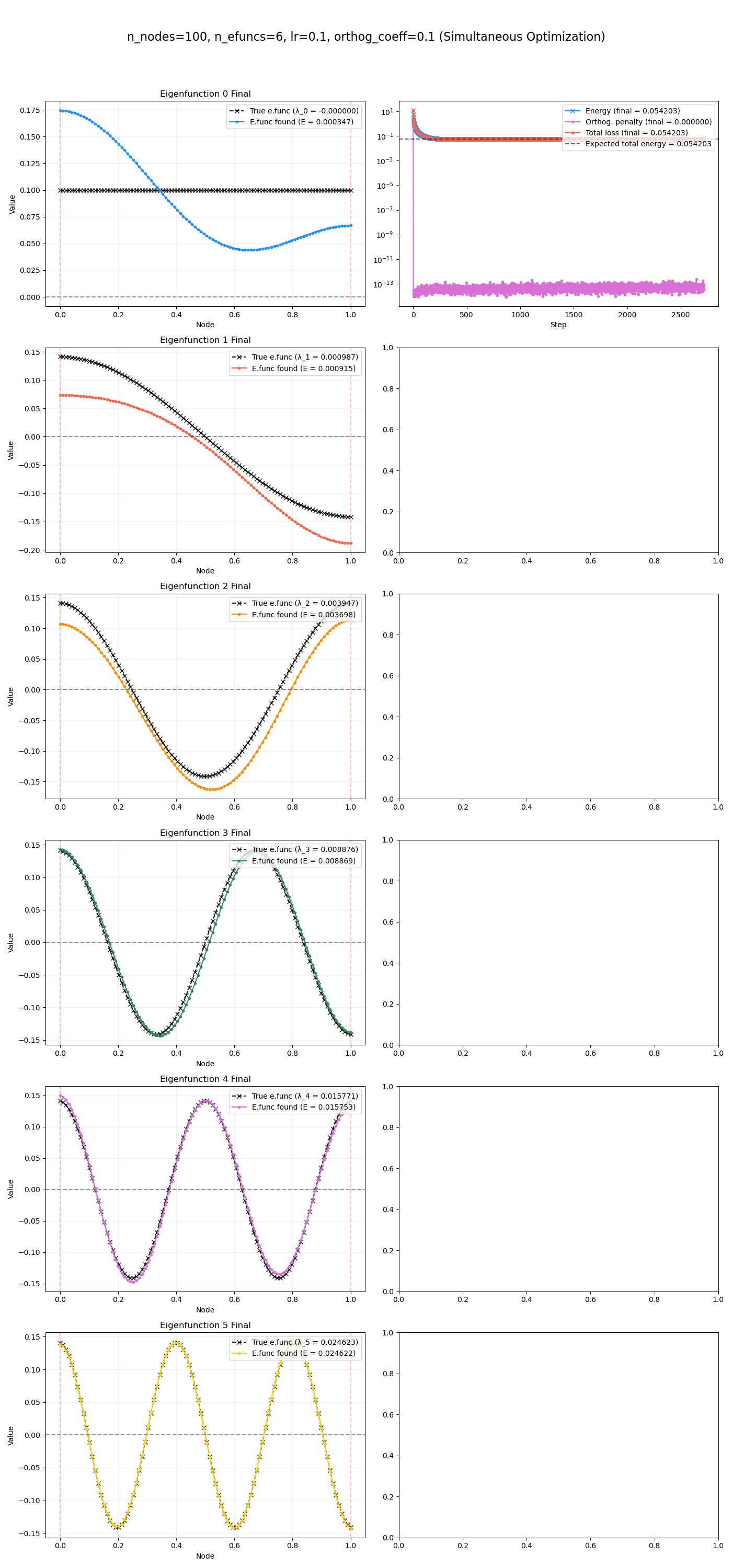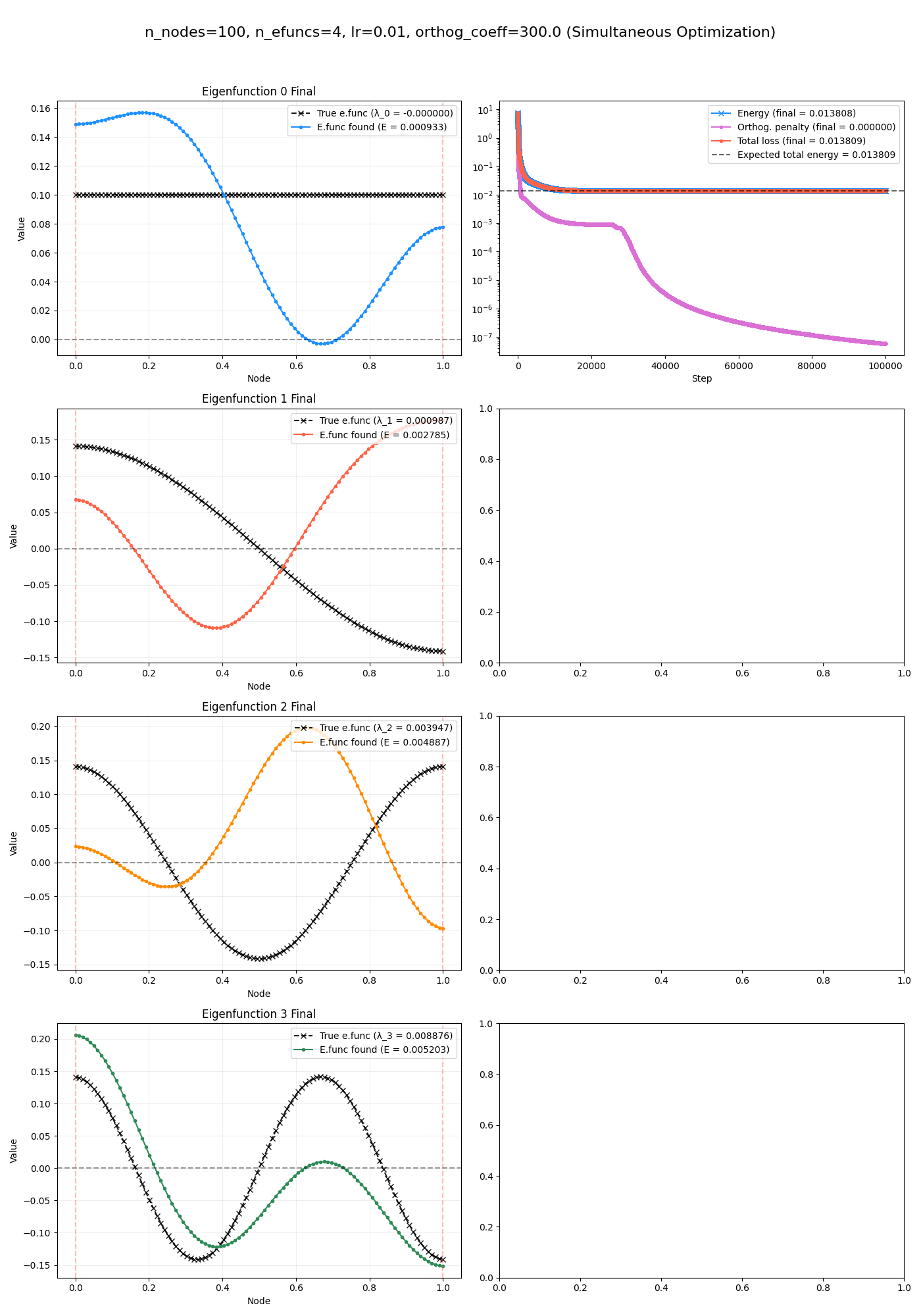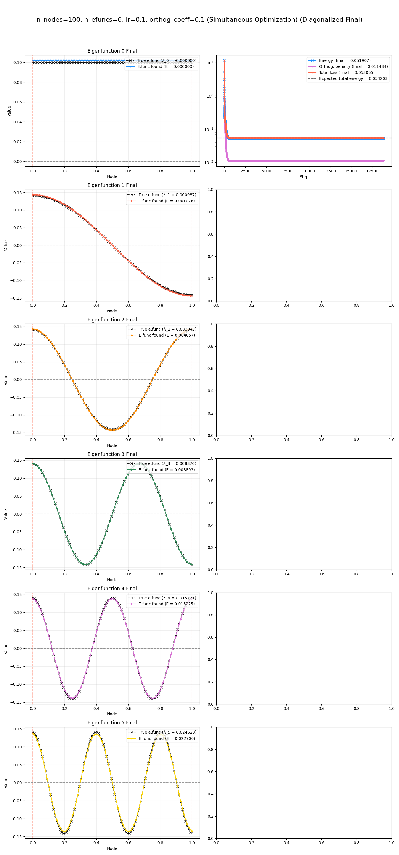In the left column are the optimized eigenfunctions (in color) and the true eigenfunctions (black); you can see they’re basically exact. The legend also shows the spring energy for each of them. The right column shows the loss terms for each eigenfunction’s optimization; I have it stop when the loss hasn’t decreased for some steps.