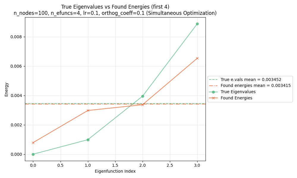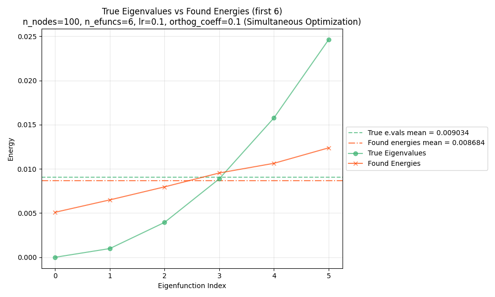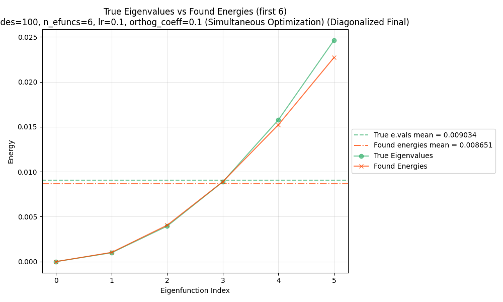 you can see that they’re kind of working, but have some errors. In fact, they seem to work better for the higher energy eigenfunctions, which I wouldn’t have predicted. But I think this makes sense – a slight error in them results in a higher relative error, compared to the smaller energy eigenfunctions, which actually have a tiny energy error even when they’re somewhat far off.