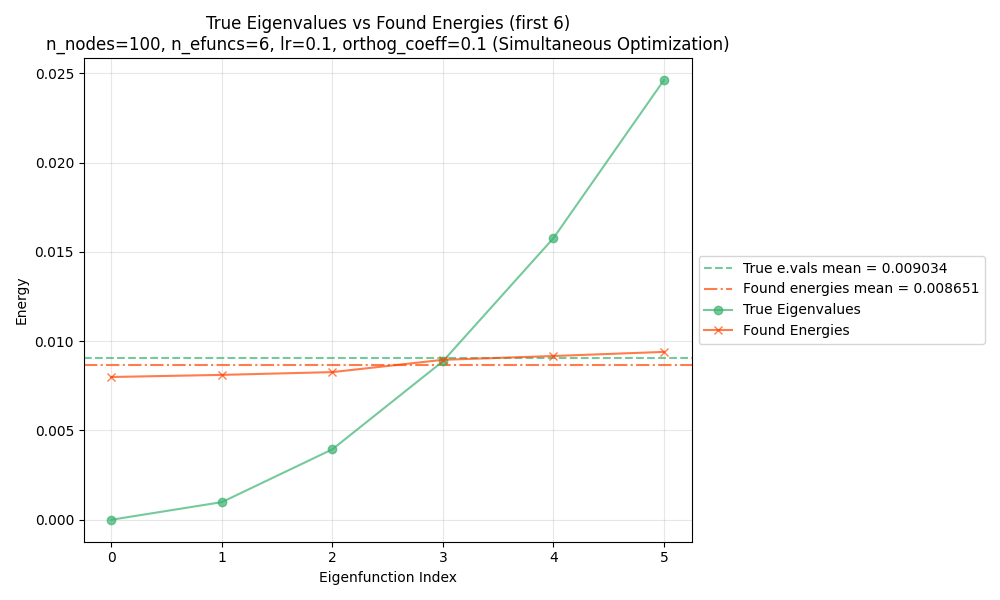 \[J(F) = E(F) + \beta \cdot \|F^\intercal F\|^2\]Note that because we’re finding all the eigenfunctions at the same time, there are no previous eigenfunctions to be orthogonal to; they all have to learn to be orthogonal to each other at the same time, so the $V^\intercal f$ term becomes $F^\intercal F$. As before, after every gradient step, I normalized each of the columns of $F$ separately.